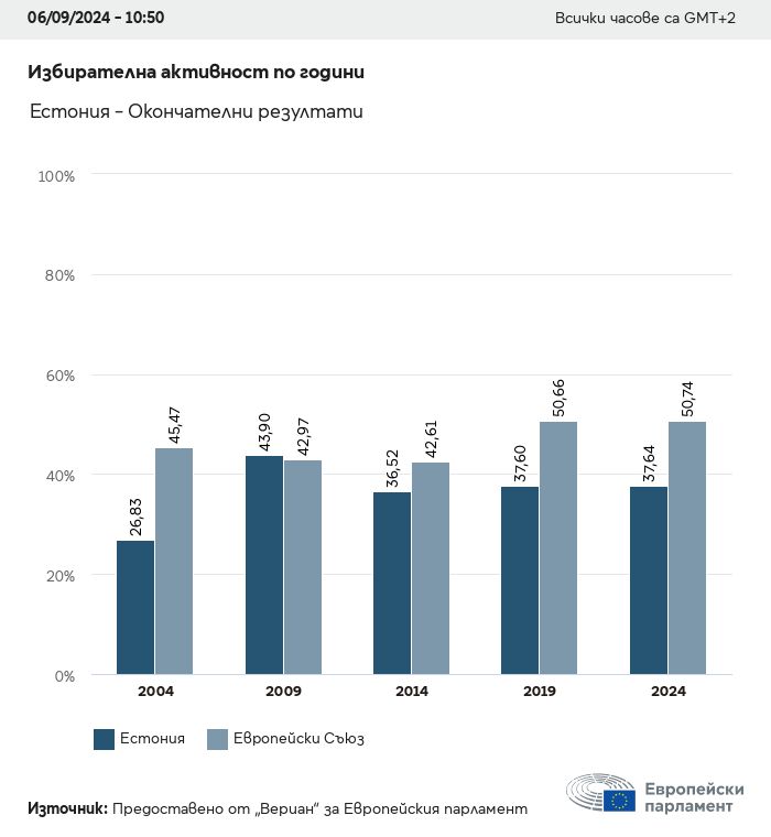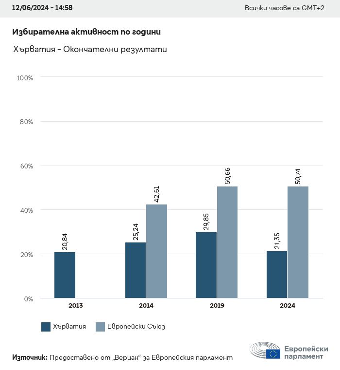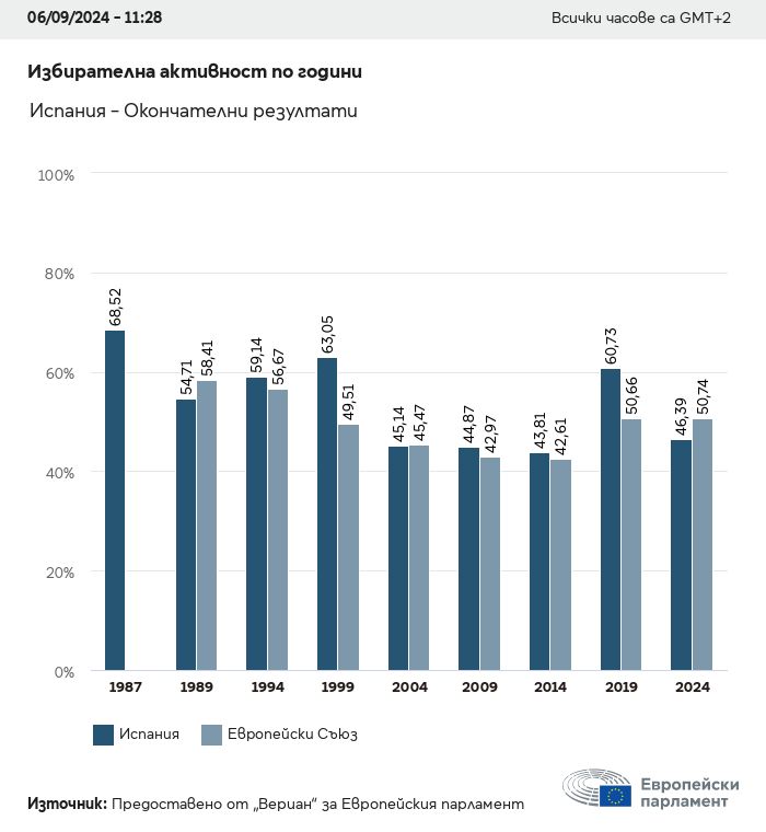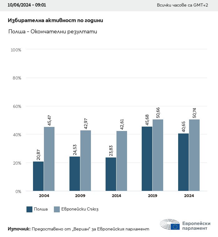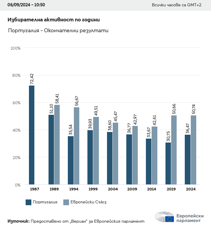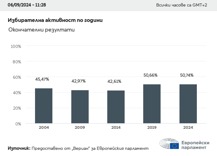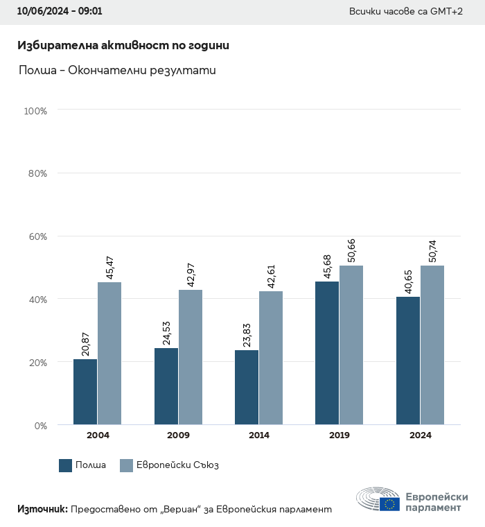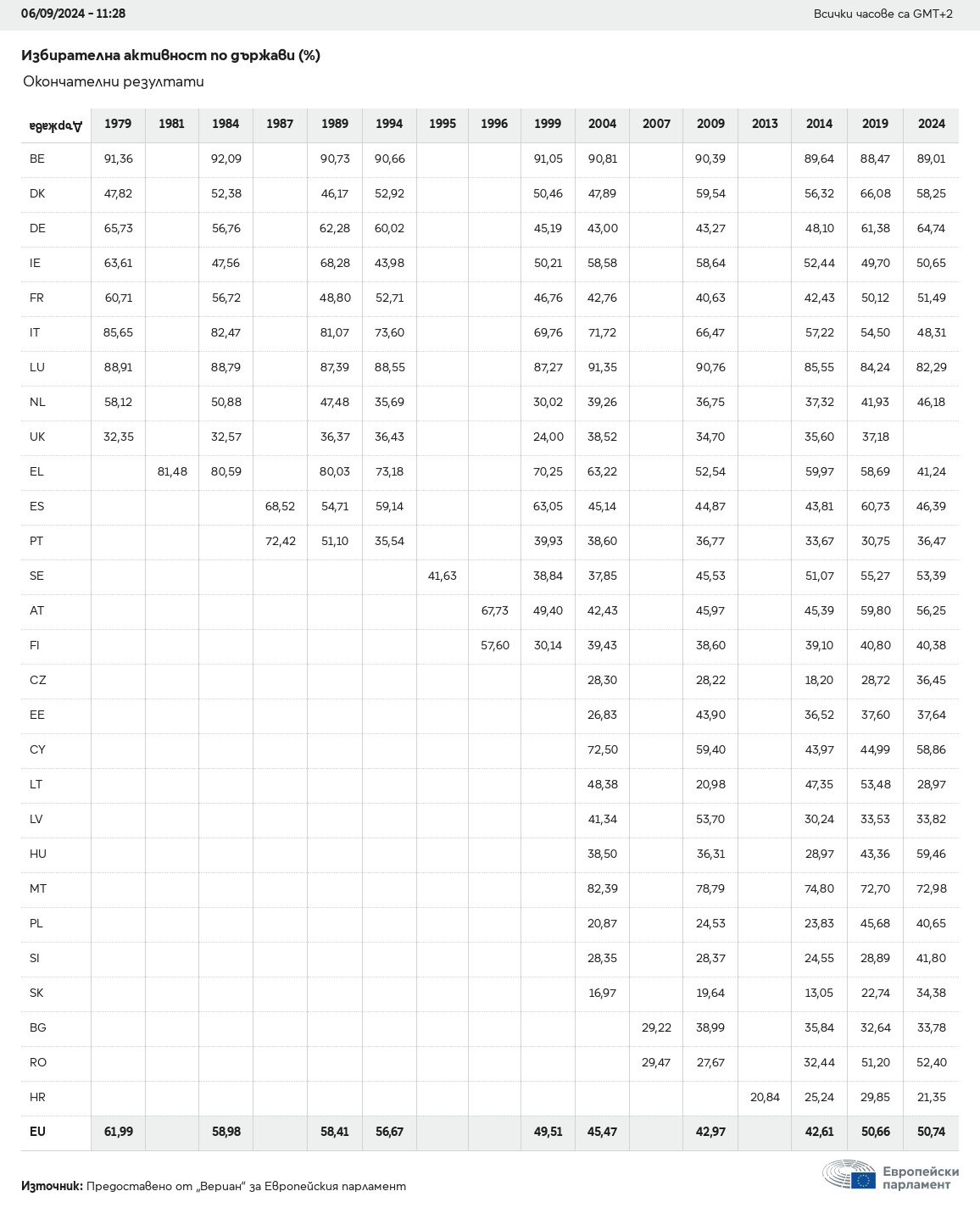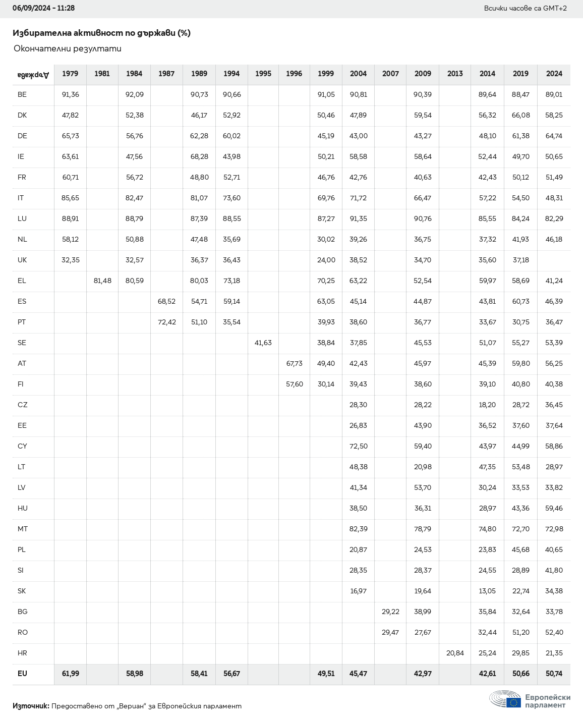 Изборните резултати за всички европейски избори от 1979 г. насам са достъпни по-долу в различни формати за изтегляне. Обърнете внимание, че наличните за изтегляне файлове се предоставят заедно с прикачен към тях цифров подпис. Тези подписи могат да бъдат валидирани с помощта на това удостоверение, което на свой ред може да бъде потвърдено със следната удостоверителна верига . Данни за европейските избори от 2024 г. json Общи Етикети (38 Ko) - Подпис Избирателна активност (32 Ko) - Подпис Данни за съотношение между половете (7 Ko) - Подпис Политически групи (40 Ko) - Подпис Национални партии (110 Ko) - Подпис Данни от европейските избори (1 Ko) - Подпис Изборни резултати be (7 Ko) - Подпис fbe (4 Ko) - Подпис gbe (2 Ko) - Подпис wbe (3 Ko) - Подпис bg (5 Ko) - Подпис cz (7 Ko) - Подпис dk (5 Ko) - Подпис de (8 Ko) - Подпис ee (4 Ko) - Подпис ie (5 Ko) - Подпис el (5 Ko) - Подпис es (7 Ko) - Подпис fr (8 Ko) - Подпис hr (3 Ko) - Подпис it (6 Ko) - Подпис cy (3 Ko) - Подпис lv (5 Ko) - Подпис lt (5 Ko) - Подпис lu (4 Ko) - Подпис hu (5 Ko) - Подпис mt (2 Ko) - Подпис nl (6 Ko) - Подпис at (3 Ko) - Подпис pl (7 Ko) - Подпис pt (5 Ko) - Подпис ro (5 Ko) - Подпис si (4 Ko) - Подпис sk (5 Ko) - Подпис fi (4 Ko) - Подпис se (4 Ko) - Подпис xml Общи Етикети (63 Ko) - Подпис Избирателна активност (40 Ko) - Подпис Данни за съотношение между половете (10 Ko) - Подпис Политически групи (64 Ko) - Подпис Национални партии (123 Ko) - Подпис Данни от европейските избори (2 Ko) - Подпис Изборни резултати be (10 Ko) - Подпис fbe (6 Ko) - Подпис gbe (3 Ko) - Подпис wbe (5 Ko) - Подпис bg (7 Ko) - Подпис cz (10 Ko) - Подпис dk (7 Ko) - Подпис de (11 Ko) - Подпис ee (6 Ko) - Подпис ie (7 Ko) - Подпис el (7 Ko) - Подпис es (11 Ko) - Подпис fr (12 Ko) - Подпис hr (5 Ko) - Подпис it (9 Ko) - Подпис cy (5 Ko) - Подпис lv (7 Ko) - Подпис lt (7 Ko) - Подпис lu (6 Ko) - Подпис hu (7 Ko) - Подпис mt (3 Ko) - Подпис nl (9 Ko) - Подпис at (5 Ko) - Подпис pl (10 Ko) - Подпис pt (7 Ko) - Подпис ro (8 Ko) - Подпис si (5 Ko) - Подпис sk (7 Ko) - Подпис fi (6 Ko) - Подпис se (6 Ko) - Подпис csv Избирателна активност Избирателна активност в ЕС (1 Ko) - Подпис Избирателна активност по държави (5 Ko) - Подпис Етикети (15 Ko) - Подпис Данни за съотношение между половете Съотношение между половете в ЕС (1 Ko) - Подпис Съотношение между мъжете и жените по държави (2 Ko) - Подпис Политически групи (16 Ko) - Подпис Национални партии (27 Ko) - Подпис Резултати по национални партии be (1 Ko) - Подпис fbe (1 Ko) - Подпис gbe (1 Ko) - Подпис wbe (1 Ko) - Подпис bg (1 Ko) - Подпис cz (1 Ko) - Подпис dk (1 Ko) - Подпис de (1 Ko) - Подпис ee (1 Ko) - Подпис ie (1 Ko) - Подпис el (1 Ko) - Подпис es (1 Ko) - Подпис fr (1 Ko) - Подпис hr (1 Ko) - Подпис it (1 Ko) - Подпис cy (1 Ko) - Подпис lv (1 Ko) - Подпис lt (1 Ko) - Подпис lu (1 Ko) - Подпис hu (1 Ko) - Подпис mt (1 Ko) - Подпис nl (1 Ko) - Подпис at (1 Ko) - Подпис pl (1 Ko) - Подпис pt (1 Ko) - Подпис ro (1 Ko) - Подпис si (1 Ko) - Подпис sk (1 Ko) - Подпис fi (1 Ko) - Подпис se (1 Ko) - Подпис Резултати по политически групи EU (1 Ko) - Подпис be (1 Ko) - Подпис fbe (1 Ko) - Подпис gbe (1 Ko) - Подпис wbe (1 Ko) - Подпис bg (1 Ko) - Подпис cz (1 Ko) - Подпис dk (1 Ko) - Подпис de (1 Ko) - Подпис ee (1 Ko) - Подпис ie (1 Ko) - Подпис el (1 Ko) - Подпис es (1 Ko) - Подпис fr (1 Ko) - Подпис hr (1 Ko) - Подпис it (1 Ko) - Подпис cy (1 Ko) - Подпис lv (1 Ko) - Подпис lt (1 Ko) - Подпис lu (1 Ko) - Подпис hu (1 Ko) - Подпис mt (1 Ko) - Подпис nl (1 Ko) - Подпис at (1 Ko) - Подпис pl (1 Ko) - Подпис pt (1 Ko) - Подпис ro (1 Ko) - Подпис si (1 Ko) - Подпис sk (1 Ko) - Подпис fi (1 Ko) - Подпис se (1 Ko) - Подпис Разбивка по национални партии и политически групи be (1 Ko) - Подпис fbe (1 Ko) - Подпис gbe (1 Ko) - Подпис wbe (1 Ko) - Подпис bg (1 Ko) - Подпис cz (1 Ko) - Подпис dk (1 Ko) - Подпис de (1 Ko) - Подпис ee (1 Ko) - Подпис ie (1 Ko) - Подпис el (1 Ko) - Подпис es (1 Ko) - Подпис fr (1 Ko) - Подпис hr (1 Ko) - Подпис it (1 Ko) - Подпис cy (1 Ko) - Подпис lv (1 Ko) - Подпис lt (1 Ko) - Подпис lu (1 Ko) - Подпис hu (1 Ko) - Подпис mt (1 Ko) - Под