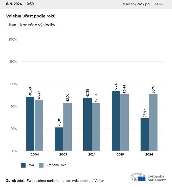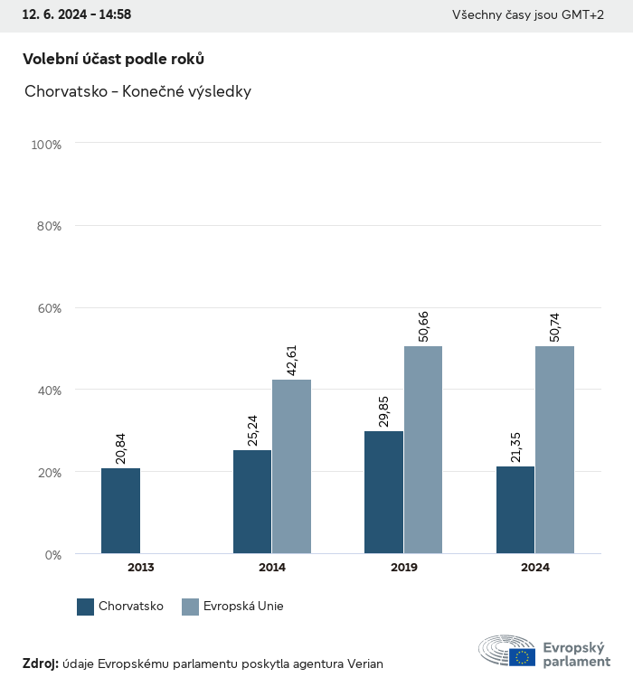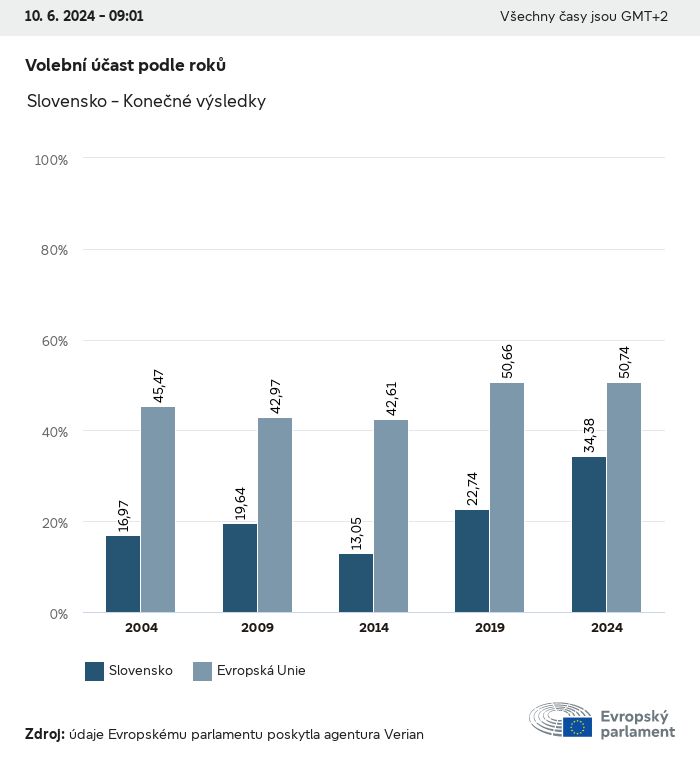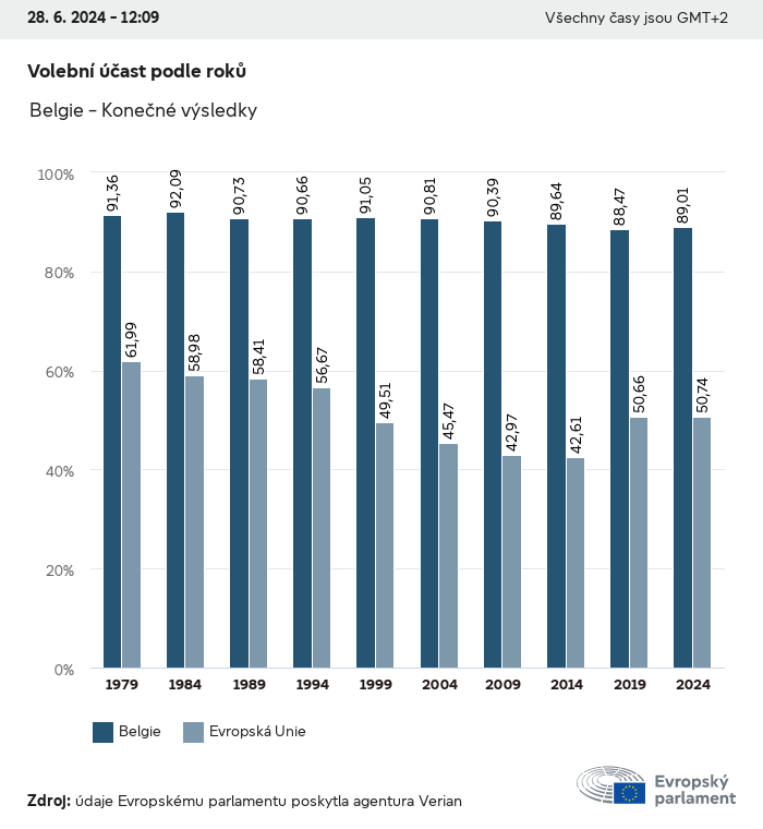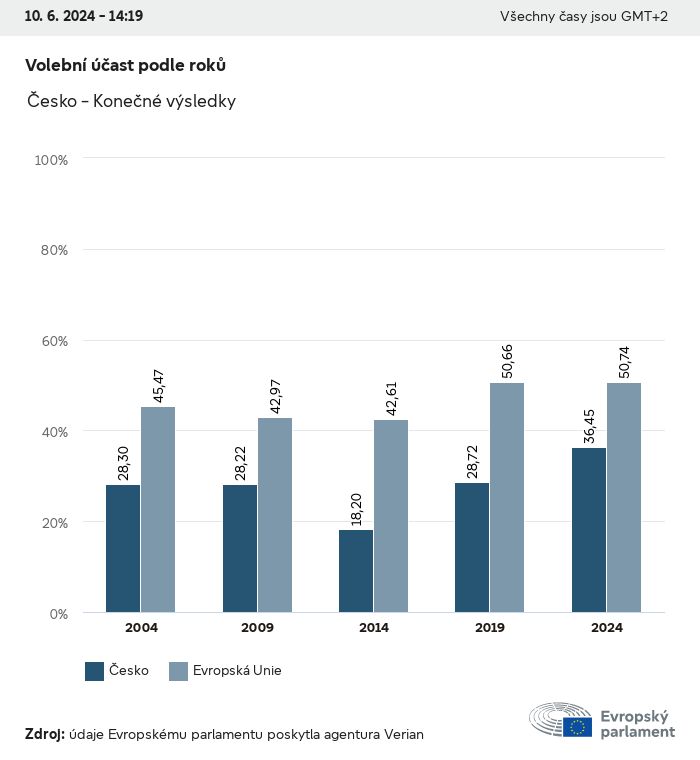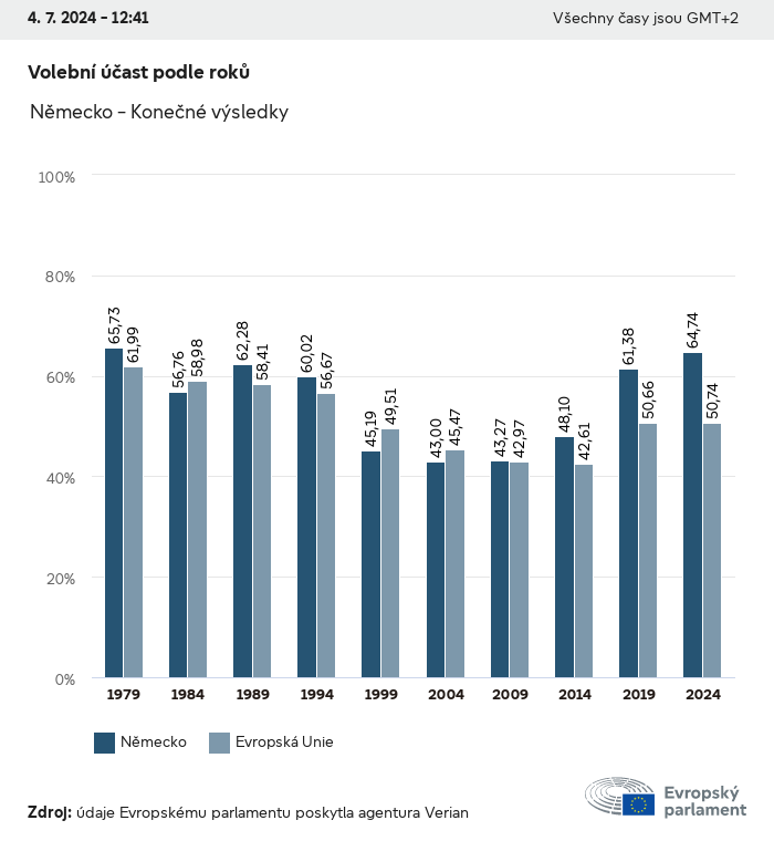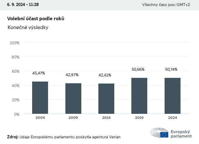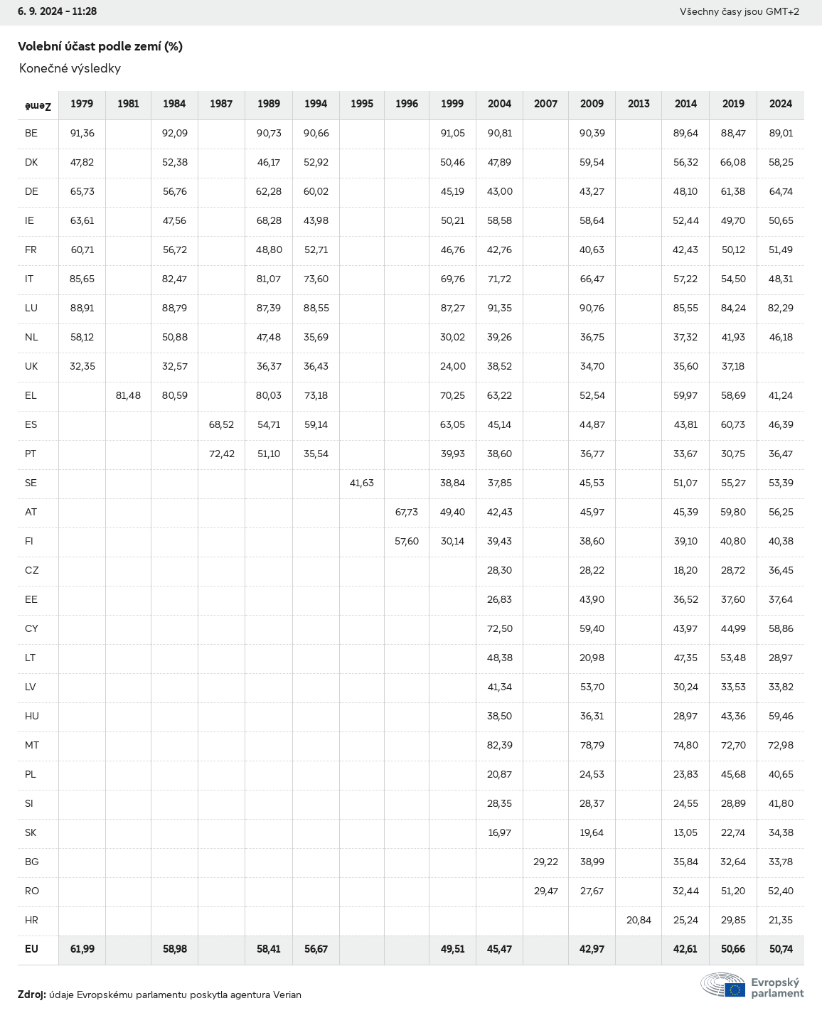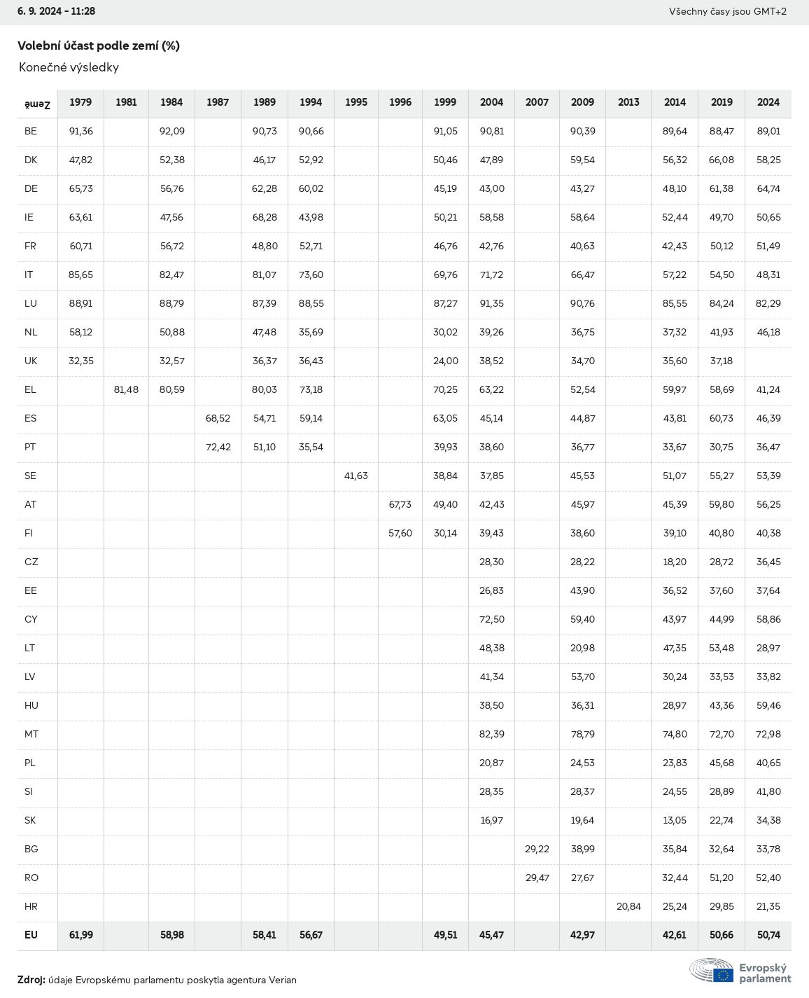 Volební údaje ze všech evropských voleb od roku 1979 jsou k dispozici níže v různých formátech ke stažení. Upozorňujeme, že soubory, které jsou k dispozici ke stažení, jsou poskytovány spolu s digitálním podpisem. Tyto podpisy lze ověřit s pomocí tohoto certifikátu, který lze následovně ověřit s pomocí následujícího řetězce certifikátů. Údaje o evropských volbách 2024. json Společné Štítky (38 Ko) - Podpis Volební účast (32 Ko) - Podpis Údaje o zastoupení mužů a žen (7 Ko) - Podpis Politické skupiny (40 Ko) - Podpis Vnitrostátní strany (110 Ko) - Podpis Údaje o evropských volbách (1 Ko) - Podpis Výsledky voleb be (7 Ko) - Podpis fbe (4 Ko) - Podpis gbe (2 Ko) - Podpis wbe (3 Ko) - Podpis bg (5 Ko) - Podpis cz (7 Ko) - Podpis dk (5 Ko) - Podpis de (8 Ko) - Podpis ee (4 Ko) - Podpis ie (5 Ko) - Podpis el (5 Ko) - Podpis es (7 Ko) - Podpis fr (8 Ko) - Podpis hr (3 Ko) - Podpis it (6 Ko) - Podpis cy (3 Ko) - Podpis lv (5 Ko) - Podpis lt (5 Ko) - Podpis lu (4 Ko) - Podpis hu (5 Ko) - Podpis mt (2 Ko) - Podpis nl (6 Ko) - Podpis at (3 Ko) - Podpis pl (7 Ko) - Podpis pt (5 Ko) - Podpis ro (5 Ko) - Podpis si (4 Ko) - Podpis sk (5 Ko) - Podpis fi (4 Ko) - Podpis se (4 Ko) - Podpis xml Společné Štítky (63 Ko) - Podpis Volební účast (40 Ko) - Podpis Údaje o zastoupení mužů a žen (10 Ko) - Podpis Politické skupiny (64 Ko) - Podpis Vnitrostátní strany (123 Ko) - Podpis Údaje o evropských volbách (2 Ko) - Podpis Výsledky voleb be (10 Ko) - Podpis fbe (6 Ko) - Podpis gbe (3 Ko) - Podpis wbe (5 Ko) - Podpis bg (7 Ko) - Podpis cz (10 Ko) - Podpis dk (7 Ko) - Podpis de (11 Ko) - Podpis ee (6 Ko) - Podpis ie (7 Ko) - Podpis el (7 Ko) - Podpis es (11 Ko) - Podpis fr (12 Ko) - Podpis hr (5 Ko) - Podpis it (9 Ko) - Podpis cy (5 Ko) - Podpis lv (7 Ko) - Podpis lt (7 Ko) - Podpis lu (6 Ko) - Podpis hu (7 Ko) - Podpis mt (3 Ko) - Podpis nl (9 Ko) - Podpis at (5 Ko) - Podpis pl (10 Ko) - Podpis pt (7 Ko) - Podpis ro (8 Ko) - Podpis si (5 Ko) - Podpis sk (7 Ko) - Podpis fi (6 Ko) - Podpis se (6 Ko) - Podpis csv Volební účast Volební účast EU (1 Ko) - Podpis Volební účast podle zemí (5 Ko) - Podpis Štítky (15 Ko) - Podpis Údaje o zastoupení mužů a žen Zastoupení mužů a žen EU (1 Ko) - Podpis Zastoupení mužů a žen podle zemí (2 Ko) - Podpis Politické skupiny (16 Ko) - Podpis Vnitrostátní strany (27 Ko) - Podpis Výsledky podle vnitrostátních stran be (1 Ko) - Podpis fbe (1 Ko) - Podpis gbe (1 Ko) - Podpis wbe (1 Ko) - Podpis bg (1 Ko) - Podpis cz (1 Ko) - Podpis dk (1 Ko) - Podpis de (1 Ko) - Podpis ee (1 Ko) - Podpis ie (1 Ko) - Podpis el (1 Ko) - Podpis es (1 Ko) - Podpis fr (1 Ko) - Podpis hr (1 Ko) - Podpis it (1 Ko) - Podpis cy (1 Ko) - Podpis lv (1 Ko) - Podpis lt (1 Ko) - Podpis lu (1 Ko) - Podpis hu (1 Ko) - Podpis mt (1 Ko) - Podpis nl (1 Ko) - Podpis at (1 Ko) - Podpis pl (1 Ko) - Podpis pt (1 Ko) - Podpis ro (1 Ko) - Podpis si (1 Ko) - Podpis sk (1 Ko) - Podpis fi (1 Ko) - Podpis se (1 Ko) - Podpis Výsledky podle politických skupin EU (1 Ko) - Podpis be (1 Ko) - Podpis fbe (1 Ko) - Podpis gbe (1 Ko) - Podpis wbe (1 Ko) - Podpis bg (1 Ko) - Podpis cz (1 Ko) - Podpis dk (1 Ko) - Podpis de (1 Ko) - Podpis ee (1 Ko) - Podpis ie (1 Ko) - Podpis el (1 Ko) - Podpis es (1 Ko) - Podpis fr (1 Ko) - Podpis hr (1 Ko) - Podpis it (1 Ko) - Podpis cy (1 Ko) - Podpis lv (1 Ko) - Podpis lt (1 Ko) - Podpis lu (1 Ko) - Podpis hu (1 Ko) - Podpis mt (1 Ko) - Podpis nl (1 Ko) - Podpis at (1 Ko) - Podpis pl (1 Ko) - Podpis pt (1 Ko) - Podpis ro (1 Ko) - Podpis si (1 Ko) - Podpis sk (1 Ko) - Podpis fi (1 Ko) - Podpis se (1 Ko) - Podpis Rozdělení podle vnitrostátních stran a politických skupin be (1 Ko) - Podpis fbe (1 Ko) - Podpis gbe (1 Ko) - Podpis wbe (1 Ko) - Podpis bg (1 Ko) - Podpis cz (1 Ko) - Podpis dk (1 Ko) - Podpis de (1 Ko) - Podpis ee (1 Ko) - Podpis ie (1 Ko) - Podpis el (1 Ko) - Podpis es (1 Ko) - Podpis fr (1 Ko) - Podpis hr (1 Ko) - Podpis it (1 Ko) - Podpis cy (1 Ko) - Podpis lv (1 Ko) - Podpis lt (1 Ko) - Podpis lu (1 Ko) - Podpis hu (1 Ko) - Podpis mt (1 Ko) - Podpis nl (1 Ko) - Podpis at (1 Ko) - Podpis pl (1 Ko) - Podpis pt (1 Ko) - Podpis ro (1 Ko) - Podpis si (1 Ko) - Podpis sk (1 Ko) - Podpis fi (1 Ko) - Podpis se (1 Ko) - Podpis jpg Volební účast Volební účast podle roků (~30 Ko) Volební účast podle zemí (~140 Ko) Zastoupení mužů a žen v Evropském parlamentu Zastoupení mužů a žen v EP podle zemí Mapa (~130 Ko) Pruhový graf (~80 Ko) Zastoupení mužů a žen v EP podle roků (~50 Ko) Výsledky voleb Evropské údaje Polokruh (~110 Ko) Evropský parlament (~250 Ko) Vnitrostátní údaje BE Výsledky podle vnitrostátních stran (~90 Ko) Počet křesel podle politických skupin (~70 Ko) Rozdělení podle vnitrostátních stran a politických skupin (~180 Ko) Zastoupení mužů a žen v EP podle roků (~50 Ko) Volební účast podle roků (~50 Ko) FBE Výsledky podle vnitrostátních stran (~90 Ko) Počet křesel podle politických skupin (~70 Ko) Rozdělení podle vnitrostátních stran a politických skupin (~180 Ko) GBE Výsledky podle vnitrostátních stran (~90 Ko) Počet křesel podle politických skupin (~70 Ko) Rozdělení podle vnitrostátních stran a politických skupin (~180 Ko) WBE Výsledky podle vnitrostátních stran (~90 Ko) Počet křesel podle politických skupin (~70 Ko) Rozdělení podle vnitrostátních stran a politických skupin (~180 Ko) BG Výsledky podle vnitrostátních stran (~90 Ko) Počet křesel podle politických skupin (~70 Ko) Rozdělení podle vnitrostátních stran a politických skupin (~180 Ko) Zastoupení mužů a žen v EP podle roků (~50 Ko) Volební účast podle roků (~50 Ko) CZ Výsledky podle vnitrostátních stran (~90 Ko) Počet křesel podle politických skupin (~70 Ko) Rozdělení podle vnitrostátních stran a politických skupin (~180 Ko) Zastoupení mužů a žen v EP podle roků (~50 Ko) Volební účast podle roků (