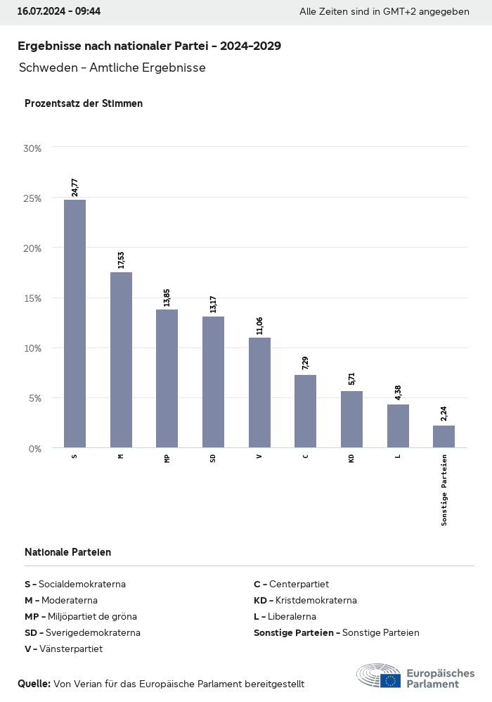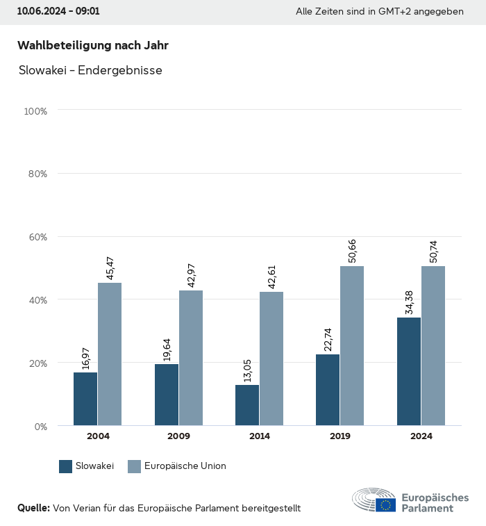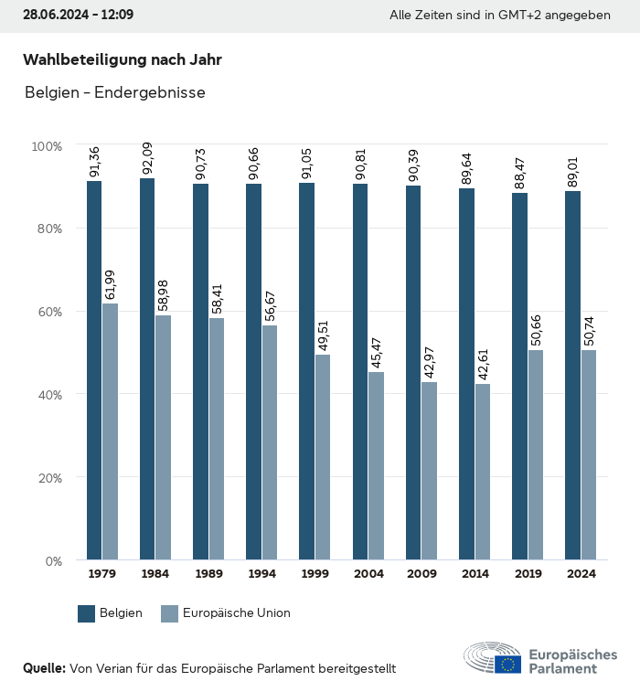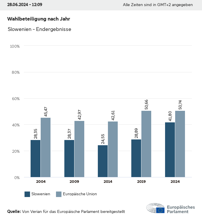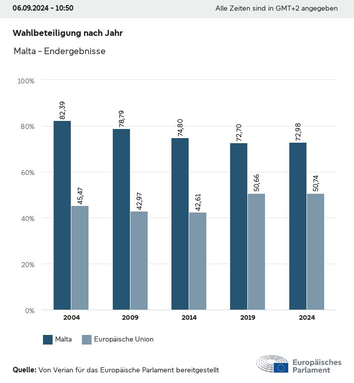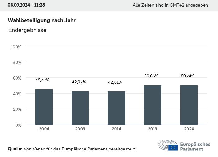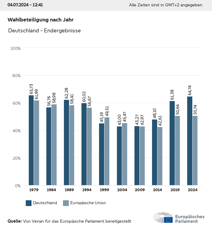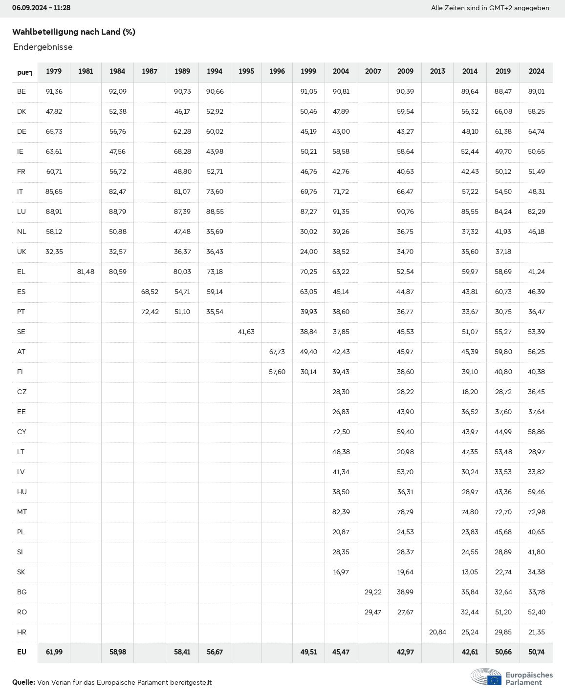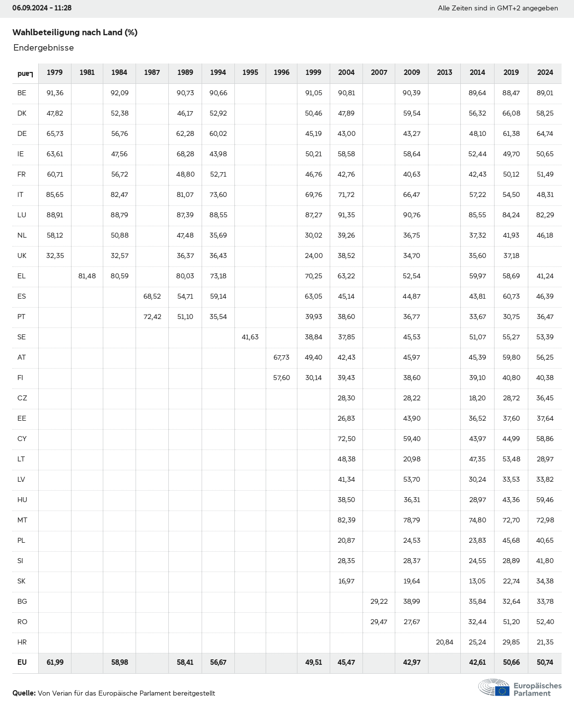 Wahldaten zu jeder Europawahl seit 1979 sind hier in verschiedenen Formaten zum Herunterladen verfügbar. Hinweis: Die zum Herunterladen bereitgestellten Dateien sind mit einer digitalen Signatur versehen. Diese Signaturen können anhand dieses Zertifikats validiert werden, das seinerseits anhand der folgenden Zertifikatskette validiert werden kann. Daten zur Europawahl 2024 json Allgemein Labels (38 Ko) - Signatur Wahlbeteiligung (32 Ko) - Signatur Daten zum Geschlechterverhältnis (7 Ko) - Signatur Fraktionen (40 Ko) - Signatur Nationale Parteien (110 Ko) - Signatur Daten zur Europawahl (1 Ko) - Signatur Wahlergebnisse be (7 Ko) - Signatur fbe (4 Ko) - Signatur gbe (2 Ko) - Signatur wbe (3 Ko) - Signatur bg (5 Ko) - Signatur cz (7 Ko) - Signatur dk (5 Ko) - Signatur de (8 Ko) - Signatur ee (4 Ko) - Signatur ie (5 Ko) - Signatur el (5 Ko) - Signatur es (7 Ko) - Signatur fr (8 Ko) - Signatur hr (3 Ko) - Signatur it (6 Ko) - Signatur cy (3 Ko) - Signatur lv (5 Ko) - Signatur lt (5 Ko) - Signatur lu (4 Ko) - Signatur hu (5 Ko) - Signatur mt (2 Ko) - Signatur nl (6 Ko) - Signatur at (3 Ko) - Signatur pl (7 Ko) - Signatur pt (5 Ko) - Signatur ro (5 Ko) - Signatur si (4 Ko) - Signatur sk (5 Ko) - Signatur fi (4 Ko) - Signatur se (4 Ko) - Signatur xml Allgemein Labels (63 Ko) - Signatur Wahlbeteiligung (40 Ko) - Signatur Daten zum Geschlechterverhältnis (10 Ko) - Signatur Fraktionen (64 Ko) - Signatur Nationale Parteien (123 Ko) - Signatur Daten zur Europawahl (2 Ko) - Signatur Wahlergebnisse be (10 Ko) - Signatur fbe (6 Ko) - Signatur gbe (3 Ko) - Signatur wbe (5 Ko) - Signatur bg (7 Ko) - Signatur cz (10 Ko) - Signatur dk (7 Ko) - Signatur de (11 Ko) - Signatur ee (6 Ko) - Signatur ie (7 Ko) - Signatur el (7 Ko) - Signatur es (11 Ko) - Signatur fr (12 Ko) - Signatur hr (5 Ko) - Signatur it (9 Ko) - Signatur cy (5 Ko) - Signatur lv (7 Ko) - Signatur lt (7 Ko) - Signatur lu (6 Ko) - Signatur hu (7 Ko) - Signatur mt (3 Ko) - Signatur nl (9 Ko) - Signatur at (5 Ko) - Signatur pl (10 Ko) - Signatur pt (7 Ko) - Signatur ro (8 Ko) - Signatur si (5 Ko) - Signatur sk (7 Ko) - Signatur fi (6 Ko) - Signatur se (6 Ko) - Signatur csv Wahlbeteiligung Wahlbeteiligung in der Union (1 Ko) - Signatur Wahlbeteiligung nach Land (5 Ko) - Signatur Labels (15 Ko) - Signatur Daten zum Geschlechterverhältnis Geschlechterverhältnis unionsweit (1 Ko) - Signatur Geschlechterverhältnis nach Land (2 Ko) - Signatur Fraktionen (16 Ko) - Signatur Nationale Parteien (27 Ko) - Signatur Ergebnisse nach nationaler Partei be (1 Ko) - Signatur fbe (1 Ko) - Signatur gbe (1 Ko) - Signatur wbe (1 Ko) - Signatur bg (1 Ko) - Signatur cz (1 Ko) - Signatur dk (1 Ko) - Signatur de (1 Ko) - Signatur ee (1 Ko) - Signatur ie (1 Ko) - Signatur el (1 Ko) - Signatur es (1 Ko) - Signatur fr (1 Ko) - Signatur hr (1 Ko) - Signatur it (1 Ko) - Signatur cy (1 Ko) - Signatur lv (1 Ko) - Signatur lt (1 Ko) - Signatur lu (1 Ko) - Signatur hu (1 Ko) - Signatur mt (1 Ko) - Signatur nl (1 Ko) - Signatur at (1 Ko) - Signatur pl (1 Ko) - Signatur pt (1 Ko) - Signatur ro (1 Ko) - Signatur si (1 Ko) - Signatur sk (1 Ko) - Signatur fi (1 Ko) - Signatur se (1 Ko) - Signatur Ergebnisse nach Fraktion EU (1 Ko) - Signatur be (1 Ko) - Signatur fbe (1 Ko) - Signatur gbe (1 Ko) - Signatur wbe (1 Ko) - Signatur bg (1 Ko) - Signatur cz (1 Ko) - Signatur dk (1 Ko) - Signatur de (1 Ko) - Signatur ee (1 Ko) - Signatur ie (1 Ko) - Signatur el (1 Ko) - Signatur es (1 Ko) - Signatur fr (1 Ko) - Signatur hr (1 Ko) - Signatur it (1 Ko) - Signatur cy (1 Ko) - Signatur lv (1 Ko) - Signatur lt (1 Ko) - Signatur lu (1 Ko) - Signatur hu (1 Ko) - Signatur mt (1 Ko) - Signatur nl (1 Ko) - Signatur at (1 Ko) - Signatur pl (1 Ko) - Signatur pt (1 Ko) - Signatur ro (1 Ko) - Signatur si (1 Ko) - Signatur sk (1 Ko) - Signatur fi (1 Ko) - Signatur se (1 Ko) - Signatur Aufschlüsselung nach nationalen Parteien und Fraktionen be (1 Ko) - Signatur fbe (1 Ko) - Signatur gbe (1 Ko) - Signatur wbe (1 Ko) - Signatur bg (1 Ko) - Signatur cz (1 Ko) - Signatur dk (1 Ko) - Signatur de (1 Ko) - Signatur ee (1 Ko) - Signatur ie (1 Ko) - Signatur el (1 Ko) - Signatur es (1 Ko) - Signatur fr (1 Ko) - Signatur hr (1 Ko) - Signatur it (1 Ko) - Signatur cy (1 Ko) - Signatur lv (1 Ko) - Signatur lt (1 Ko) - Signatur lu (1 Ko) - Signatur hu (1 Ko) - Signatur mt (1 Ko) - Signatur nl (1 Ko) - Signatur at (1 Ko) - Signatur pl (1 Ko) - Signatur pt (1 Ko) - Signatur ro (1 Ko) - Signatur si (1 Ko) - Signatur sk (1 Ko) - Signatur fi (1 Ko) - Signatur se (1 Ko) - Signatur jpg Wahlbeteiligung Wahlbeteiligung nach Jahr (~30 Ko) Wahlbeteiligung nach Land (~140 Ko) Geschlechterverhältnis der Mitglieder Geschlechterverhältnis der Mitglieder nach Land Karte (~130 Ko) Balkendiagramm (~80 Ko) Geschlechterverhältnis der Mitglieder nach Jahr (~50 Ko) Wahlergebnisse Unionsweite Daten Sitzverteilung (~110 Ko) Europäisches Parlament (~250 Ko) Nationale Daten BE Ergebnisse nach nationaler Partei (~90 Ko) Sitze nach Fraktion (~70 Ko) Aufschlüsselung nach nationalen Parteien und Fraktionen (~180 Ko) Geschlechterverhältnis der Mitglieder nach Jahr (~50 Ko) Wahlbeteiligung nach Jahr (~50 Ko) FBE Ergebnisse nach nationaler Partei (~90 Ko) Sitze nach Fraktion (~70 Ko) Aufschlüsselung nach nationalen Parteien und Fraktionen (~180 Ko) GBE Ergebnisse nach nationaler Partei (~90 Ko) Sitze nach Fraktion (~70 Ko) Aufschlüsselung nach nationalen Parteien und Fraktionen (~180 Ko) WBE Ergebnisse nach nationaler Partei (~90 Ko) Sitze nach Fraktion (~70 Ko) Aufschlüsselung nach nationalen Parteien und Fraktionen (~180 Ko) BG Ergebnisse nach nationaler Partei (~90 Ko) Sitze nach Fraktion (~70 Ko) Aufschlüsselung nach nationalen Parteien und Fraktionen (~180 Ko) Geschlechterverhältnis der Mitglieder nach Jahr (~50 Ko) Wahlbeteiligung nach Jahr (~50 Ko) CZ Ergebnisse nach nationaler Partei (~90 Ko) Sitze nach Fraktion (~70 Ko) Aufschlüsselung nach nationalen Parteien und Fraktionen (~180 Ko) Geschlechterverhältnis der Mitglieder nac