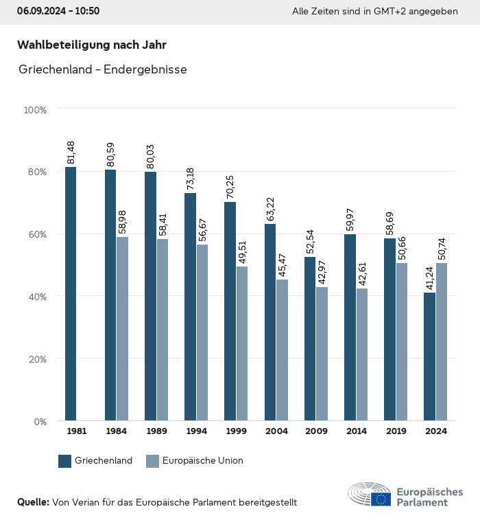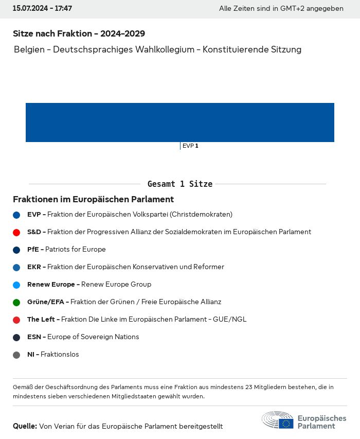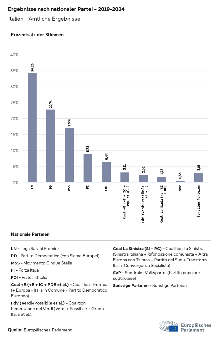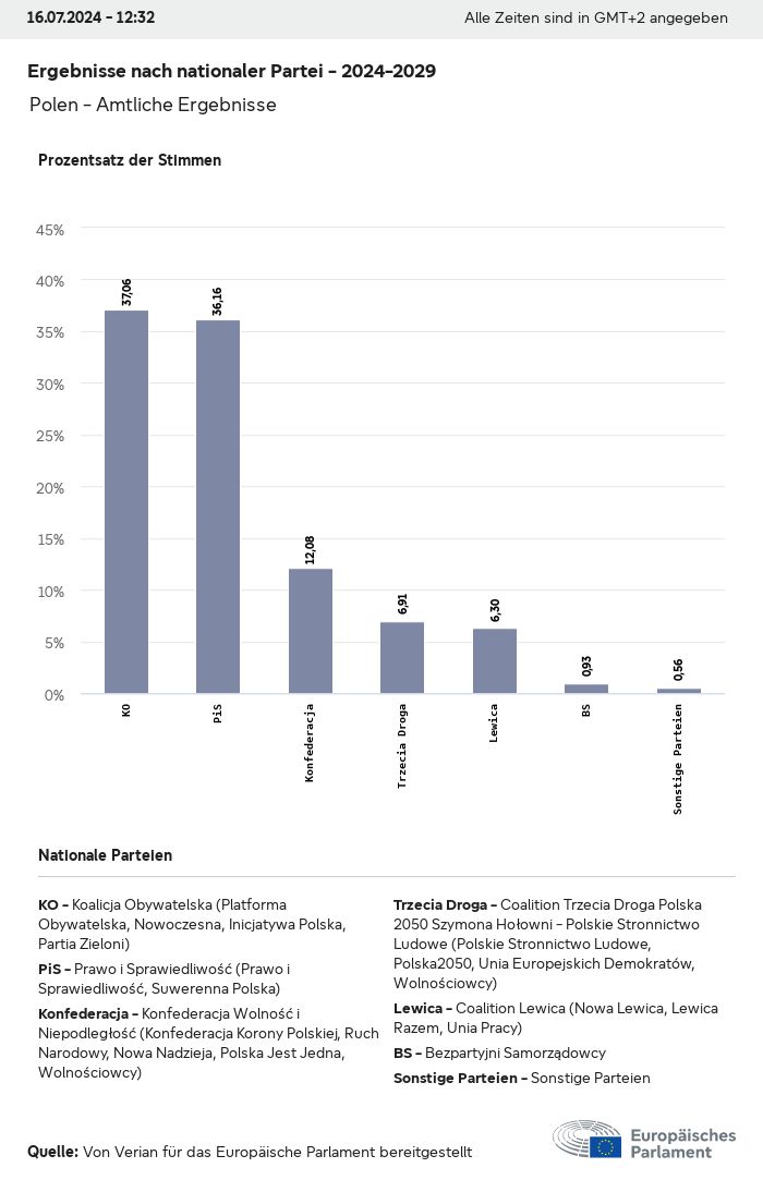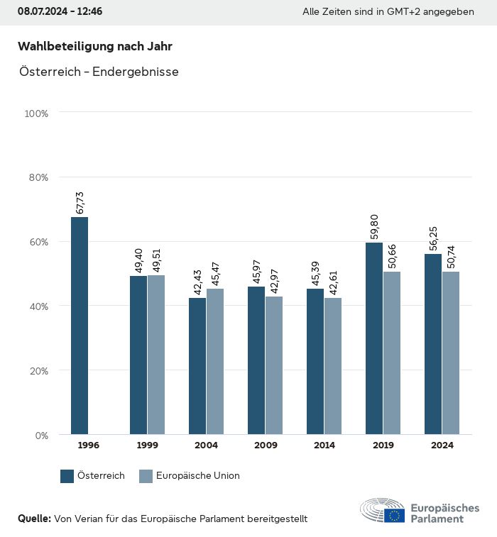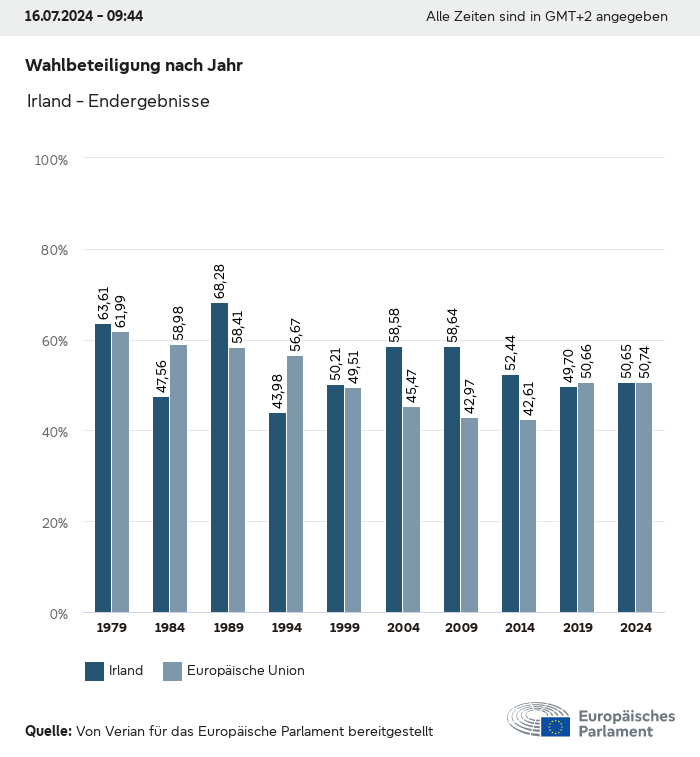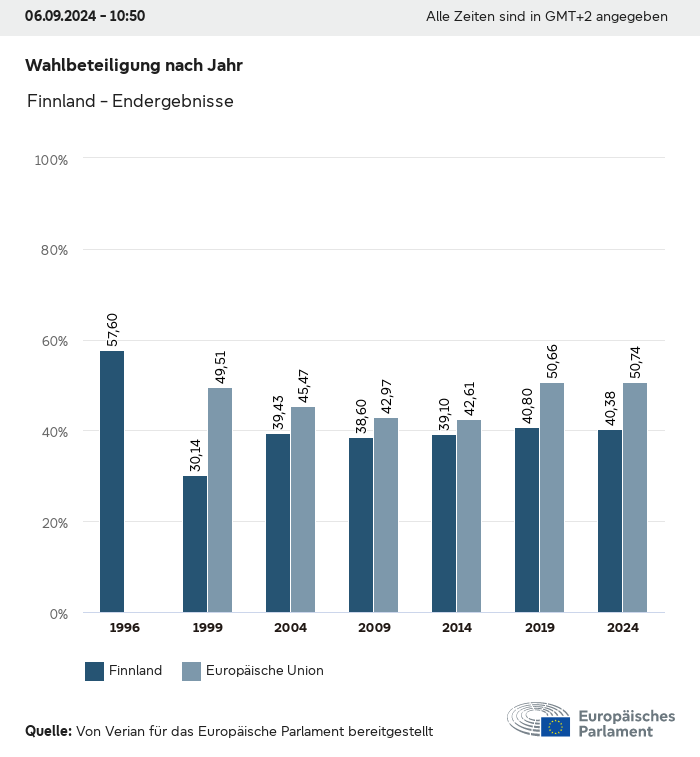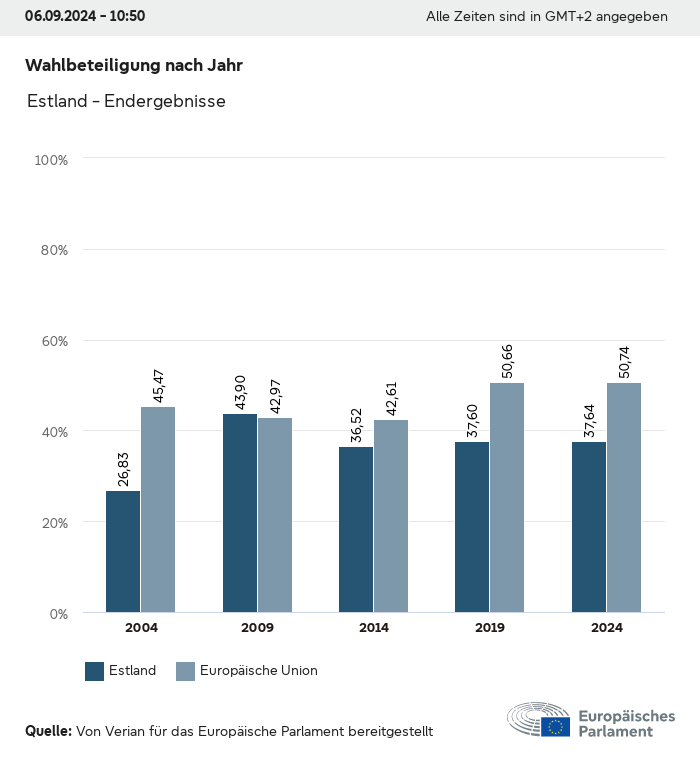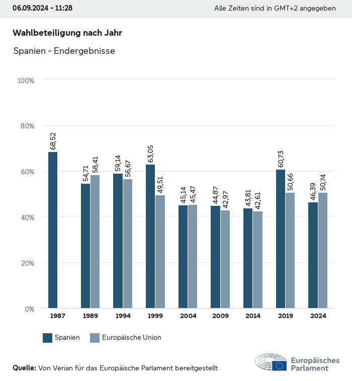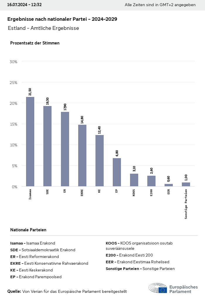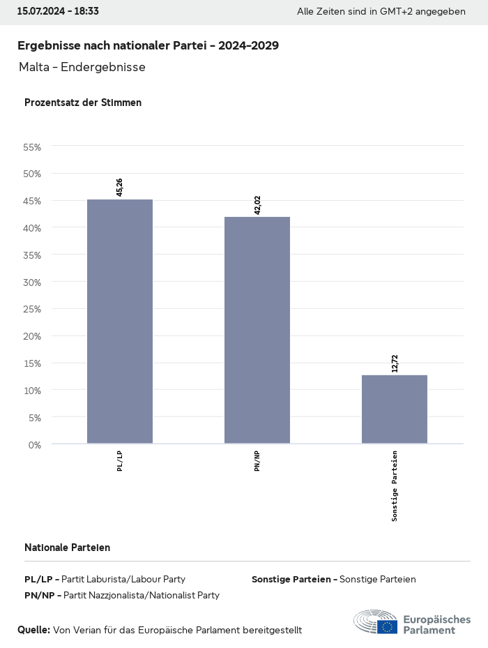 Wahldaten zu jeder Europawahl seit 1979 sind hier in verschiedenen Formaten zum Herunterladen verfügbar. Hinweis: Die zum Herunterladen bereitgestellten Dateien sind mit einer digitalen Signatur versehen. Diese Signaturen können anhand dieses Zertifikats validiert werden, das seinerseits anhand der folgenden Zertifikatskette validiert werden kann. Daten zur Europawahl 2024 json Allgemein Labels (38 Ko) - Signatur Wahlbeteiligung (32 Ko) - Signatur Daten zum Geschlechterverhältnis (7 Ko) - Signatur Fraktionen (40 Ko) - Signatur Nationale Parteien (110 Ko) - Signatur Daten zur Europawahl (1 Ko) - Signatur Wahlergebnisse be (7 Ko) - Signatur fbe (4 Ko) - Signatur gbe (2 Ko) - Signatur wbe (3 Ko) - Signatur bg (5 Ko) - Signatur cz (7 Ko) - Signatur dk (5 Ko) - Signatur de (8 Ko) - Signatur ee (4 Ko) - Signatur ie (5 Ko) - Signatur el (5 Ko) - Signatur es (7 Ko) - Signatur fr (8 Ko) - Signatur hr (3 Ko) - Signatur it (6 Ko) - Signatur cy (3 Ko) - Signatur lv (5 Ko) - Signatur lt (5 Ko) - Signatur lu (4 Ko) - Signatur hu (5 Ko) - Signatur mt (2 Ko) - Signatur nl (6 Ko) - Signatur at (3 Ko) - Signatur pl (7 Ko) - Signatur pt (5 Ko) - Signatur ro (5 Ko) - Signatur si (4 Ko) - Signatur sk (5 Ko) - Signatur fi (4 Ko) - Signatur se (4 Ko) - Signatur xml Allgemein Labels (63 Ko) - Signatur Wahlbeteiligung (40 Ko) - Signatur Daten zum Geschlechterverhältnis (10 Ko) - Signatur Fraktionen (64 Ko) - Signatur Nationale Parteien (123 Ko) - Signatur Daten zur Europawahl (2 Ko) - Signatur Wahlergebnisse be (10 Ko) - Signatur fbe (6 Ko) - Signatur gbe (3 Ko) - Signatur wbe (5 Ko) - Signatur bg (7 Ko) - Signatur cz (10 Ko) - Signatur dk (7 Ko) - Signatur de (11 Ko) - Signatur ee (6 Ko) - Signatur ie (7 Ko) - Signatur el (7 Ko) - Signatur es (11 Ko) - Signatur fr (12 Ko) - Signatur hr (5 Ko) - Signatur it (9 Ko) - Signatur cy (5 Ko) - Signatur lv (7 Ko) - Signatur lt (7 Ko) - Signatur lu (6 Ko) - Signatur hu (7 Ko) - Signatur mt (3 Ko) - Signatur nl (9 Ko) - Signatur at (5 Ko) - Signatur pl (10 Ko) - Signatur pt (7 Ko) - Signatur ro (8 Ko) - Signatur si (5 Ko) - Signatur sk (7 Ko) - Signatur fi (6 Ko) - Signatur se (6 Ko) - Signatur csv Wahlbeteiligung Wahlbeteiligung in der Union (1 Ko) - Signatur Wahlbeteiligung nach Land (5 Ko) - Signatur Labels (15 Ko) - Signatur Daten zum Geschlechterverhältnis Geschlechterverhältnis unionsweit (1 Ko) - Signatur Geschlechterverhältnis nach Land (2 Ko) - Signatur Fraktionen (16 Ko) - Signatur Nationale Parteien (27 Ko) - Signatur Ergebnisse nach nationaler Partei be (1 Ko) - Signatur fbe (1 Ko) - Signatur gbe (1 Ko) - Signatur wbe (1 Ko) - Signatur bg (1 Ko) - Signatur cz (1 Ko) - Signatur dk (1 Ko) - Signatur de (1 Ko) - Signatur ee (1 Ko) - Signatur ie (1 Ko) - Signatur el (1 Ko) - Signatur es (1 Ko) - Signatur fr (1 Ko) - Signatur hr (1 Ko) - Signatur it (1 Ko) - Signatur cy (1 Ko) - Signatur lv (1 Ko) - Signatur lt (1 Ko) - Signatur lu (1 Ko) - Signatur hu (1 Ko) - Signatur mt (1 Ko) - Signatur nl (1 Ko) - Signatur at (1 Ko) - Signatur pl (1 Ko) - Signatur pt (1 Ko) - Signatur ro (1 Ko) - Signatur si (1 Ko) - Signatur sk (1 Ko) - Signatur fi (1 Ko) - Signatur se (1 Ko) - Signatur Ergebnisse nach Fraktion EU (1 Ko) - Signatur be (1 Ko) - Signatur fbe (1 Ko) - Signatur gbe (1 Ko) - Signatur wbe (1 Ko) - Signatur bg (1 Ko) - Signatur cz (1 Ko) - Signatur dk (1 Ko) - Signatur de (1 Ko) - Signatur ee (1 Ko) - Signatur ie (1 Ko) - Signatur el (1 Ko) - Signatur es (1 Ko) - Signatur fr (1 Ko) - Signatur hr (1 Ko) - Signatur it (1 Ko) - Signatur cy (1 Ko) - Signatur lv (1 Ko) - Signatur lt (1 Ko) - Signatur lu (1 Ko) - Signatur hu (1 Ko) - Signatur mt (1 Ko) - Signatur nl (1 Ko) - Signatur at (1 Ko) - Signatur pl (1 Ko) - Signatur pt (1 Ko) - Signatur ro (1 Ko) - Signatur si (1 Ko) - Signatur sk (1 Ko) - Signatur fi (1 Ko) - Signatur se (1 Ko) - Signatur Aufschlüsselung nach nationalen Parteien und Fraktionen be (1 Ko) - Signatur fbe (1 Ko) - Signatur gbe (1 Ko) - Signatur wbe (1 Ko) - Signatur bg (1 Ko) - Signatur cz (1 Ko) - Signatur dk (1 Ko) - Signatur de (1 Ko) - Signatur ee (1 Ko) - Signatur ie (1 Ko) - Signatur el (1 Ko) - Signatur es (1 Ko) - Signatur fr (1 Ko) - Signatur hr (1 Ko) - Signatur it (1 Ko) - Signatur cy (1 Ko) - Signatur lv (1 Ko) - Signatur lt (1 Ko) - Signatur lu (1 Ko) - Signatur hu (1 Ko) - Signatur mt (1 Ko) - Signatur nl (1 Ko) - Signatur at (1 Ko) - Signatur pl (1 Ko) - Signatur pt (1 Ko) - Signatur ro (1 Ko) - Signatur si (1 Ko) - Signatur sk (1 Ko) - Signatur fi (1 Ko) - Signatur se (1 Ko) - Signatur jpg Wahlbeteiligung Wahlbeteiligung nach Jahr (~30 Ko) Wahlbeteiligung nach Land (~140 Ko) Geschlechterverhältnis der Mitglieder Geschlechterverhältnis der Mitglieder nach Land Karte (~130 Ko) Balkendiagramm (~80 Ko) Geschlechterverhältnis der Mitglieder nach Jahr (~50 Ko) Wahlergebnisse Unionsweite Daten Sitzverteilung (~110 Ko) Europäisches Parlament (~250 Ko) Nationale Daten BE Ergebnisse nach nationaler Partei (~90 Ko) Sitze nach Fraktion (~70 Ko) Aufschlüsselung nach nationalen Parteien und Fraktionen (~180 Ko) Geschlechterverhältnis der Mitglieder nach Jahr (~50 Ko) Wahlbeteiligung nach Jahr (~50 Ko) FBE Ergebnisse nach nationaler Partei (~90 Ko) Sitze nach Fraktion (~70 Ko) Aufschlüsselung nach nationalen Parteien und Fraktionen (~180 Ko) GBE Ergebnisse nach nationaler Partei (~90 Ko) Sitze nach Fraktion (~70 Ko) Aufschlüsselung nach nationalen Parteien und Fraktionen (~180 Ko) WBE Ergebnisse nach nationaler Partei (~90 Ko) Sitze nach Fraktion (~70 Ko) Aufschlüsselung nach nationalen Parteien und Fraktionen (~180 Ko) BG Ergebnisse nach nationaler Partei (~90 Ko) Sitze nach Fraktion (~70 Ko) Aufschlüsselung nach nationalen Parteien und Fraktionen (~180 Ko) Geschlechterverhältnis der Mitglieder nach Jahr (~50 Ko) Wahlbeteiligung nach Jahr (~50 Ko) CZ Ergebnisse nach nationaler Partei (~90 Ko) Sitze nach Fraktion (~70 Ko) Aufschlüsselung nach nationalen Parteien und Fraktionen (~180 Ko) Geschlechterverhältnis der Mitglieder nac