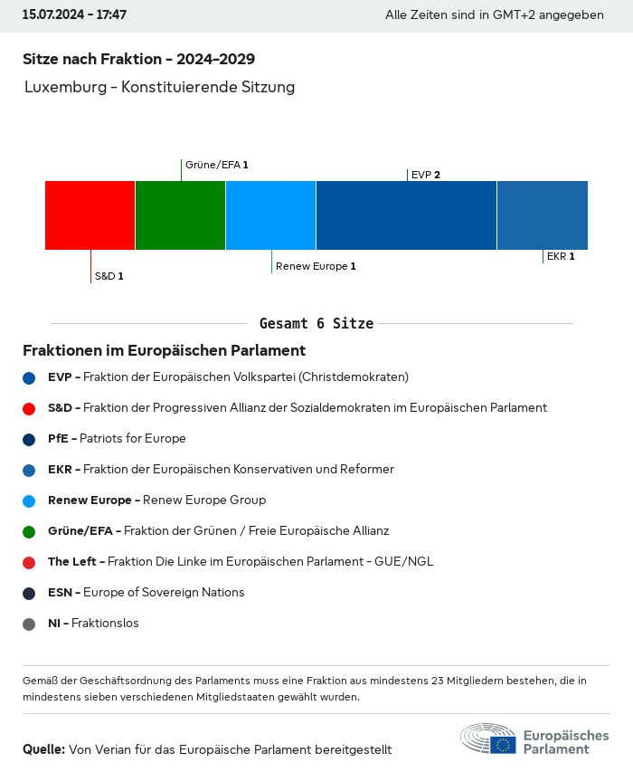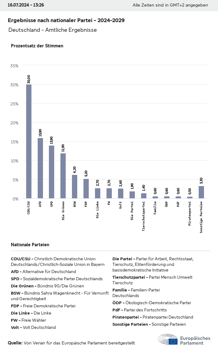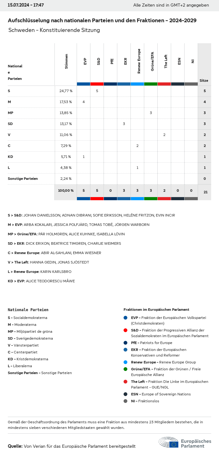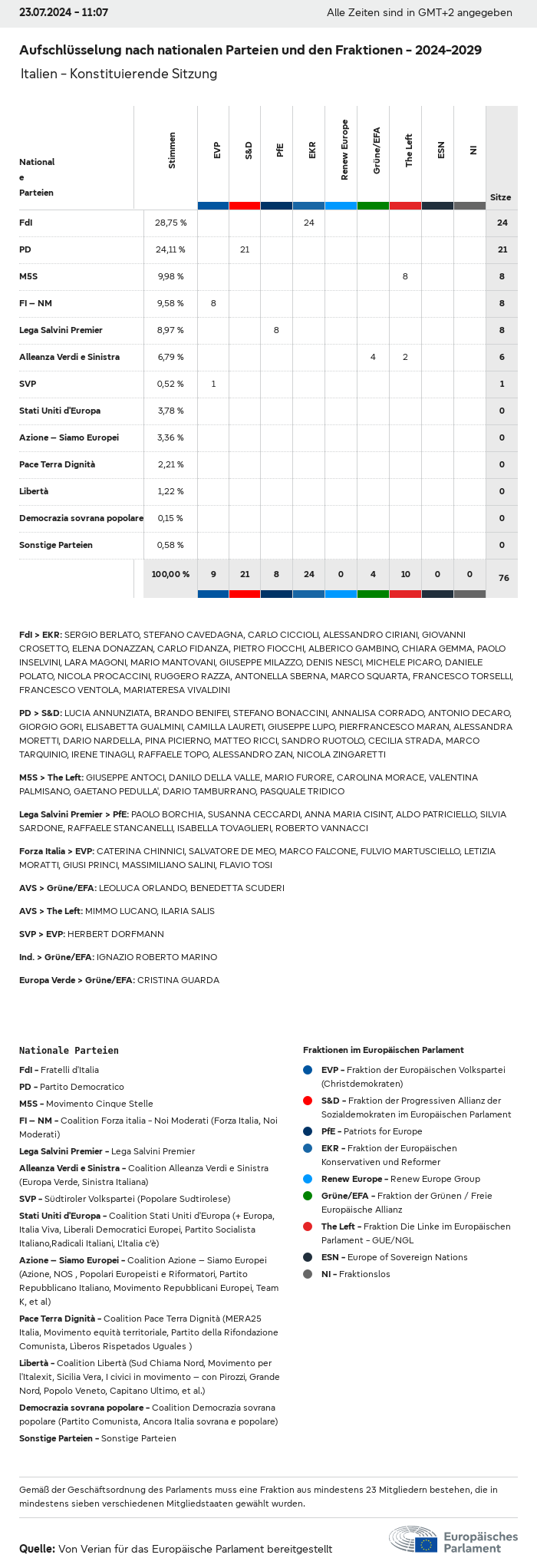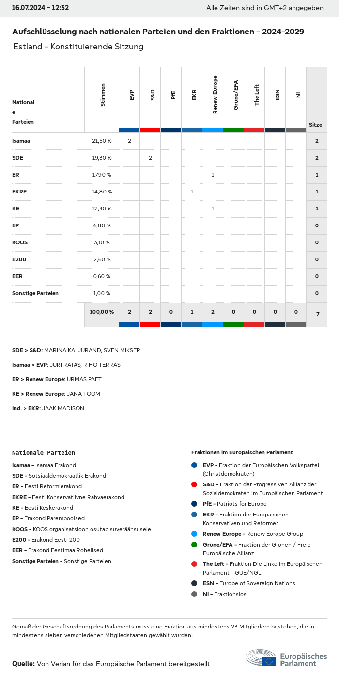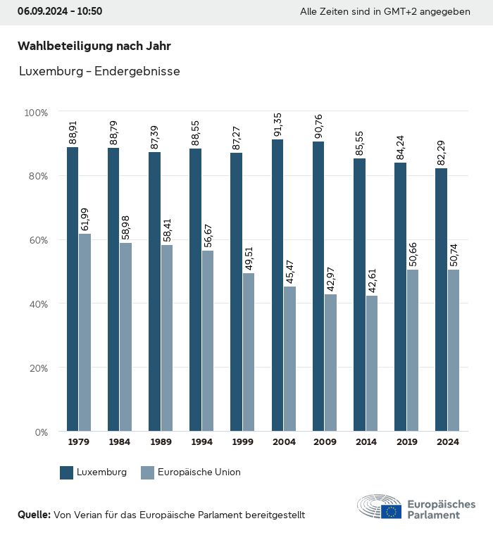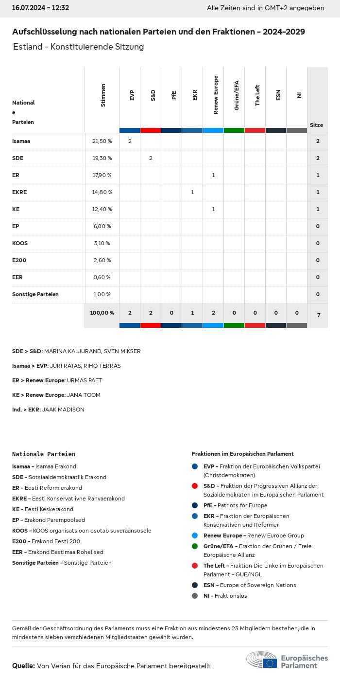 Wahldaten zu jeder Europawahl seit 1979 sind hier in verschiedenen Formaten zum Herunterladen verfügbar. Hinweis: Die zum Herunterladen bereitgestellten Dateien sind mit einer digitalen Signatur versehen. Diese Signaturen können anhand dieses Zertifikats validiert werden, das seinerseits anhand der folgenden Zertifikatskette validiert werden kann. Daten zur Europawahl 2024 json Allgemein Labels (38 Ko) - Signatur Wahlbeteiligung (32 Ko) - Signatur Daten zum Geschlechterverhältnis (7 Ko) - Signatur Fraktionen (40 Ko) - Signatur Nationale Parteien (110 Ko) - Signatur Daten zur Europawahl (1 Ko) - Signatur Wahlergebnisse be (7 Ko) - Signatur fbe (4 Ko) - Signatur gbe (2 Ko) - Signatur wbe (3 Ko) - Signatur bg (5 Ko) - Signatur cz (7 Ko) - Signatur dk (5 Ko) - Signatur de (8 Ko) - Signatur ee (4 Ko) - Signatur ie (5 Ko) - Signatur el (5 Ko) - Signatur es (7 Ko) - Signatur fr (8 Ko) - Signatur hr (3 Ko) - Signatur it (6 Ko) - Signatur cy (3 Ko) - Signatur lv (5 Ko) - Signatur lt (5 Ko) - Signatur lu (4 Ko) - Signatur hu (5 Ko) - Signatur mt (2 Ko) - Signatur nl (6 Ko) - Signatur at (3 Ko) - Signatur pl (7 Ko) - Signatur pt (5 Ko) - Signatur ro (5 Ko) - Signatur si (4 Ko) - Signatur sk (5 Ko) - Signatur fi (4 Ko) - Signatur se (4 Ko) - Signatur xml Allgemein Labels (63 Ko) - Signatur Wahlbeteiligung (40 Ko) - Signatur Daten zum Geschlechterverhältnis (10 Ko) - Signatur Fraktionen (64 Ko) - Signatur Nationale Parteien (123 Ko) - Signatur Daten zur Europawahl (2 Ko) - Signatur Wahlergebnisse be (10 Ko) - Signatur fbe (6 Ko) - Signatur gbe (3 Ko) - Signatur wbe (5 Ko) - Signatur bg (7 Ko) - Signatur cz (10 Ko) - Signatur dk (7 Ko) - Signatur de (11 Ko) - Signatur ee (6 Ko) - Signatur ie (7 Ko) - Signatur el (7 Ko) - Signatur es (11 Ko) - Signatur fr (12 Ko) - Signatur hr (5 Ko) - Signatur it (9 Ko) - Signatur cy (5 Ko) - Signatur lv (7 Ko) - Signatur lt (7 Ko) - Signatur lu (6 Ko) - Signatur hu (7 Ko) - Signatur mt (3 Ko) - Signatur nl (9 Ko) - Signatur at (5 Ko) - Signatur pl (10 Ko) - Signatur pt (7 Ko) - Signatur ro (8 Ko) - Signatur si (5 Ko) - Signatur sk (7 Ko) - Signatur fi (6 Ko) - Signatur se (6 Ko) - Signatur csv Wahlbeteiligung Wahlbeteiligung in der Union (1 Ko) - Signatur Wahlbeteiligung nach Land (5 Ko) - Signatur Labels (15 Ko) - Signatur Daten zum Geschlechterverhältnis Geschlechterverhältnis unionsweit (1 Ko) - Signatur Geschlechterverhältnis nach Land (2 Ko) - Signatur Fraktionen (16 Ko) - Signatur Nationale Parteien (27 Ko) - Signatur Ergebnisse nach nationaler Partei be (1 Ko) - Signatur fbe (1 Ko) - Signatur gbe (1 Ko) - Signatur wbe (1 Ko) - Signatur bg (1 Ko) - Signatur cz (1 Ko) - Signatur dk (1 Ko) - Signatur de (1 Ko) - Signatur ee (1 Ko) - Signatur ie (1 Ko) - Signatur el (1 Ko) - Signatur es (1 Ko) - Signatur fr (1 Ko) - Signatur hr (1 Ko) - Signatur it (1 Ko) - Signatur cy (1 Ko) - Signatur lv (1 Ko) - Signatur lt (1 Ko) - Signatur lu (1 Ko) - Signatur hu (1 Ko) - Signatur mt (1 Ko) - Signatur nl (1 Ko) - Signatur at (1 Ko) - Signatur pl (1 Ko) - Signatur pt (1 Ko) - Signatur ro (1 Ko) - Signatur si (1 Ko) - Signatur sk (1 Ko) - Signatur fi (1 Ko) - Signatur se (1 Ko) - Signatur Ergebnisse nach Fraktion EU (1 Ko) - Signatur be (1 Ko) - Signatur fbe (1 Ko) - Signatur gbe (1 Ko) - Signatur wbe (1 Ko) - Signatur bg (1 Ko) - Signatur cz (1 Ko) - Signatur dk (1 Ko) - Signatur de (1 Ko) - Signatur ee (1 Ko) - Signatur ie (1 Ko) - Signatur el (1 Ko) - Signatur es (1 Ko) - Signatur fr (1 Ko) - Signatur hr (1 Ko) - Signatur it (1 Ko) - Signatur cy (1 Ko) - Signatur lv (1 Ko) - Signatur lt (1 Ko) - Signatur lu (1 Ko) - Signatur hu (1 Ko) - Signatur mt (1 Ko) - Signatur nl (1 Ko) - Signatur at (1 Ko) - Signatur pl (1 Ko) - Signatur pt (1 Ko) - Signatur ro (1 Ko) - Signatur si (1 Ko) - Signatur sk (1 Ko) - Signatur fi (1 Ko) - Signatur se (1 Ko) - Signatur Aufschlüsselung nach nationalen Parteien und Fraktionen be (1 Ko) - Signatur fbe (1 Ko) - Signatur gbe (1 Ko) - Signatur wbe (1 Ko) - Signatur bg (1 Ko) - Signatur cz (1 Ko) - Signatur dk (1 Ko) - Signatur de (1 Ko) - Signatur ee (1 Ko) - Signatur ie (1 Ko) - Signatur el (1 Ko) - Signatur es (1 Ko) - Signatur fr (1 Ko) - Signatur hr (1 Ko) - Signatur it (1 Ko) - Signatur cy (1 Ko) - Signatur lv (1 Ko) - Signatur lt (1 Ko) - Signatur lu (1 Ko) - Signatur hu (1 Ko) - Signatur mt (1 Ko) - Signatur nl (1 Ko) - Signatur at (1 Ko) - Signatur pl (1 Ko) - Signatur pt (1 Ko) - Signatur ro (1 Ko) - Signatur si (1 Ko) - Signatur sk (1 Ko) - Signatur fi (1 Ko) - Signatur se (1 Ko) - Signatur jpg Wahlbeteiligung Wahlbeteiligung nach Jahr (~30 Ko) Wahlbeteiligung nach Land (~140 Ko) Geschlechterverhältnis der Mitglieder Geschlechterverhältnis der Mitglieder nach Land Karte (~130 Ko) Balkendiagramm (~80 Ko) Geschlechterverhältnis der Mitglieder nach Jahr (~50 Ko) Wahlergebnisse Unionsweite Daten Sitzverteilung (~110 Ko) Europäisches Parlament (~250 Ko) Nationale Daten BE Ergebnisse nach nationaler Partei (~90 Ko) Sitze nach Fraktion (~70 Ko) Aufschlüsselung nach nationalen Parteien und Fraktionen (~180 Ko) Geschlechterverhältnis der Mitglieder nach Jahr (~50 Ko) Wahlbeteiligung nach Jahr (~50 Ko) FBE Ergebnisse nach nationaler Partei (~90 Ko) Sitze nach Fraktion (~70 Ko) Aufschlüsselung nach nationalen Parteien und Fraktionen (~180 Ko) GBE Ergebnisse nach nationaler Partei (~90 Ko) Sitze nach Fraktion (~70 Ko) Aufschlüsselung nach nationalen Parteien und Fraktionen (~180 Ko) WBE Ergebnisse nach nationaler Partei (~90 Ko) Sitze nach Fraktion (~70 Ko) Aufschlüsselung nach nationalen Parteien und Fraktionen (~180 Ko) BG Ergebnisse nach nationaler Partei (~90 Ko) Sitze nach Fraktion (~70 Ko) Aufschlüsselung nach nationalen Parteien und Fraktionen (~180 Ko) Geschlechterverhältnis der Mitglieder nach Jahr (~50 Ko) Wahlbeteiligung nach Jahr (~50 Ko) CZ Ergebnisse nach nationaler Partei (~90 Ko) Sitze nach Fraktion (~70 Ko) Aufschlüsselung nach nationalen Parteien und Fraktionen (~180 Ko) Geschlechterverhältnis der Mitglieder nac