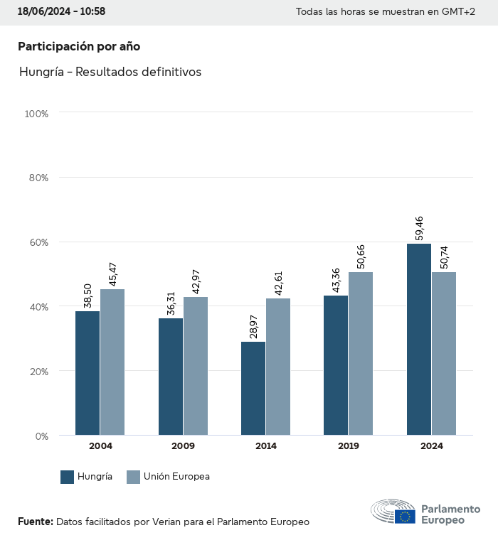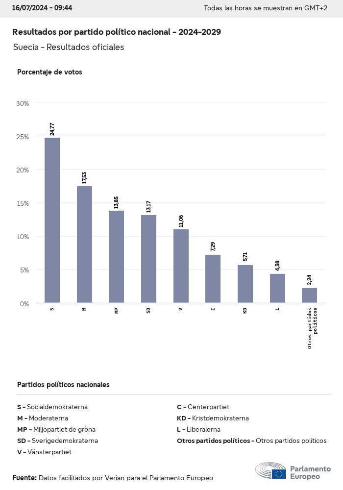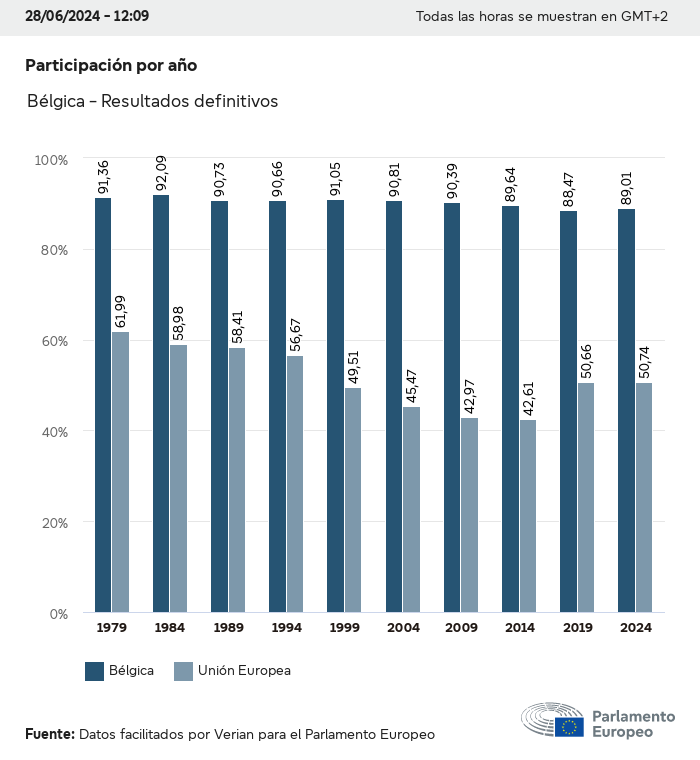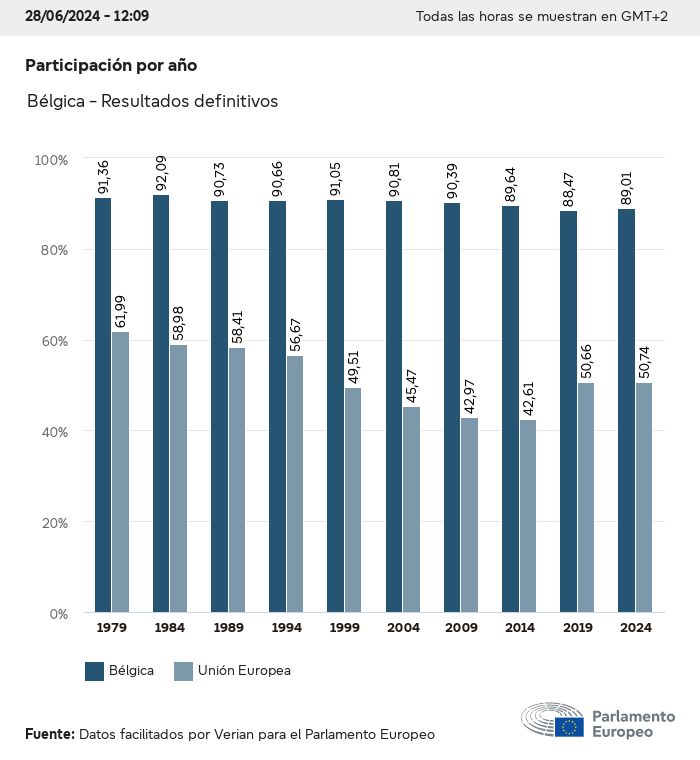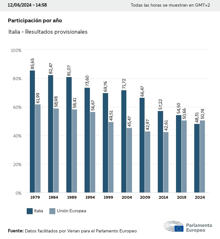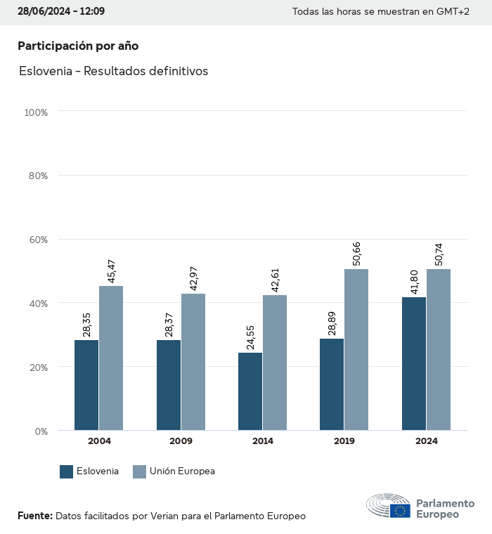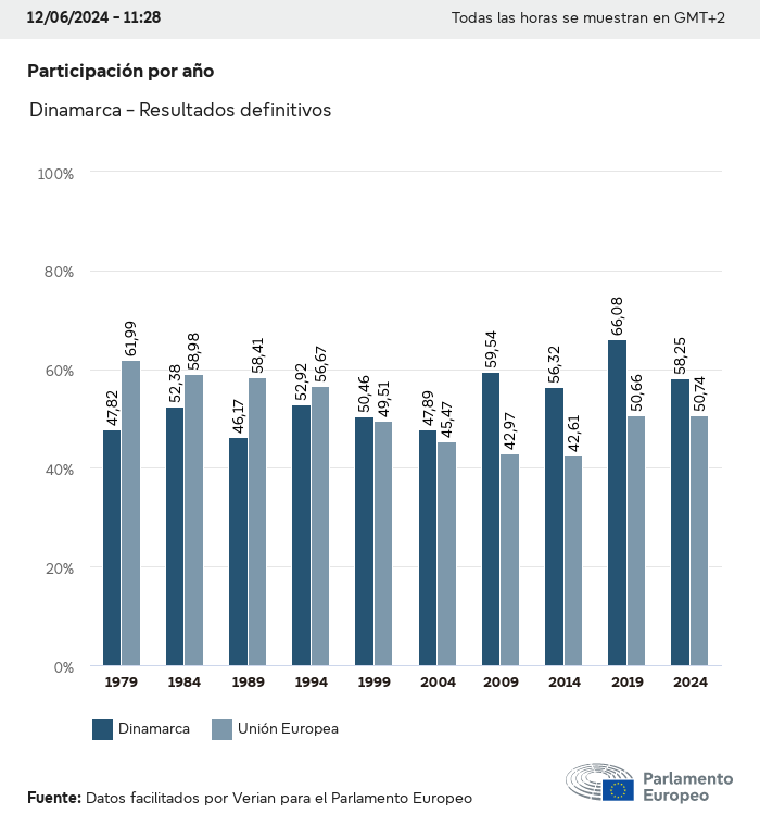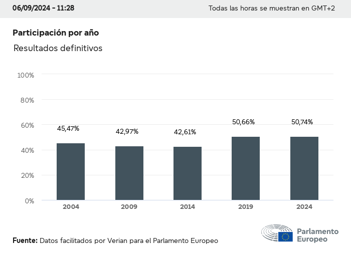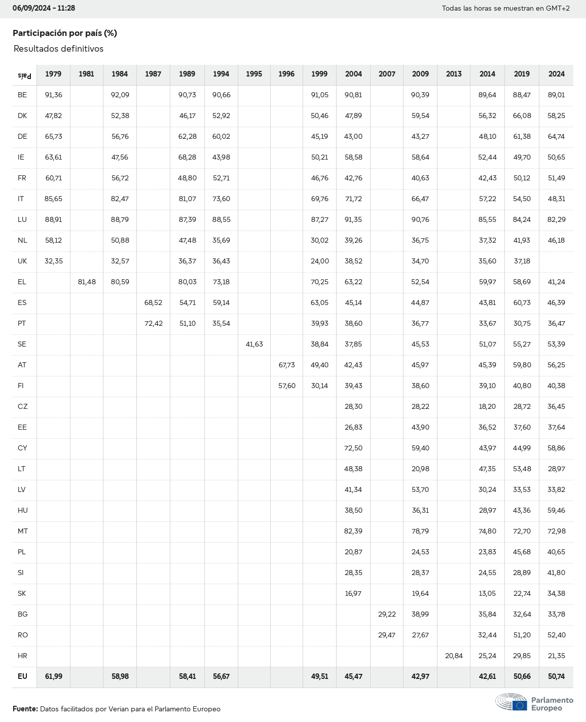 Los datos electorales correspondientes a todas las elecciones europeas celebradas desde 1979 están disponibles aquí y pueden descargarse en diversos formatos. Tenga en cuenta que los archivos disponibles para su descarga llevan al lado una firma digital. Las firmas pueden validarse utilizando este certificado, que a su vez puede validarse utilizando la siguiente cadena de certificados. Datos de las elecciones europeas de 2024. json Común Etiquetas (38 Ko) - Firma Participación electoral (32 Ko) - Firma Datos de equilibrio de género (7 Ko) - Firma Grupos políticos (40 Ko) - Firma Partidos políticos nacionales (110 Ko) - Firma Datos de elecciones europeas (1 Ko) - Firma Resultados de las elecciones be (7 Ko) - Firma fbe (4 Ko) - Firma gbe (2 Ko) - Firma wbe (3 Ko) - Firma bg (5 Ko) - Firma cz (7 Ko) - Firma dk (5 Ko) - Firma de (8 Ko) - Firma ee (4 Ko) - Firma ie (5 Ko) - Firma el (5 Ko) - Firma es (7 Ko) - Firma fr (8 Ko) - Firma hr (3 Ko) - Firma it (6 Ko) - Firma cy (3 Ko) - Firma lv (5 Ko) - Firma lt (5 Ko) - Firma lu (4 Ko) - Firma hu (5 Ko) - Firma mt (2 Ko) - Firma nl (6 Ko) - Firma at (3 Ko) - Firma pl (7 Ko) - Firma pt (5 Ko) - Firma ro (5 Ko) - Firma si (4 Ko) - Firma sk (5 Ko) - Firma fi (4 Ko) - Firma se (4 Ko) - Firma xml Común Etiquetas (63 Ko) - Firma Participación electoral (40 Ko) - Firma Datos de equilibrio de género (10 Ko) - Firma Grupos políticos (64 Ko) - Firma Partidos políticos nacionales (123 Ko) - Firma Datos de elecciones europeas (2 Ko) - Firma Resultados de las elecciones be (10 Ko) - Firma fbe (6 Ko) - Firma gbe (3 Ko) - Firma wbe (5 Ko) - Firma bg (7 Ko) - Firma cz (10 Ko) - Firma dk (7 Ko) - Firma de (11 Ko) - Firma ee (6 Ko) - Firma ie (7 Ko) - Firma el (7 Ko) - Firma es (11 Ko) - Firma fr (12 Ko) - Firma hr (5 Ko) - Firma it (9 Ko) - Firma cy (5 Ko) - Firma lv (7 Ko) - Firma lt (7 Ko) - Firma lu (6 Ko) - Firma hu (7 Ko) - Firma mt (3 Ko) - Firma nl (9 Ko) - Firma at (5 Ko) - Firma pl (10 Ko) - Firma pt (7 Ko) - Firma ro (8 Ko) - Firma si (5 Ko) - Firma sk (7 Ko) - Firma fi (6 Ko) - Firma se (6 Ko) - Firma csv Participación electoral Participación en la UE (1 Ko) - Firma Participación por país (5 Ko) - Firma Etiquetas (15 Ko) - Firma Datos de equilibrio de género Equilibrio de género en la UE (1 Ko) - Firma Equilibrio de género por país (2 Ko) - Firma Grupos políticos (16 Ko) - Firma Partidos políticos nacionales (27 Ko) - Firma Resultado por partido político nacional be (1 Ko) - Firma fbe (1 Ko) - Firma gbe (1 Ko) - Firma wbe (1 Ko) - Firma bg (1 Ko) - Firma cz (1 Ko) - Firma dk (1 Ko) - Firma de (1 Ko) - Firma ee (1 Ko) - Firma ie (1 Ko) - Firma el (1 Ko) - Firma es (1 Ko) - Firma fr (1 Ko) - Firma hr (1 Ko) - Firma it (1 Ko) - Firma cy (1 Ko) - Firma lv (1 Ko) - Firma lt (1 Ko) - Firma lu (1 Ko) - Firma hu (1 Ko) - Firma mt (1 Ko) - Firma nl (1 Ko) - Firma at (1 Ko) - Firma pl (1 Ko) - Firma pt (1 Ko) - Firma ro (1 Ko) - Firma si (1 Ko) - Firma sk (1 Ko) - Firma fi (1 Ko) - Firma se (1 Ko) - Firma Resultados por grupo políticos EU (1 Ko) - Firma be (1 Ko) - Firma fbe (1 Ko) - Firma gbe (1 Ko) - Firma wbe (1 Ko) - Firma bg (1 Ko) - Firma cz (1 Ko) - Firma dk (1 Ko) - Firma de (1 Ko) - Firma ee (1 Ko) - Firma ie (1 Ko) - Firma el (1 Ko) - Firma es (1 Ko) - Firma fr (1 Ko) - Firma hr (1 Ko) - Firma it (1 Ko) - Firma cy (1 Ko) - Firma lv (1 Ko) - Firma lt (1 Ko) - Firma lu (1 Ko) - Firma hu (1 Ko) - Firma mt (1 Ko) - Firma nl (1 Ko) - Firma at (1 Ko) - Firma pl (1 Ko) - Firma pt (1 Ko) - Firma ro (1 Ko) - Firma si (1 Ko) - Firma sk (1 Ko) - Firma fi (1 Ko) - Firma se (1 Ko) - Firma Escaños por partidos políticos nacionales y grupos políticos be (1 Ko) - Firma fbe (1 Ko) - Firma gbe (1 Ko) - Firma wbe (1 Ko) - Firma bg (1 Ko) - Firma cz (1 Ko) - Firma dk (1 Ko) - Firma de (1 Ko) - Firma ee (1 Ko) - Firma ie (1 Ko) - Firma el (1 Ko) - Firma es (1 Ko) - Firma fr (1 Ko) - Firma hr (1 Ko) - Firma it (1 Ko) - Firma cy (1 Ko) - Firma lv (1 Ko) - Firma lt (1 Ko) - Firma lu (1 Ko) - Firma hu (1 Ko) - Firma mt (1 Ko) - Firma nl (1 Ko) - Firma at (1 Ko) - Firma pl (1 Ko) - Firma pt (1 Ko) - Firma ro (1 Ko) - Firma si (1 Ko) - Firma sk (1 Ko) - Firma fi (1 Ko) - Firma se (1 Ko) - Firma jpg Participación electoral Participación por año (~30 Ko) Participación por país (~140 Ko) Equilibrio de género entre eurodiputados Equilibrio de género entre eurodiputados por país Mapa (~130 Ko) Gráfico de barras (~80 Ko) Equilibrio de género entre eurodiputados por año (~50 Ko) Resultados de las elecciones Datos europeos Hemiciclo (~110 Ko) Parlamento Europeo (~250 Ko) Datos nacionales BE Resultado por partido político nacional (~90 Ko) Escaños por grupo político (~70 Ko) Escaños por partidos políticos nacionales y grupos políticos (~180 Ko) Equilibrio de género entre eurodiputados por año (~50 Ko) Participación por año (~50 Ko) FBE Resultado por partido político nacional (~90 Ko) Escaños por grupo político (~70 Ko) Escaños por partidos políticos nacionales y grupos políticos (~180 Ko) GBE Resultado por partido político nacional (~90 Ko) Escaños por grupo político (~70 Ko) Escaños por partidos políticos nacionales y grupos políticos (~180 Ko) WBE Resultado por partido político nacional (~90 Ko) Escaños por grupo político (~70 Ko) Escaños por partidos políticos nacionales y grupos políticos (~180 Ko) BG Resultado por partido político nacional (~90 Ko) Escaños por grupo político (~70 Ko) Escaños por partidos políticos nacionales y grupos políticos (~180 Ko) Equilibrio de género entre eurodiputados por año (~50 Ko) Participación por año (~50 Ko) CZ Resultado por partido político nacional (~90 Ko) Escaños por grupo político (~70 Ko) Escaños por partidos políticos nacionales y grupos políticos (~180 Ko) Equilibrio de género entre eurodiputados por año (~50 Ko) Participación por año (~50 Ko) DK Resultado por partido político nacional (~90 Ko) Escaños por grupo político (~70 Ko) Escaños por partidos pol