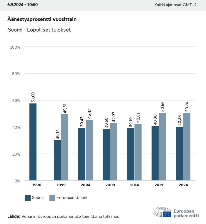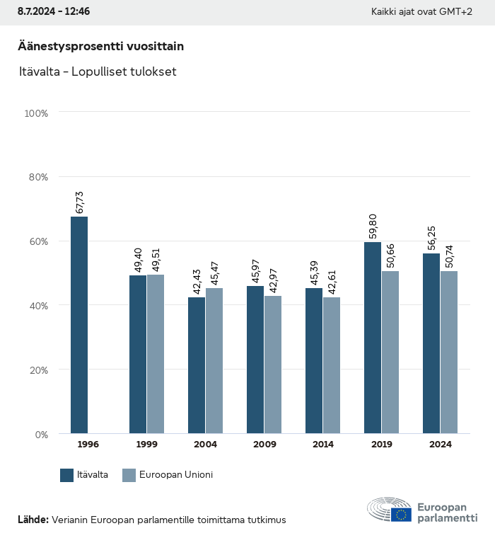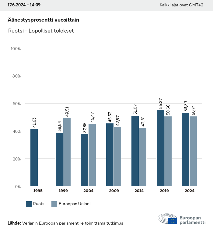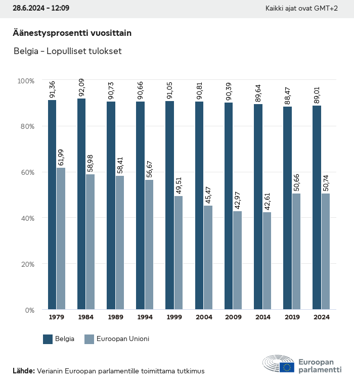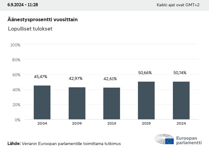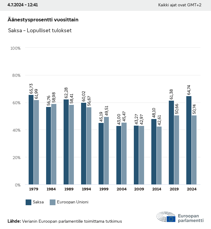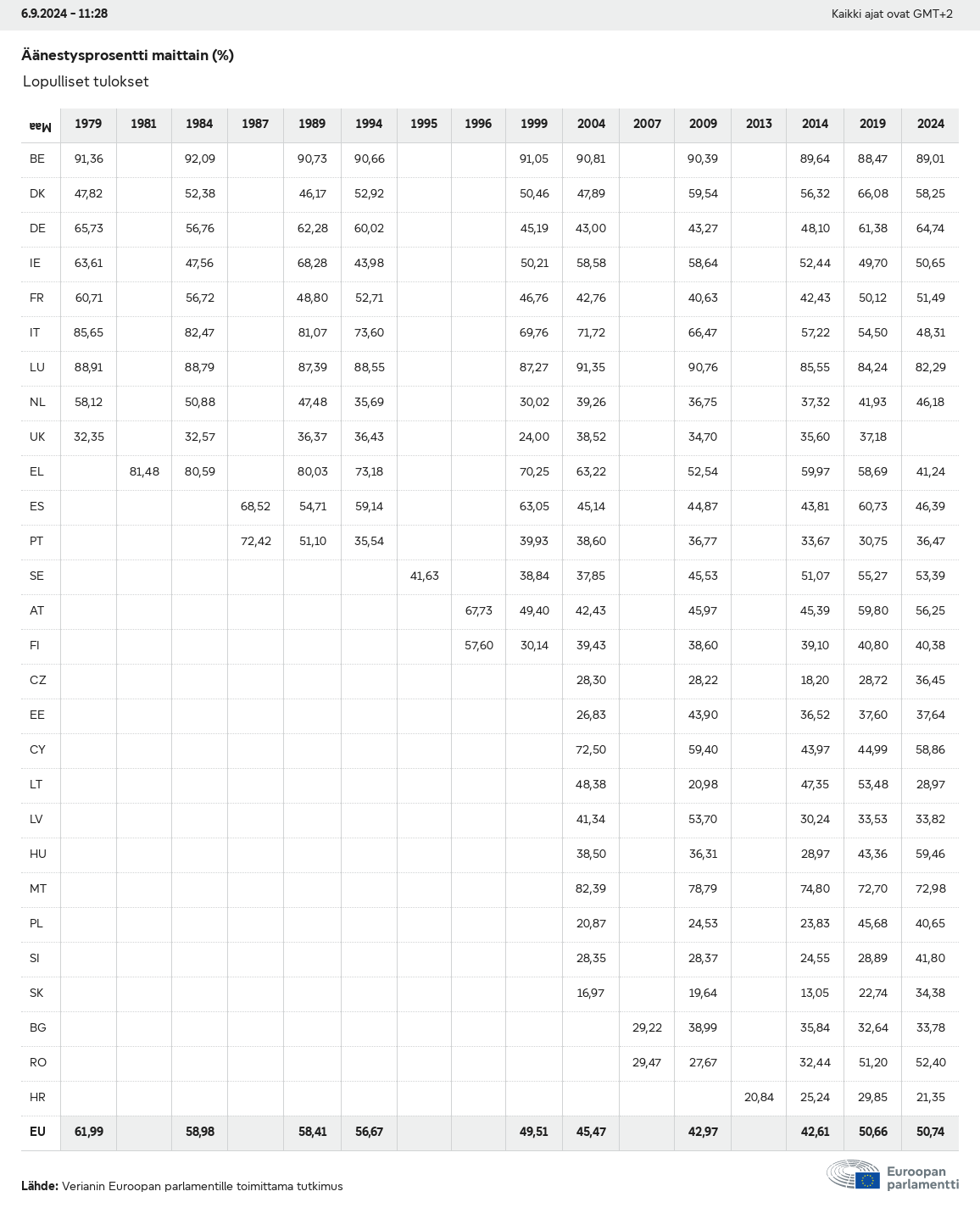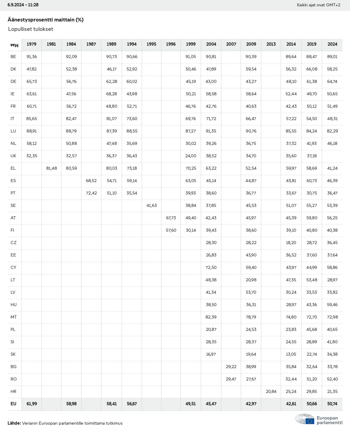 Kaikkien eurovaalien vaalitiedot vuodesta 1979 alkaen voidaan ladata alta erilaisissa tiedostomuodoissa. Huomaa, että ladattavien tiedostojen ohessa on paikka digitaaliselle allekirjoitukselle. Nämä allekirjoitukset voidaan vahvistaa tällä todistuksella, joka voidaan puolestaan vahvistaa seuraavalla todistusketjulla. Tietoa vuoden 2024 EU-vaaleista. json Yleistä Nimikkeet (38 Ko) - Allekirjoitus Äänestysprosentti (32 Ko) - Allekirjoitus Sukupuolijakaumatietoa (7 Ko) - Allekirjoitus Poliittiset ryhmät (40 Ko) - Allekirjoitus Kansalliset puolueet (110 Ko) - Allekirjoitus Tietoa EU-vaaleista (1 Ko) - Allekirjoitus Vaalitulokset be (7 Ko) - Allekirjoitus fbe (4 Ko) - Allekirjoitus gbe (2 Ko) - Allekirjoitus wbe (3 Ko) - Allekirjoitus bg (5 Ko) - Allekirjoitus cz (7 Ko) - Allekirjoitus dk (5 Ko) - Allekirjoitus de (8 Ko) - Allekirjoitus ee (4 Ko) - Allekirjoitus ie (5 Ko) - Allekirjoitus el (5 Ko) - Allekirjoitus es (7 Ko) - Allekirjoitus fr (8 Ko) - Allekirjoitus hr (3 Ko) - Allekirjoitus it (6 Ko) - Allekirjoitus cy (3 Ko) - Allekirjoitus lv (5 Ko) - Allekirjoitus lt (5 Ko) - Allekirjoitus lu (4 Ko) - Allekirjoitus hu (5 Ko) - Allekirjoitus mt (2 Ko) - Allekirjoitus nl (6 Ko) - Allekirjoitus at (3 Ko) - Allekirjoitus pl (7 Ko) - Allekirjoitus pt (5 Ko) - Allekirjoitus ro (5 Ko) - Allekirjoitus si (4 Ko) - Allekirjoitus sk (5 Ko) - Allekirjoitus fi (4 Ko) - Allekirjoitus se (4 Ko) - Allekirjoitus xml Yleistä Nimikkeet (63 Ko) - Allekirjoitus Äänestysprosentti (40 Ko) - Allekirjoitus Sukupuolijakaumatietoa (10 Ko) - Allekirjoitus Poliittiset ryhmät (64 Ko) - Allekirjoitus Kansalliset puolueet (123 Ko) - Allekirjoitus Tietoa EU-vaaleista (2 Ko) - Allekirjoitus Vaalitulokset be (10 Ko) - Allekirjoitus fbe (6 Ko) - Allekirjoitus gbe (3 Ko) - Allekirjoitus wbe (5 Ko) - Allekirjoitus bg (7 Ko) - Allekirjoitus cz (10 Ko) - Allekirjoitus dk (7 Ko) - Allekirjoitus de (11 Ko) - Allekirjoitus ee (6 Ko) - Allekirjoitus ie (7 Ko) - Allekirjoitus el (7 Ko) - Allekirjoitus es (11 Ko) - Allekirjoitus fr (12 Ko) - Allekirjoitus hr (5 Ko) - Allekirjoitus it (9 Ko) - Allekirjoitus cy (5 Ko) - Allekirjoitus lv (7 Ko) - Allekirjoitus lt (7 Ko) - Allekirjoitus lu (6 Ko) - Allekirjoitus hu (7 Ko) - Allekirjoitus mt (3 Ko) - Allekirjoitus nl (9 Ko) - Allekirjoitus at (5 Ko) - Allekirjoitus pl (10 Ko) - Allekirjoitus pt (7 Ko) - Allekirjoitus ro (8 Ko) - Allekirjoitus si (5 Ko) - Allekirjoitus sk (7 Ko) - Allekirjoitus fi (6 Ko) - Allekirjoitus se (6 Ko) - Allekirjoitus csv Äänestysprosentti Äänestysprosentti EU (1 Ko) - Allekirjoitus Äänestysprosentti maittain (5 Ko) - Allekirjoitus Nimikkeet (15 Ko) - Allekirjoitus Sukupuolijakaumatietoa Sukupuolijakauma EU (1 Ko) - Allekirjoitus Sukupuolijakauma maittain (2 Ko) - Allekirjoitus Poliittiset ryhmät (16 Ko) - Allekirjoitus Kansalliset puolueet (27 Ko) - Allekirjoitus Tulokset kansallisen puolueen mukaan be (1 Ko) - Allekirjoitus fbe (1 Ko) - Allekirjoitus gbe (1 Ko) - Allekirjoitus wbe (1 Ko) - Allekirjoitus bg (1 Ko) - Allekirjoitus cz (1 Ko) - Allekirjoitus dk (1 Ko) - Allekirjoitus de (1 Ko) - Allekirjoitus ee (1 Ko) - Allekirjoitus ie (1 Ko) - Allekirjoitus el (1 Ko) - Allekirjoitus es (1 Ko) - Allekirjoitus fr (1 Ko) - Allekirjoitus hr (1 Ko) - Allekirjoitus it (1 Ko) - Allekirjoitus cy (1 Ko) - Allekirjoitus lv (1 Ko) - Allekirjoitus lt (1 Ko) - Allekirjoitus lu (1 Ko) - Allekirjoitus hu (1 Ko) - Allekirjoitus mt (1 Ko) - Allekirjoitus nl (1 Ko) - Allekirjoitus at (1 Ko) - Allekirjoitus pl (1 Ko) - Allekirjoitus pt (1 Ko) - Allekirjoitus ro (1 Ko) - Allekirjoitus si (1 Ko) - Allekirjoitus sk (1 Ko) - Allekirjoitus fi (1 Ko) - Allekirjoitus se (1 Ko) - Allekirjoitus Tulokset poliittisen ryhmän mukaan EU (1 Ko) - Allekirjoitus be (1 Ko) - Allekirjoitus fbe (1 Ko) - Allekirjoitus gbe (1 Ko) - Allekirjoitus wbe (1 Ko) - Allekirjoitus bg (1 Ko) - Allekirjoitus cz (1 Ko) - Allekirjoitus dk (1 Ko) - Allekirjoitus de (1 Ko) - Allekirjoitus ee (1 Ko) - Allekirjoitus ie (1 Ko) - Allekirjoitus el (1 Ko) - Allekirjoitus es (1 Ko) - Allekirjoitus fr (1 Ko) - Allekirjoitus hr (1 Ko) - Allekirjoitus it (1 Ko) - Allekirjoitus cy (1 Ko) - Allekirjoitus lv (1 Ko) - Allekirjoitus lt (1 Ko) - Allekirjoitus lu (1 Ko) - Allekirjoitus hu (1 Ko) - Allekirjoitus mt (1 Ko) - Allekirjoitus nl (1 Ko) - Allekirjoitus at (1 Ko) - Allekirjoitus pl (1 Ko) - Allekirjoitus pt (1 Ko) - Allekirjoitus ro (1 Ko) - Allekirjoitus si (1 Ko) - Allekirjoitus sk (1 Ko) - Allekirjoitus fi (1 Ko) - Allekirjoitus se (1 Ko) - Allekirjoitus Jaottelu kansallisten puolueiden ja poliittisten ryhmien mukaan be (1 Ko) - Allekirjoitus fbe (1 Ko) - Allekirjoitus gbe (1 Ko) - Allekirjoitus wbe (1 Ko) - Allekirjoitus bg (1 Ko) - Allekirjoitus cz (1 Ko) - Allekirjoitus dk (1 Ko) - Allekirjoitus de (1 Ko) - Allekirjoitus ee (1 Ko) - Allekirjoitus ie (1 Ko) - Allekirjoitus el (1 Ko) - Allekirjoitus es (1 Ko) - Allekirjoitus fr (1 Ko) - Allekirjoitus hr (1 Ko) - Allekirjoitus it (1 Ko) - Allekirjoitus cy (1 Ko) - Allekirjoitus lv (1 Ko) - Allekirjoitus lt (1 Ko) - Allekirjoitus lu (1 Ko) - Allekirjoitus hu (1 Ko) - Allekirjoitus mt (1 Ko) - Allekirjoitus nl (1 Ko) - Allekirjoitus at (1 Ko) - Allekirjoitus pl (1 Ko) - Allekirjoitus pt (1 Ko) - Allekirjoitus ro (1 Ko) - Allekirjoitus si (1 Ko) - Allekirjoitus sk (1 Ko) - Allekirjoitus fi (1 Ko) - Allekirjoitus se (1 Ko) - Allekirjoitus jpg Äänestysprosentti Äänestysprosentti vuosittain (~30 Ko) Äänestysprosentti maittain (~140 Ko) Meppien sukupuolijakauma Meppien sukupuolijakauma maittain Kartta (~130 Ko) Pylväsdiagrammi (~80 Ko) Meppien sukupuolijakauma vuosittain (~50 Ko) Vaalitulokset Eurooppaa koskevat tiedot Istuntosali (~110 Ko) Euroopan parlamentti (~250 Ko) Kansalliset tiedot BE Tulokset kansallisen puolueen mukaan (~90 Ko) Paikat poliittisen ryhmän mukaan (~70 Ko) Jaottelu kansallisten puolueiden ja poliittisten ryhmien mukaan (~180 Ko) Meppien sukupuolijakauma vuosittain (~50 Ko) Äänestysprosentti vuosittain (~50 Ko) FBE Tulokset kan