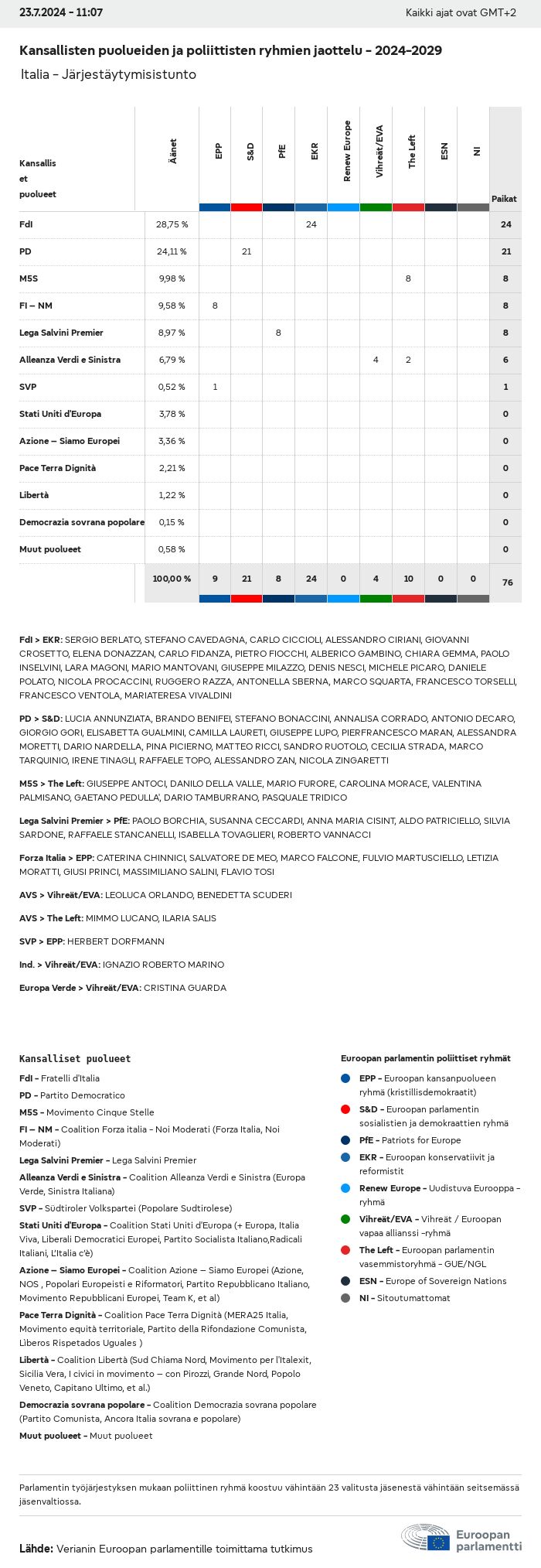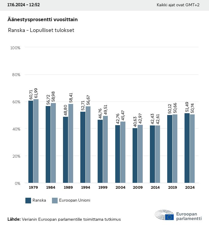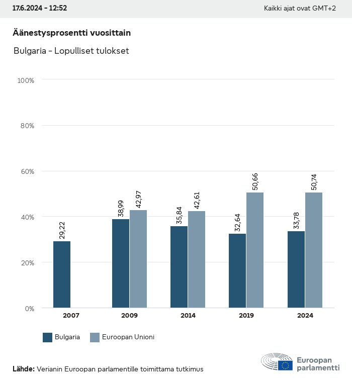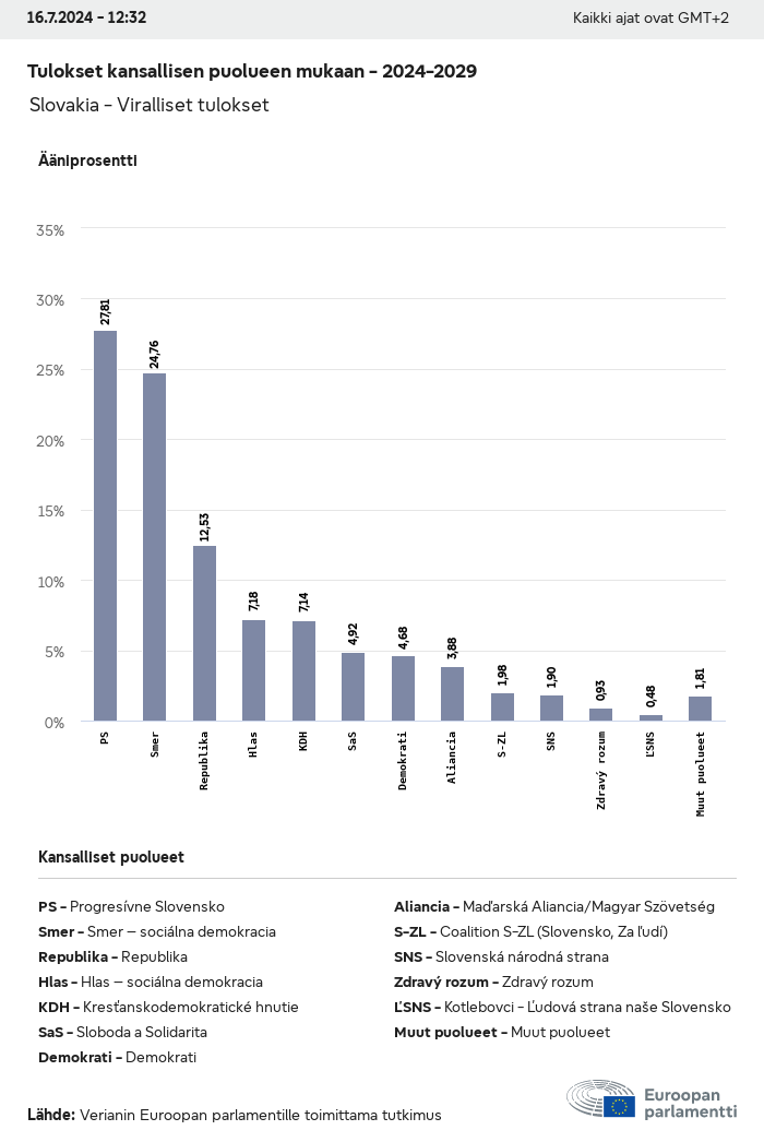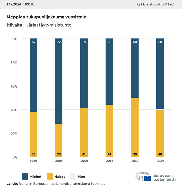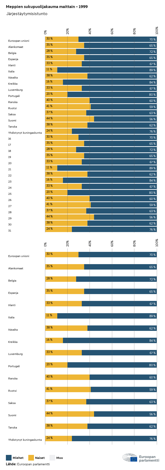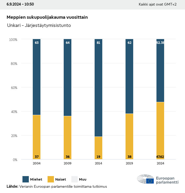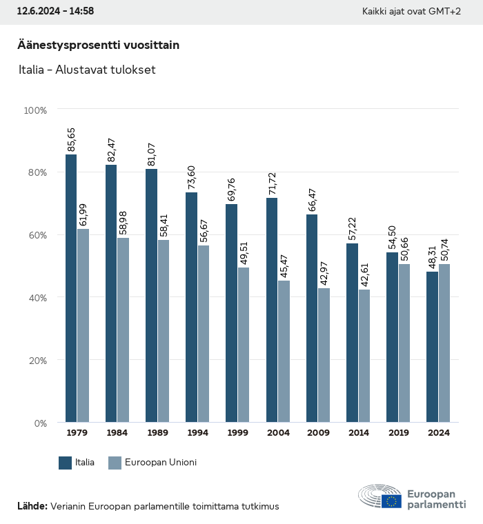 Kaikkien eurovaalien vaalitiedot vuodesta 1979 alkaen voidaan ladata alta erilaisissa tiedostomuodoissa. Huomaa, että ladattavien tiedostojen ohessa on paikka digitaaliselle allekirjoitukselle. Nämä allekirjoitukset voidaan vahvistaa tällä todistuksella, joka voidaan puolestaan vahvistaa seuraavalla todistusketjulla. Tietoa vuoden 2024 EU-vaaleista. json Yleistä Nimikkeet (38 Ko) - Allekirjoitus Äänestysprosentti (32 Ko) - Allekirjoitus Sukupuolijakaumatietoa (7 Ko) - Allekirjoitus Poliittiset ryhmät (40 Ko) - Allekirjoitus Kansalliset puolueet (110 Ko) - Allekirjoitus Tietoa EU-vaaleista (1 Ko) - Allekirjoitus Vaalitulokset be (7 Ko) - Allekirjoitus fbe (4 Ko) - Allekirjoitus gbe (2 Ko) - Allekirjoitus wbe (3 Ko) - Allekirjoitus bg (5 Ko) - Allekirjoitus cz (7 Ko) - Allekirjoitus dk (5 Ko) - Allekirjoitus de (8 Ko) - Allekirjoitus ee (4 Ko) - Allekirjoitus ie (5 Ko) - Allekirjoitus el (5 Ko) - Allekirjoitus es (7 Ko) - Allekirjoitus fr (8 Ko) - Allekirjoitus hr (3 Ko) - Allekirjoitus it (6 Ko) - Allekirjoitus cy (3 Ko) - Allekirjoitus lv (5 Ko) - Allekirjoitus lt (5 Ko) - Allekirjoitus lu (4 Ko) - Allekirjoitus hu (5 Ko) - Allekirjoitus mt (2 Ko) - Allekirjoitus nl (6 Ko) - Allekirjoitus at (3 Ko) - Allekirjoitus pl (7 Ko) - Allekirjoitus pt (5 Ko) - Allekirjoitus ro (5 Ko) - Allekirjoitus si (4 Ko) - Allekirjoitus sk (5 Ko) - Allekirjoitus fi (4 Ko) - Allekirjoitus se (4 Ko) - Allekirjoitus xml Yleistä Nimikkeet (63 Ko) - Allekirjoitus Äänestysprosentti (40 Ko) - Allekirjoitus Sukupuolijakaumatietoa (10 Ko) - Allekirjoitus Poliittiset ryhmät (64 Ko) - Allekirjoitus Kansalliset puolueet (123 Ko) - Allekirjoitus Tietoa EU-vaaleista (2 Ko) - Allekirjoitus Vaalitulokset be (10 Ko) - Allekirjoitus fbe (6 Ko) - Allekirjoitus gbe (3 Ko) - Allekirjoitus wbe (5 Ko) - Allekirjoitus bg (7 Ko) - Allekirjoitus cz (10 Ko) - Allekirjoitus dk (7 Ko) - Allekirjoitus de (11 Ko) - Allekirjoitus ee (6 Ko) - Allekirjoitus ie (7 Ko) - Allekirjoitus el (7 Ko) - Allekirjoitus es (11 Ko) - Allekirjoitus fr (12 Ko) - Allekirjoitus hr (5 Ko) - Allekirjoitus it (9 Ko) - Allekirjoitus cy (5 Ko) - Allekirjoitus lv (7 Ko) - Allekirjoitus lt (7 Ko) - Allekirjoitus lu (6 Ko) - Allekirjoitus hu (7 Ko) - Allekirjoitus mt (3 Ko) - Allekirjoitus nl (9 Ko) - Allekirjoitus at (5 Ko) - Allekirjoitus pl (10 Ko) - Allekirjoitus pt (7 Ko) - Allekirjoitus ro (8 Ko) - Allekirjoitus si (5 Ko) - Allekirjoitus sk (7 Ko) - Allekirjoitus fi (6 Ko) - Allekirjoitus se (6 Ko) - Allekirjoitus csv Äänestysprosentti Äänestysprosentti EU (1 Ko) - Allekirjoitus Äänestysprosentti maittain (5 Ko) - Allekirjoitus Nimikkeet (15 Ko) - Allekirjoitus Sukupuolijakaumatietoa Sukupuolijakauma EU (1 Ko) - Allekirjoitus Sukupuolijakauma maittain (2 Ko) - Allekirjoitus Poliittiset ryhmät (16 Ko) - Allekirjoitus Kansalliset puolueet (27 Ko) - Allekirjoitus Tulokset kansallisen puolueen mukaan be (1 Ko) - Allekirjoitus fbe (1 Ko) - Allekirjoitus gbe (1 Ko) - Allekirjoitus wbe (1 Ko) - Allekirjoitus bg (1 Ko) - Allekirjoitus cz (1 Ko) - Allekirjoitus dk (1 Ko) - Allekirjoitus de (1 Ko) - Allekirjoitus ee (1 Ko) - Allekirjoitus ie (1 Ko) - Allekirjoitus el (1 Ko) - Allekirjoitus es (1 Ko) - Allekirjoitus fr (1 Ko) - Allekirjoitus hr (1 Ko) - Allekirjoitus it (1 Ko) - Allekirjoitus cy (1 Ko) - Allekirjoitus lv (1 Ko) - Allekirjoitus lt (1 Ko) - Allekirjoitus lu (1 Ko) - Allekirjoitus hu (1 Ko) - Allekirjoitus mt (1 Ko) - Allekirjoitus nl (1 Ko) - Allekirjoitus at (1 Ko) - Allekirjoitus pl (1 Ko) - Allekirjoitus pt (1 Ko) - Allekirjoitus ro (1 Ko) - Allekirjoitus si (1 Ko) - Allekirjoitus sk (1 Ko) - Allekirjoitus fi (1 Ko) - Allekirjoitus se (1 Ko) - Allekirjoitus Tulokset poliittisen ryhmän mukaan EU (1 Ko) - Allekirjoitus be (1 Ko) - Allekirjoitus fbe (1 Ko) - Allekirjoitus gbe (1 Ko) - Allekirjoitus wbe (1 Ko) - Allekirjoitus bg (1 Ko) - Allekirjoitus cz (1 Ko) - Allekirjoitus dk (1 Ko) - Allekirjoitus de (1 Ko) - Allekirjoitus ee (1 Ko) - Allekirjoitus ie (1 Ko) - Allekirjoitus el (1 Ko) - Allekirjoitus es (1 Ko) - Allekirjoitus fr (1 Ko) - Allekirjoitus hr (1 Ko) - Allekirjoitus it (1 Ko) - Allekirjoitus cy (1 Ko) - Allekirjoitus lv (1 Ko) - Allekirjoitus lt (1 Ko) - Allekirjoitus lu (1 Ko) - Allekirjoitus hu (1 Ko) - Allekirjoitus mt (1 Ko) - Allekirjoitus nl (1 Ko) - Allekirjoitus at (1 Ko) - Allekirjoitus pl (1 Ko) - Allekirjoitus pt (1 Ko) - Allekirjoitus ro (1 Ko) - Allekirjoitus si (1 Ko) - Allekirjoitus sk (1 Ko) - Allekirjoitus fi (1 Ko) - Allekirjoitus se (1 Ko) - Allekirjoitus Jaottelu kansallisten puolueiden ja poliittisten ryhmien mukaan be (1 Ko) - Allekirjoitus fbe (1 Ko) - Allekirjoitus gbe (1 Ko) - Allekirjoitus wbe (1 Ko) - Allekirjoitus bg (1 Ko) - Allekirjoitus cz (1 Ko) - Allekirjoitus dk (1 Ko) - Allekirjoitus de (1 Ko) - Allekirjoitus ee (1 Ko) - Allekirjoitus ie (1 Ko) - Allekirjoitus el (1 Ko) - Allekirjoitus es (1 Ko) - Allekirjoitus fr (1 Ko) - Allekirjoitus hr (1 Ko) - Allekirjoitus it (1 Ko) - Allekirjoitus cy (1 Ko) - Allekirjoitus lv (1 Ko) - Allekirjoitus lt (1 Ko) - Allekirjoitus lu (1 Ko) - Allekirjoitus hu (1 Ko) - Allekirjoitus mt (1 Ko) - Allekirjoitus nl (1 Ko) - Allekirjoitus at (1 Ko) - Allekirjoitus pl (1 Ko) - Allekirjoitus pt (1 Ko) - Allekirjoitus ro (1 Ko) - Allekirjoitus si (1 Ko) - Allekirjoitus sk (1 Ko) - Allekirjoitus fi (1 Ko) - Allekirjoitus se (1 Ko) - Allekirjoitus jpg Äänestysprosentti Äänestysprosentti vuosittain (~30 Ko) Äänestysprosentti maittain (~140 Ko) Meppien sukupuolijakauma Meppien sukupuolijakauma maittain Kartta (~130 Ko) Pylväsdiagrammi (~80 Ko) Meppien sukupuolijakauma vuosittain (~50 Ko) Vaalitulokset Eurooppaa koskevat tiedot Istuntosali (~110 Ko) Euroopan parlamentti (~250 Ko) Kansalliset tiedot BE Tulokset kansallisen puolueen mukaan (~90 Ko) Paikat poliittisen ryhmän mukaan (~70 Ko) Jaottelu kansallisten puolueiden ja poliittisten ryhmien mukaan (~180 Ko) Meppien sukupuolijakauma vuosittain (~50 Ko) Äänestysprosentti vuosittain (~50 Ko) FBE Tulokset kan