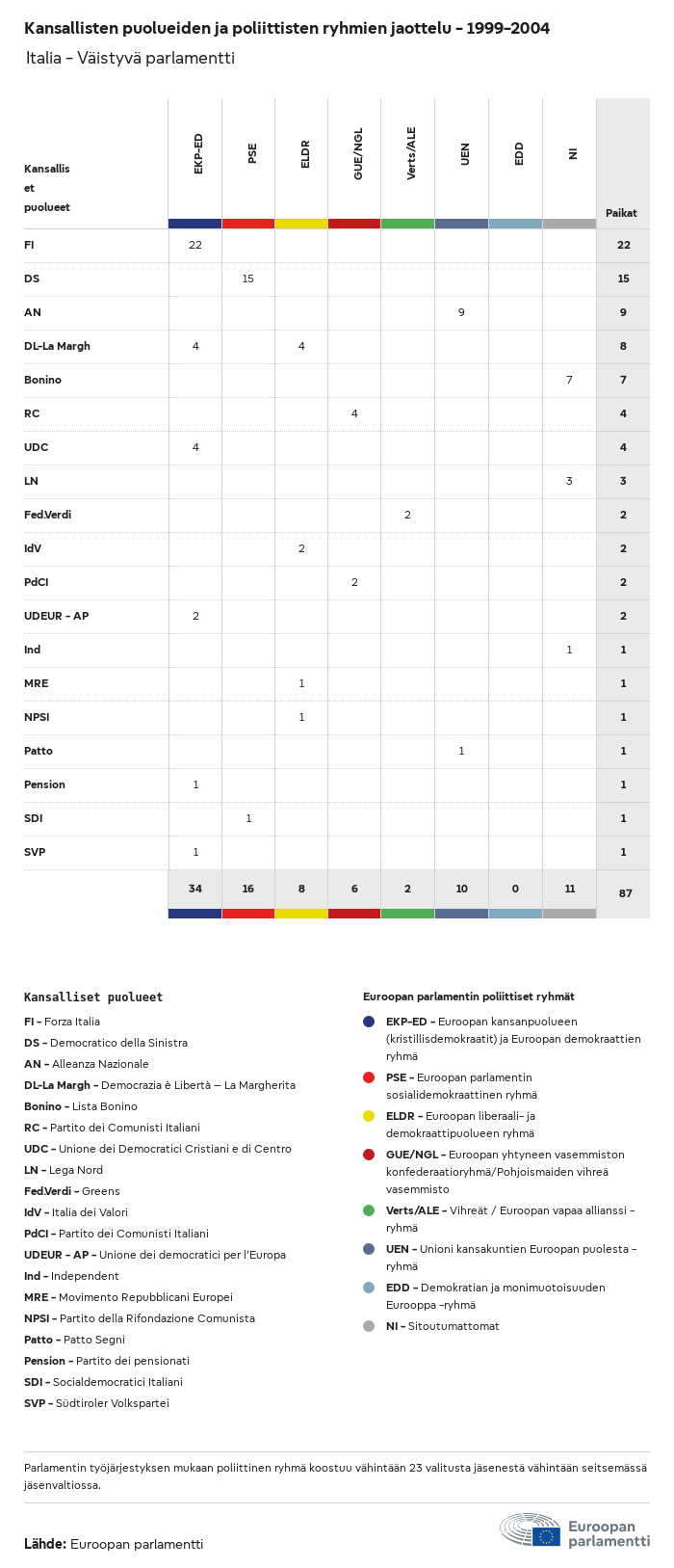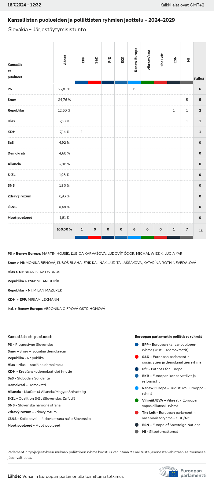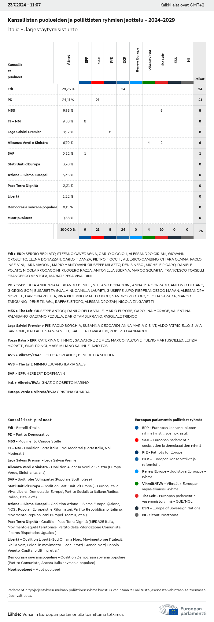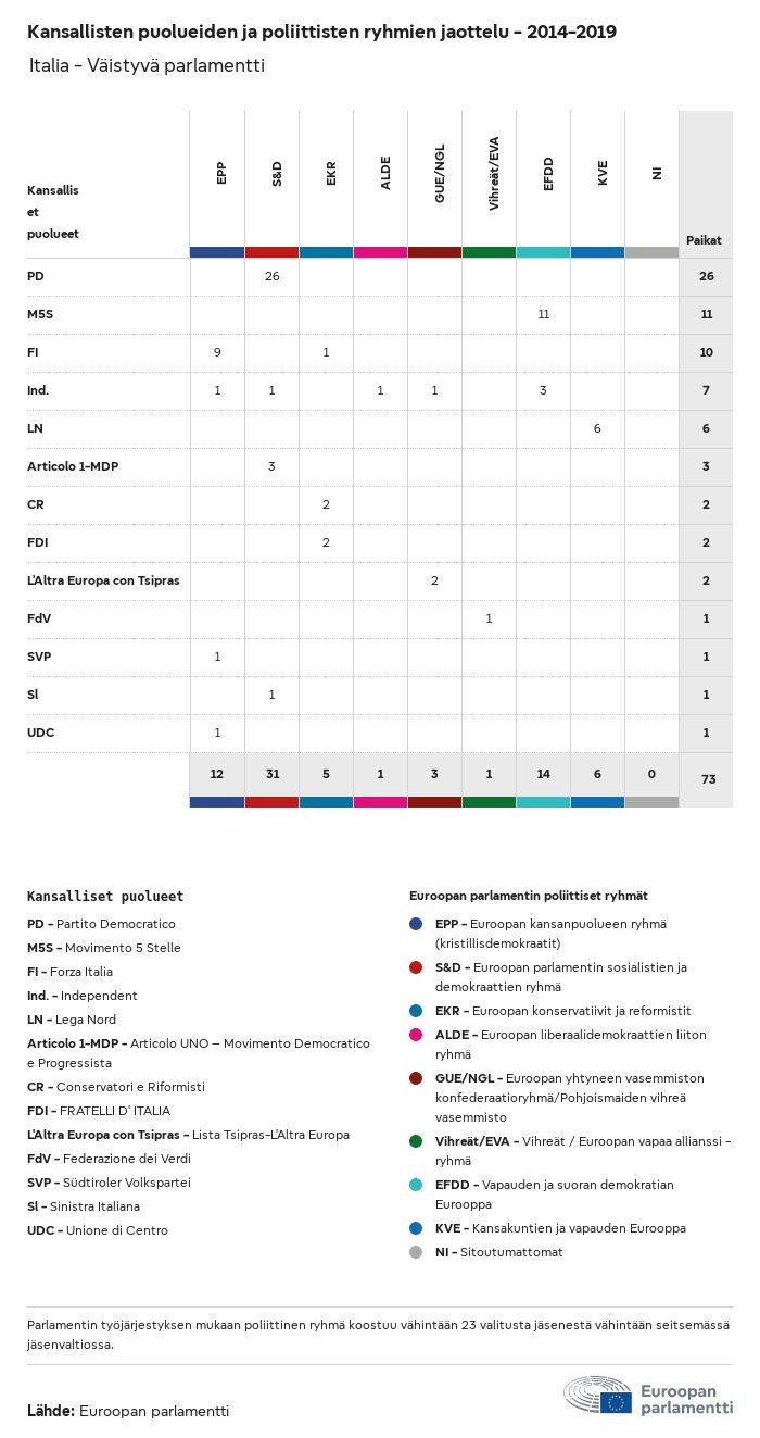 Kaikkien eurovaalien vaalitiedot vuodesta 1979 alkaen voidaan ladata alta erilaisissa tiedostomuodoissa. Huomaa, että ladattavien tiedostojen ohessa on paikka digitaaliselle allekirjoitukselle. Nämä allekirjoitukset voidaan vahvistaa tällä todistuksella, joka voidaan puolestaan vahvistaa seuraavalla todistusketjulla. Tietoa vuoden 2024 EU-vaaleista. json Yleistä Nimikkeet (38 Ko) - Allekirjoitus Äänestysprosentti (32 Ko) - Allekirjoitus Sukupuolijakaumatietoa (7 Ko) - Allekirjoitus Poliittiset ryhmät (40 Ko) - Allekirjoitus Kansalliset puolueet (110 Ko) - Allekirjoitus Tietoa EU-vaaleista (1 Ko) - Allekirjoitus Vaalitulokset be (7 Ko) - Allekirjoitus fbe (4 Ko) - Allekirjoitus gbe (2 Ko) - Allekirjoitus wbe (3 Ko) - Allekirjoitus bg (5 Ko) - Allekirjoitus cz (7 Ko) - Allekirjoitus dk (5 Ko) - Allekirjoitus de (8 Ko) - Allekirjoitus ee (4 Ko) - Allekirjoitus ie (5 Ko) - Allekirjoitus el (5 Ko) - Allekirjoitus es (7 Ko) - Allekirjoitus fr (8 Ko) - Allekirjoitus hr (3 Ko) - Allekirjoitus it (6 Ko) - Allekirjoitus cy (3 Ko) - Allekirjoitus lv (5 Ko) - Allekirjoitus lt (5 Ko) - Allekirjoitus lu (4 Ko) - Allekirjoitus hu (5 Ko) - Allekirjoitus mt (2 Ko) - Allekirjoitus nl (6 Ko) - Allekirjoitus at (3 Ko) - Allekirjoitus pl (7 Ko) - Allekirjoitus pt (5 Ko) - Allekirjoitus ro (5 Ko) - Allekirjoitus si (4 Ko) - Allekirjoitus sk (5 Ko) - Allekirjoitus fi (4 Ko) - Allekirjoitus se (4 Ko) - Allekirjoitus xml Yleistä Nimikkeet (63 Ko) - Allekirjoitus Äänestysprosentti (40 Ko) - Allekirjoitus Sukupuolijakaumatietoa (10 Ko) - Allekirjoitus Poliittiset ryhmät (64 Ko) - Allekirjoitus Kansalliset puolueet (123 Ko) - Allekirjoitus Tietoa EU-vaaleista (2 Ko) - Allekirjoitus Vaalitulokset be (10 Ko) - Allekirjoitus fbe (6 Ko) - Allekirjoitus gbe (3 Ko) - Allekirjoitus wbe (5 Ko) - Allekirjoitus bg (7 Ko) - Allekirjoitus cz (10 Ko) - Allekirjoitus dk (7 Ko) - Allekirjoitus de (11 Ko) - Allekirjoitus ee (6 Ko) - Allekirjoitus ie (7 Ko) - Allekirjoitus el (7 Ko) - Allekirjoitus es (11 Ko) - Allekirjoitus fr (12 Ko) - Allekirjoitus hr (5 Ko) - Allekirjoitus it (9 Ko) - Allekirjoitus cy (5 Ko) - Allekirjoitus lv (7 Ko) - Allekirjoitus lt (7 Ko) - Allekirjoitus lu (6 Ko) - Allekirjoitus hu (7 Ko) - Allekirjoitus mt (3 Ko) - Allekirjoitus nl (9 Ko) - Allekirjoitus at (5 Ko) - Allekirjoitus pl (10 Ko) - Allekirjoitus pt (7 Ko) - Allekirjoitus ro (8 Ko) - Allekirjoitus si (5 Ko) - Allekirjoitus sk (7 Ko) - Allekirjoitus fi (6 Ko) - Allekirjoitus se (6 Ko) - Allekirjoitus csv Äänestysprosentti Äänestysprosentti EU (1 Ko) - Allekirjoitus Äänestysprosentti maittain (5 Ko) - Allekirjoitus Nimikkeet (15 Ko) - Allekirjoitus Sukupuolijakaumatietoa Sukupuolijakauma EU (1 Ko) - Allekirjoitus Sukupuolijakauma maittain (2 Ko) - Allekirjoitus Poliittiset ryhmät (16 Ko) - Allekirjoitus Kansalliset puolueet (27 Ko) - Allekirjoitus Tulokset kansallisen puolueen mukaan be (1 Ko) - Allekirjoitus fbe (1 Ko) - Allekirjoitus gbe (1 Ko) - Allekirjoitus wbe (1 Ko) - Allekirjoitus bg (1 Ko) - Allekirjoitus cz (1 Ko) - Allekirjoitus dk (1 Ko) - Allekirjoitus de (1 Ko) - Allekirjoitus ee (1 Ko) - Allekirjoitus ie (1 Ko) - Allekirjoitus el (1 Ko) - Allekirjoitus es (1 Ko) - Allekirjoitus fr (1 Ko) - Allekirjoitus hr (1 Ko) - Allekirjoitus it (1 Ko) - Allekirjoitus cy (1 Ko) - Allekirjoitus lv (1 Ko) - Allekirjoitus lt (1 Ko) - Allekirjoitus lu (1 Ko) - Allekirjoitus hu (1 Ko) - Allekirjoitus mt (1 Ko) - Allekirjoitus nl (1 Ko) - Allekirjoitus at (1 Ko) - Allekirjoitus pl (1 Ko) - Allekirjoitus pt (1 Ko) - Allekirjoitus ro (1 Ko) - Allekirjoitus si (1 Ko) - Allekirjoitus sk (1 Ko) - Allekirjoitus fi (1 Ko) - Allekirjoitus se (1 Ko) - Allekirjoitus Tulokset poliittisen ryhmän mukaan EU (1 Ko) - Allekirjoitus be (1 Ko) - Allekirjoitus fbe (1 Ko) - Allekirjoitus gbe (1 Ko) - Allekirjoitus wbe (1 Ko) - Allekirjoitus bg (1 Ko) - Allekirjoitus cz (1 Ko) - Allekirjoitus dk (1 Ko) - Allekirjoitus de (1 Ko) - Allekirjoitus ee (1 Ko) - Allekirjoitus ie (1 Ko) - Allekirjoitus el (1 Ko) - Allekirjoitus es (1 Ko) - Allekirjoitus fr (1 Ko) - Allekirjoitus hr (1 Ko) - Allekirjoitus it (1 Ko) - Allekirjoitus cy (1 Ko) - Allekirjoitus lv (1 Ko) - Allekirjoitus lt (1 Ko) - Allekirjoitus lu (1 Ko) - Allekirjoitus hu (1 Ko) - Allekirjoitus mt (1 Ko) - Allekirjoitus nl (1 Ko) - Allekirjoitus at (1 Ko) - Allekirjoitus pl (1 Ko) - Allekirjoitus pt (1 Ko) - Allekirjoitus ro (1 Ko) - Allekirjoitus si (1 Ko) - Allekirjoitus sk (1 Ko) - Allekirjoitus fi (1 Ko) - Allekirjoitus se (1 Ko) - Allekirjoitus Jaottelu kansallisten puolueiden ja poliittisten ryhmien mukaan be (1 Ko) - Allekirjoitus fbe (1 Ko) - Allekirjoitus gbe (1 Ko) - Allekirjoitus wbe (1 Ko) - Allekirjoitus bg (1 Ko) - Allekirjoitus cz (1 Ko) - Allekirjoitus dk (1 Ko) - Allekirjoitus de (1 Ko) - Allekirjoitus ee (1 Ko) - Allekirjoitus ie (1 Ko) - Allekirjoitus el (1 Ko) - Allekirjoitus es (1 Ko) - Allekirjoitus fr (1 Ko) - Allekirjoitus hr (1 Ko) - Allekirjoitus it (1 Ko) - Allekirjoitus cy (1 Ko) - Allekirjoitus lv (1 Ko) - Allekirjoitus lt (1 Ko) - Allekirjoitus lu (1 Ko) - Allekirjoitus hu (1 Ko) - Allekirjoitus mt (1 Ko) - Allekirjoitus nl (1 Ko) - Allekirjoitus at (1 Ko) - Allekirjoitus pl (1 Ko) - Allekirjoitus pt (1 Ko) - Allekirjoitus ro (1 Ko) - Allekirjoitus si (1 Ko) - Allekirjoitus sk (1 Ko) - Allekirjoitus fi (1 Ko) - Allekirjoitus se (1 Ko) - Allekirjoitus jpg Äänestysprosentti Äänestysprosentti vuosittain (~30 Ko) Äänestysprosentti maittain (~140 Ko) Meppien sukupuolijakauma Meppien sukupuolijakauma maittain Kartta (~130 Ko) Pylväsdiagrammi (~80 Ko) Meppien sukupuolijakauma vuosittain (~50 Ko) Vaalitulokset Eurooppaa koskevat tiedot Istuntosali (~110 Ko) Euroopan parlamentti (~250 Ko) Kansalliset tiedot BE Tulokset kansallisen puolueen mukaan (~90 Ko) Paikat poliittisen ryhmän mukaan (~70 Ko) Jaottelu kansallisten puolueiden ja poliittisten ryhmien mukaan (~180 Ko) Meppien sukupuolijakauma vuosittain (~50 Ko) Äänestysprosentti vuosittain (~50 Ko) FBE Tulokset kan