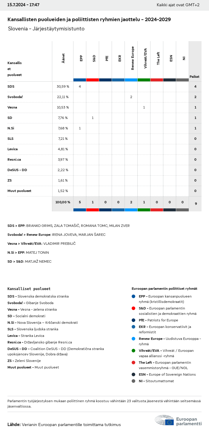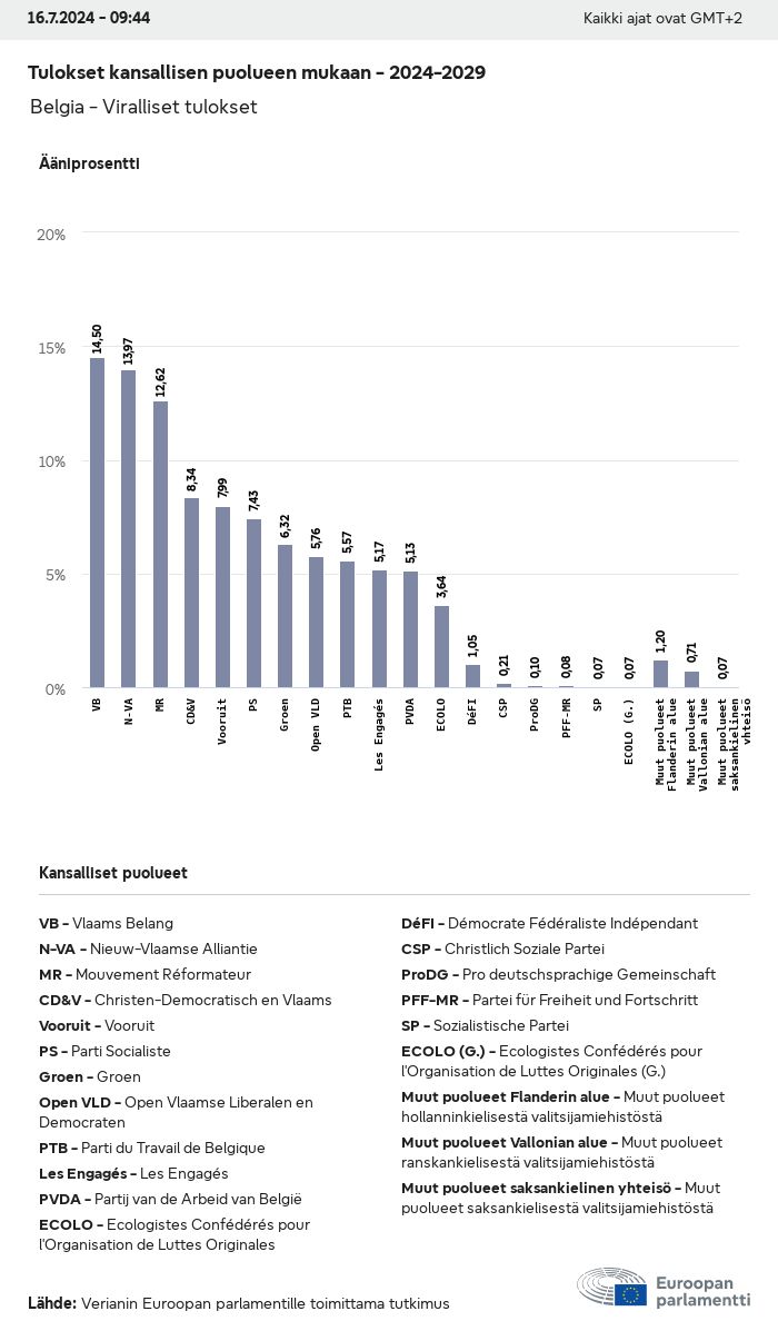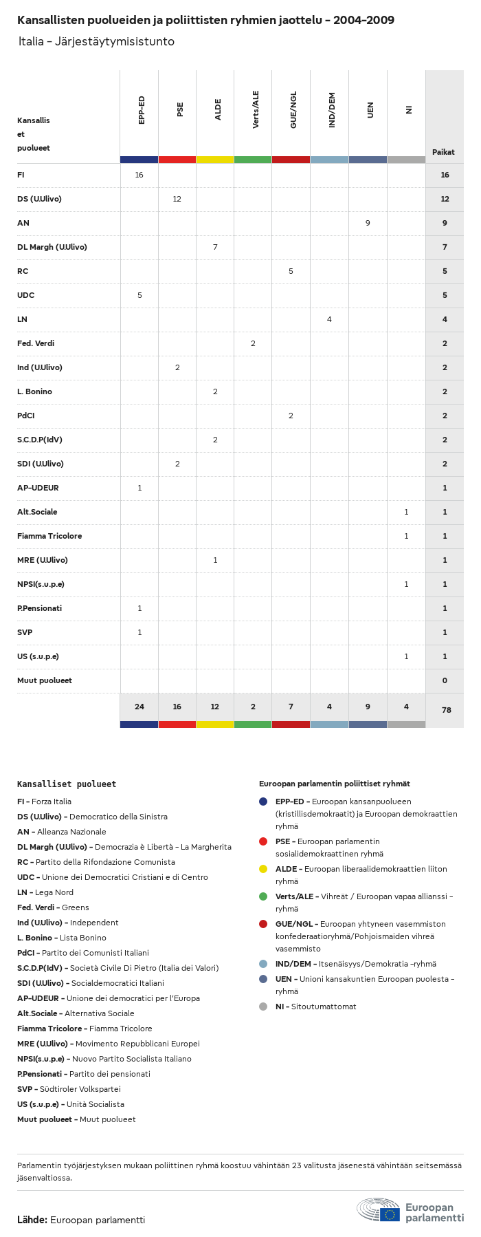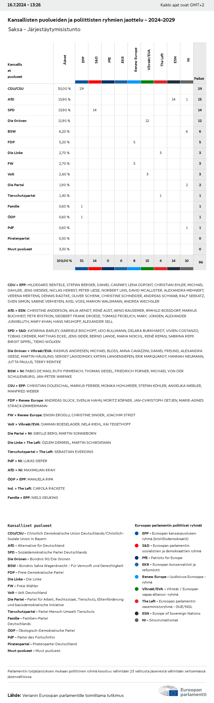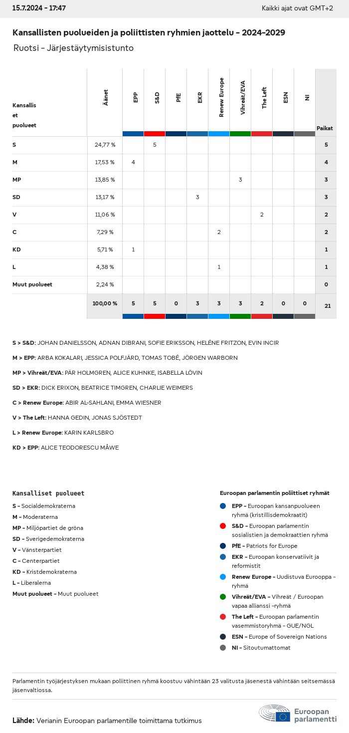 Kaikkien eurovaalien vaalitiedot vuodesta 1979 alkaen voidaan ladata alta erilaisissa tiedostomuodoissa. Huomaa, että ladattavien tiedostojen ohessa on paikka digitaaliselle allekirjoitukselle. Nämä allekirjoitukset voidaan vahvistaa tällä todistuksella, joka voidaan puolestaan vahvistaa seuraavalla todistusketjulla. Tietoa vuoden 2024 EU-vaaleista. json Yleistä Nimikkeet (38 Ko) - Allekirjoitus Äänestysprosentti (32 Ko) - Allekirjoitus Sukupuolijakaumatietoa (7 Ko) - Allekirjoitus Poliittiset ryhmät (40 Ko) - Allekirjoitus Kansalliset puolueet (110 Ko) - Allekirjoitus Tietoa EU-vaaleista (1 Ko) - Allekirjoitus Vaalitulokset be (7 Ko) - Allekirjoitus fbe (4 Ko) - Allekirjoitus gbe (2 Ko) - Allekirjoitus wbe (3 Ko) - Allekirjoitus bg (5 Ko) - Allekirjoitus cz (7 Ko) - Allekirjoitus dk (5 Ko) - Allekirjoitus de (8 Ko) - Allekirjoitus ee (4 Ko) - Allekirjoitus ie (5 Ko) - Allekirjoitus el (5 Ko) - Allekirjoitus es (7 Ko) - Allekirjoitus fr (8 Ko) - Allekirjoitus hr (3 Ko) - Allekirjoitus it (6 Ko) - Allekirjoitus cy (3 Ko) - Allekirjoitus lv (5 Ko) - Allekirjoitus lt (5 Ko) - Allekirjoitus lu (4 Ko) - Allekirjoitus hu (5 Ko) - Allekirjoitus mt (2 Ko) - Allekirjoitus nl (6 Ko) - Allekirjoitus at (3 Ko) - Allekirjoitus pl (7 Ko) - Allekirjoitus pt (5 Ko) - Allekirjoitus ro (5 Ko) - Allekirjoitus si (4 Ko) - Allekirjoitus sk (5 Ko) - Allekirjoitus fi (4 Ko) - Allekirjoitus se (4 Ko) - Allekirjoitus xml Yleistä Nimikkeet (63 Ko) - Allekirjoitus Äänestysprosentti (40 Ko) - Allekirjoitus Sukupuolijakaumatietoa (10 Ko) - Allekirjoitus Poliittiset ryhmät (64 Ko) - Allekirjoitus Kansalliset puolueet (123 Ko) - Allekirjoitus Tietoa EU-vaaleista (2 Ko) - Allekirjoitus Vaalitulokset be (10 Ko) - Allekirjoitus fbe (6 Ko) - Allekirjoitus gbe (3 Ko) - Allekirjoitus wbe (5 Ko) - Allekirjoitus bg (7 Ko) - Allekirjoitus cz (10 Ko) - Allekirjoitus dk (7 Ko) - Allekirjoitus de (11 Ko) - Allekirjoitus ee (6 Ko) - Allekirjoitus ie (7 Ko) - Allekirjoitus el (7 Ko) - Allekirjoitus es (11 Ko) - Allekirjoitus fr (12 Ko) - Allekirjoitus hr (5 Ko) - Allekirjoitus it (9 Ko) - Allekirjoitus cy (5 Ko) - Allekirjoitus lv (7 Ko) - Allekirjoitus lt (7 Ko) - Allekirjoitus lu (6 Ko) - Allekirjoitus hu (7 Ko) - Allekirjoitus mt (3 Ko) - Allekirjoitus nl (9 Ko) - Allekirjoitus at (5 Ko) - Allekirjoitus pl (10 Ko) - Allekirjoitus pt (7 Ko) - Allekirjoitus ro (8 Ko) - Allekirjoitus si (5 Ko) - Allekirjoitus sk (7 Ko) - Allekirjoitus fi (6 Ko) - Allekirjoitus se (6 Ko) - Allekirjoitus csv Äänestysprosentti Äänestysprosentti EU (1 Ko) - Allekirjoitus Äänestysprosentti maittain (5 Ko) - Allekirjoitus Nimikkeet (15 Ko) - Allekirjoitus Sukupuolijakaumatietoa Sukupuolijakauma EU (1 Ko) - Allekirjoitus Sukupuolijakauma maittain (2 Ko) - Allekirjoitus Poliittiset ryhmät (16 Ko) - Allekirjoitus Kansalliset puolueet (27 Ko) - Allekirjoitus Tulokset kansallisen puolueen mukaan be (1 Ko) - Allekirjoitus fbe (1 Ko) - Allekirjoitus gbe (1 Ko) - Allekirjoitus wbe (1 Ko) - Allekirjoitus bg (1 Ko) - Allekirjoitus cz (1 Ko) - Allekirjoitus dk (1 Ko) - Allekirjoitus de (1 Ko) - Allekirjoitus ee (1 Ko) - Allekirjoitus ie (1 Ko) - Allekirjoitus el (1 Ko) - Allekirjoitus es (1 Ko) - Allekirjoitus fr (1 Ko) - Allekirjoitus hr (1 Ko) - Allekirjoitus it (1 Ko) - Allekirjoitus cy (1 Ko) - Allekirjoitus lv (1 Ko) - Allekirjoitus lt (1 Ko) - Allekirjoitus lu (1 Ko) - Allekirjoitus hu (1 Ko) - Allekirjoitus mt (1 Ko) - Allekirjoitus nl (1 Ko) - Allekirjoitus at (1 Ko) - Allekirjoitus pl (1 Ko) - Allekirjoitus pt (1 Ko) - Allekirjoitus ro (1 Ko) - Allekirjoitus si (1 Ko) - Allekirjoitus sk (1 Ko) - Allekirjoitus fi (1 Ko) - Allekirjoitus se (1 Ko) - Allekirjoitus Tulokset poliittisen ryhmän mukaan EU (1 Ko) - Allekirjoitus be (1 Ko) - Allekirjoitus fbe (1 Ko) - Allekirjoitus gbe (1 Ko) - Allekirjoitus wbe (1 Ko) - Allekirjoitus bg (1 Ko) - Allekirjoitus cz (1 Ko) - Allekirjoitus dk (1 Ko) - Allekirjoitus de (1 Ko) - Allekirjoitus ee (1 Ko) - Allekirjoitus ie (1 Ko) - Allekirjoitus el (1 Ko) - Allekirjoitus es (1 Ko) - Allekirjoitus fr (1 Ko) - Allekirjoitus hr (1 Ko) - Allekirjoitus it (1 Ko) - Allekirjoitus cy (1 Ko) - Allekirjoitus lv (1 Ko) - Allekirjoitus lt (1 Ko) - Allekirjoitus lu (1 Ko) - Allekirjoitus hu (1 Ko) - Allekirjoitus mt (1 Ko) - Allekirjoitus nl (1 Ko) - Allekirjoitus at (1 Ko) - Allekirjoitus pl (1 Ko) - Allekirjoitus pt (1 Ko) - Allekirjoitus ro (1 Ko) - Allekirjoitus si (1 Ko) - Allekirjoitus sk (1 Ko) - Allekirjoitus fi (1 Ko) - Allekirjoitus se (1 Ko) - Allekirjoitus Jaottelu kansallisten puolueiden ja poliittisten ryhmien mukaan be (1 Ko) - Allekirjoitus fbe (1 Ko) - Allekirjoitus gbe (1 Ko) - Allekirjoitus wbe (1 Ko) - Allekirjoitus bg (1 Ko) - Allekirjoitus cz (1 Ko) - Allekirjoitus dk (1 Ko) - Allekirjoitus de (1 Ko) - Allekirjoitus ee (1 Ko) - Allekirjoitus ie (1 Ko) - Allekirjoitus el (1 Ko) - Allekirjoitus es (1 Ko) - Allekirjoitus fr (1 Ko) - Allekirjoitus hr (1 Ko) - Allekirjoitus it (1 Ko) - Allekirjoitus cy (1 Ko) - Allekirjoitus lv (1 Ko) - Allekirjoitus lt (1 Ko) - Allekirjoitus lu (1 Ko) - Allekirjoitus hu (1 Ko) - Allekirjoitus mt (1 Ko) - Allekirjoitus nl (1 Ko) - Allekirjoitus at (1 Ko) - Allekirjoitus pl (1 Ko) - Allekirjoitus pt (1 Ko) - Allekirjoitus ro (1 Ko) - Allekirjoitus si (1 Ko) - Allekirjoitus sk (1 Ko) - Allekirjoitus fi (1 Ko) - Allekirjoitus se (1 Ko) - Allekirjoitus jpg Äänestysprosentti Äänestysprosentti vuosittain (~30 Ko) Äänestysprosentti maittain (~140 Ko) Meppien sukupuolijakauma Meppien sukupuolijakauma maittain Kartta (~130 Ko) Pylväsdiagrammi (~80 Ko) Meppien sukupuolijakauma vuosittain (~50 Ko) Vaalitulokset Eurooppaa koskevat tiedot Istuntosali (~110 Ko) Euroopan parlamentti (~250 Ko) Kansalliset tiedot BE Tulokset kansallisen puolueen mukaan (~90 Ko) Paikat poliittisen ryhmän mukaan (~70 Ko) Jaottelu kansallisten puolueiden ja poliittisten ryhmien mukaan (~180 Ko) Meppien sukupuolijakauma vuosittain (~50 Ko) Äänestysprosentti vuosittain (~50 Ko) FBE Tulokset kan