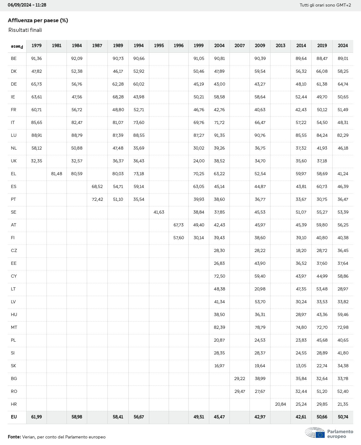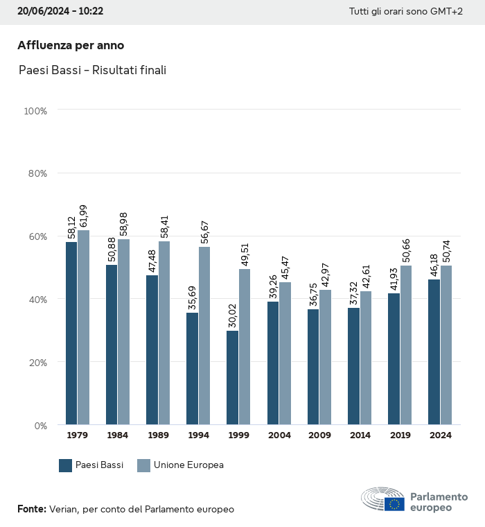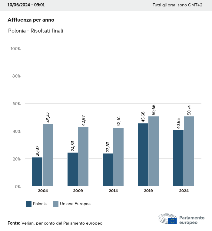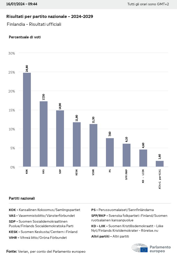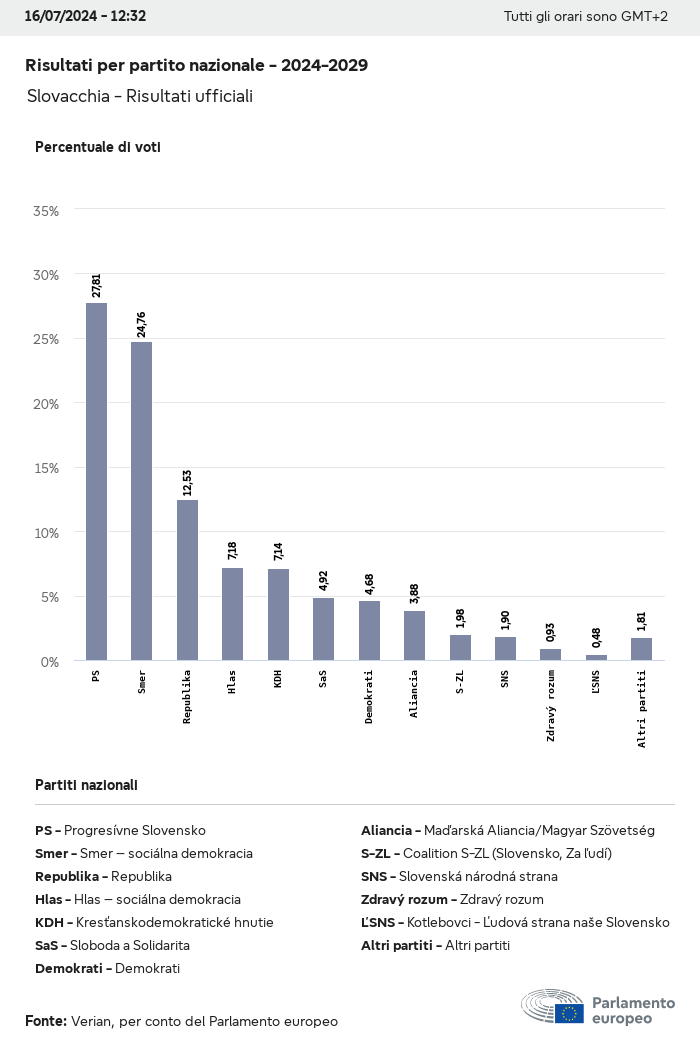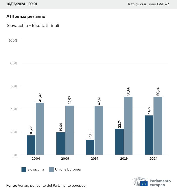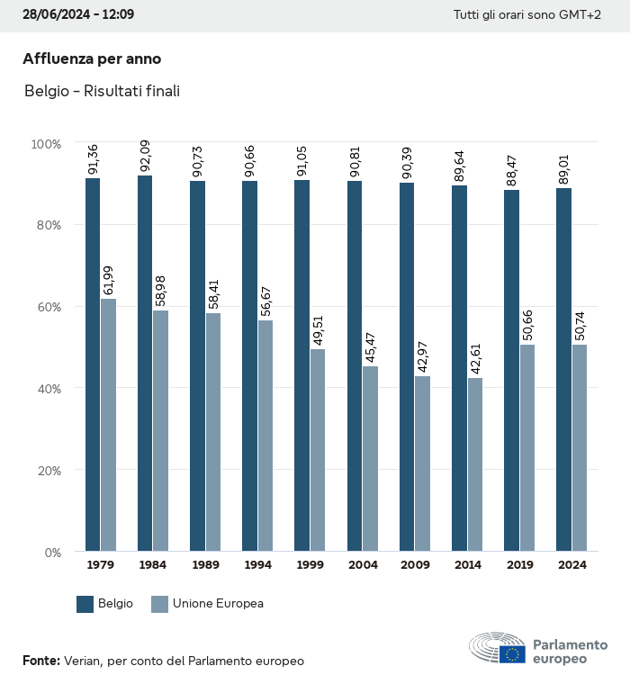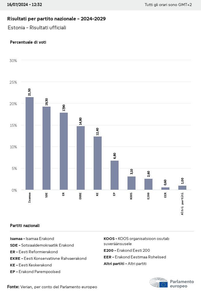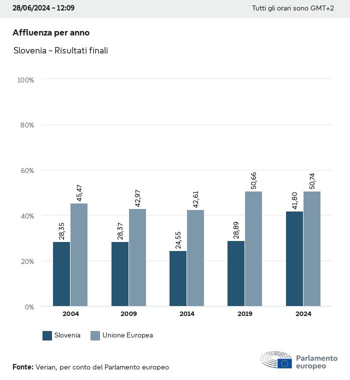 I dati elettorali, per tutte le elezioni europee dal 1979, possono essere scaricati qui sotto in diversi formati. Tenere presente che i file disponibili per il download vengono forniti con una firma digitale accanto ad essi. Le firme possono essere convalidate utilizzando questo certificato, che a sua volta può essere convalidato utilizzando la seguente catena di certificati. Dati delle elezioni europee del 2024. json Comune Etichette (38 Ko) - Firma Affluenza (32 Ko) - Firma Dati sull'equilibrio di genere (7 Ko) - Firma Gruppi politici (40 Ko) - Firma Partiti nazionali (110 Ko) - Firma Dati delle elezioni europee (1 Ko) - Firma Risultati delle elezioni be (7 Ko) - Firma fbe (4 Ko) - Firma gbe (2 Ko) - Firma wbe (3 Ko) - Firma bg (5 Ko) - Firma cz (7 Ko) - Firma dk (5 Ko) - Firma de (8 Ko) - Firma ee (4 Ko) - Firma ie (5 Ko) - Firma el (5 Ko) - Firma es (7 Ko) - Firma fr (8 Ko) - Firma hr (3 Ko) - Firma it (6 Ko) - Firma cy (3 Ko) - Firma lv (5 Ko) - Firma lt (5 Ko) - Firma lu (4 Ko) - Firma hu (5 Ko) - Firma mt (2 Ko) - Firma nl (6 Ko) - Firma at (3 Ko) - Firma pl (7 Ko) - Firma pt (5 Ko) - Firma ro (5 Ko) - Firma si (4 Ko) - Firma sk (5 Ko) - Firma fi (4 Ko) - Firma se (4 Ko) - Firma xml Comune Etichette (63 Ko) - Firma Affluenza (40 Ko) - Firma Dati sull'equilibrio di genere (10 Ko) - Firma Gruppi politici (64 Ko) - Firma Partiti nazionali (123 Ko) - Firma Dati delle elezioni europee (2 Ko) - Firma Risultati delle elezioni be (10 Ko) - Firma fbe (6 Ko) - Firma gbe (3 Ko) - Firma wbe (5 Ko) - Firma bg (7 Ko) - Firma cz (10 Ko) - Firma dk (7 Ko) - Firma de (11 Ko) - Firma ee (6 Ko) - Firma ie (7 Ko) - Firma el (7 Ko) - Firma es (11 Ko) - Firma fr (12 Ko) - Firma hr (5 Ko) - Firma it (9 Ko) - Firma cy (5 Ko) - Firma lv (7 Ko) - Firma lt (7 Ko) - Firma lu (6 Ko) - Firma hu (7 Ko) - Firma mt (3 Ko) - Firma nl (9 Ko) - Firma at (5 Ko) - Firma pl (10 Ko) - Firma pt (7 Ko) - Firma ro (8 Ko) - Firma si (5 Ko) - Firma sk (7 Ko) - Firma fi (6 Ko) - Firma se (6 Ko) - Firma csv Affluenza Affluenza UE (1 Ko) - Firma Affluenza per paese (5 Ko) - Firma Etichette (15 Ko) - Firma Dati sull'equilibrio di genere Equilibrio di genere UE (1 Ko) - Firma Equilibrio di genere per paese (2 Ko) - Firma Gruppi politici (16 Ko) - Firma Partiti nazionali (27 Ko) - Firma Risultati per partito nazionale be (1 Ko) - Firma fbe (1 Ko) - Firma gbe (1 Ko) - Firma wbe (1 Ko) - Firma bg (1 Ko) - Firma cz (1 Ko) - Firma dk (1 Ko) - Firma de (1 Ko) - Firma ee (1 Ko) - Firma ie (1 Ko) - Firma el (1 Ko) - Firma es (1 Ko) - Firma fr (1 Ko) - Firma hr (1 Ko) - Firma it (1 Ko) - Firma cy (1 Ko) - Firma lv (1 Ko) - Firma lt (1 Ko) - Firma lu (1 Ko) - Firma hu (1 Ko) - Firma mt (1 Ko) - Firma nl (1 Ko) - Firma at (1 Ko) - Firma pl (1 Ko) - Firma pt (1 Ko) - Firma ro (1 Ko) - Firma si (1 Ko) - Firma sk (1 Ko) - Firma fi (1 Ko) - Firma se (1 Ko) - Firma Risultati per gruppo politico EU (1 Ko) - Firma be (1 Ko) - Firma fbe (1 Ko) - Firma gbe (1 Ko) - Firma wbe (1 Ko) - Firma bg (1 Ko) - Firma cz (1 Ko) - Firma dk (1 Ko) - Firma de (1 Ko) - Firma ee (1 Ko) - Firma ie (1 Ko) - Firma el (1 Ko) - Firma es (1 Ko) - Firma fr (1 Ko) - Firma hr (1 Ko) - Firma it (1 Ko) - Firma cy (1 Ko) - Firma lv (1 Ko) - Firma lt (1 Ko) - Firma lu (1 Ko) - Firma hu (1 Ko) - Firma mt (1 Ko) - Firma nl (1 Ko) - Firma at (1 Ko) - Firma pl (1 Ko) - Firma pt (1 Ko) - Firma ro (1 Ko) - Firma si (1 Ko) - Firma sk (1 Ko) - Firma fi (1 Ko) - Firma se (1 Ko) - Firma Suddivisione per partiti nazionali e gruppi politici be (1 Ko) - Firma fbe (1 Ko) - Firma gbe (1 Ko) - Firma wbe (1 Ko) - Firma bg (1 Ko) - Firma cz (1 Ko) - Firma dk (1 Ko) - Firma de (1 Ko) - Firma ee (1 Ko) - Firma ie (1 Ko) - Firma el (1 Ko) - Firma es (1 Ko) - Firma fr (1 Ko) - Firma hr (1 Ko) - Firma it (1 Ko) - Firma cy (1 Ko) - Firma lv (1 Ko) - Firma lt (1 Ko) - Firma lu (1 Ko) - Firma hu (1 Ko) - Firma mt (1 Ko) - Firma nl (1 Ko) - Firma at (1 Ko) - Firma pl (1 Ko) - Firma pt (1 Ko) - Firma ro (1 Ko) - Firma si (1 Ko) - Firma sk (1 Ko) - Firma fi (1 Ko) - Firma se (1 Ko) - Firma jpg Affluenza Affluenza per anno (~30 Ko) Affluenza per paese (~140 Ko) Equilibrio di genere degli eurodeputati Equilibrio di genere degli eurodeputati per paese Mappa (~130 Ko) Grafico a barre (~80 Ko) Equilibrio di genere degli eurodeputati per anno (~50 Ko) Risultati delle elezioni Dati europei Emiciclo (~110 Ko) Parlamento europeo (~250 Ko) Dati nazionali BE Risultati per partito nazionale (~90 Ko) Seggi per gruppo politico (~70 Ko) Suddivisione per partiti nazionali e gruppi politici (~180 Ko) Equilibrio di genere degli eurodeputati per anno (~50 Ko) Affluenza per anno (~50 Ko) FBE Risultati per partito nazionale (~90 Ko) Seggi per gruppo politico (~70 Ko) Suddivisione per partiti nazionali e gruppi politici (~180 Ko) GBE Risultati per partito nazionale (~90 Ko) Seggi per gruppo politico (~70 Ko) Suddivisione per partiti nazionali e gruppi politici (~180 Ko) WBE Risultati per partito nazionale (~90 Ko) Seggi per gruppo politico (~70 Ko) Suddivisione per partiti nazionali e gruppi politici (~180 Ko) BG Risultati per partito nazionale (~90 Ko) Seggi per gruppo politico (~70 Ko) Suddivisione per partiti nazionali e gruppi politici (~180 Ko) Equilibrio di genere degli eurodeputati per anno (~50 Ko) Affluenza per anno (~50 Ko) CZ Risultati per partito nazionale (~90 Ko) Seggi per gruppo politico (~70 Ko) Suddivisione per partiti nazionali e gruppi politici (~180 Ko) Equilibrio di genere degli eurodeputati per anno (~50 Ko) Affluenza per anno (~50 Ko) DK Risultati per partito nazionale (~90 Ko) Seggi per gruppo politico (~70 Ko) Suddivisione per partiti nazionali e gruppi politici (~180 Ko) Equilibrio di genere degli eurodeputati per anno (~50 Ko) Affluenza per anno (~50 Ko) DE Risultati per partito nazionale (~90 Ko) Seggi per gruppo politico (~70 Ko) Suddivisione per partiti nazionali e gruppi politici (~180 Ko) Equilibrio di genere degli eurodeputati per anno (~50 Ko) Affluenza per anno (~50 Ko) EE Risultati per parti