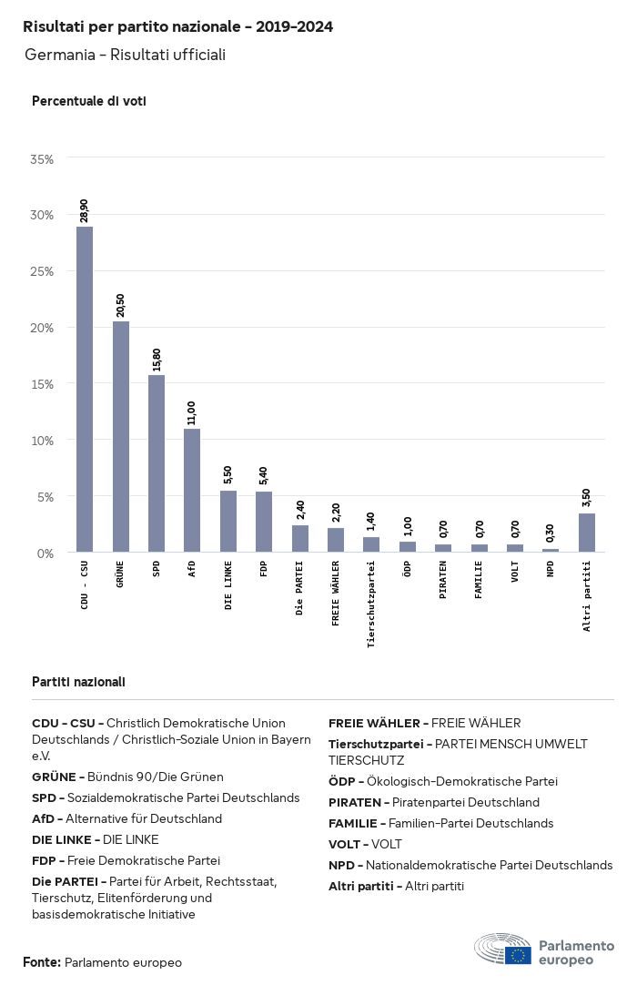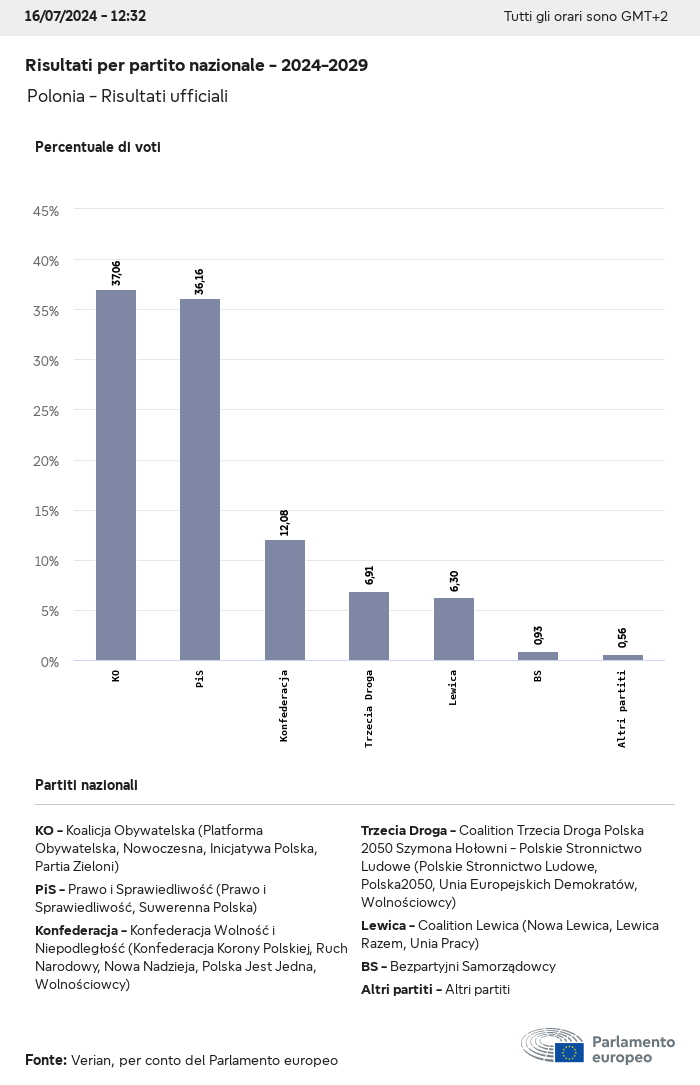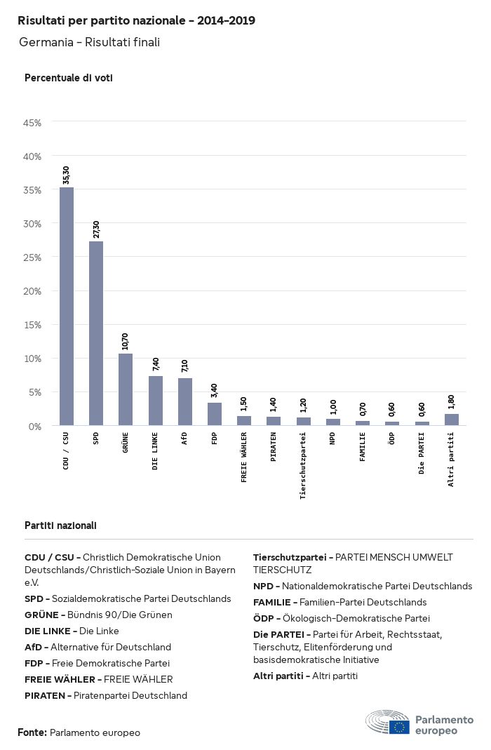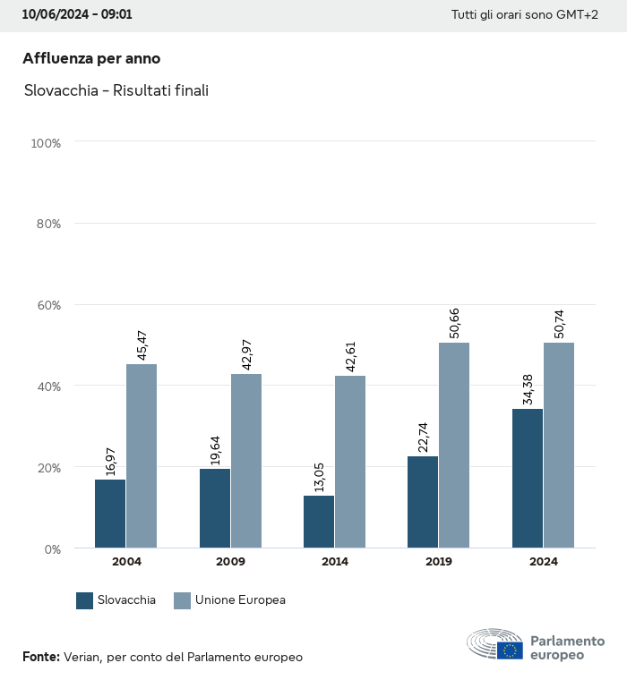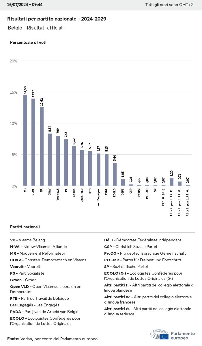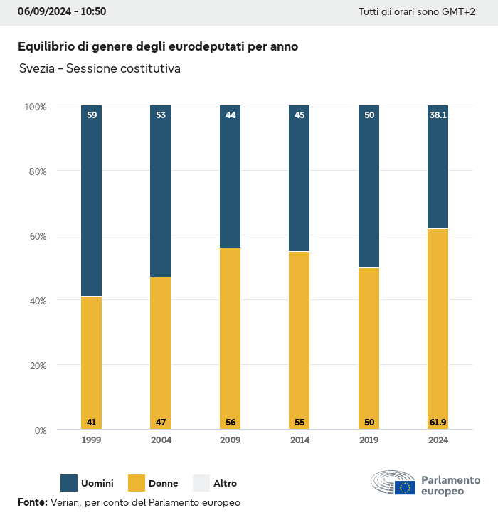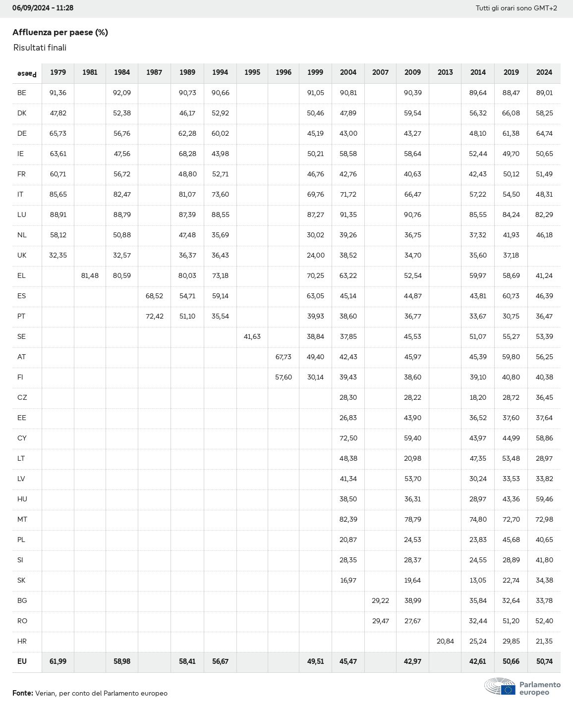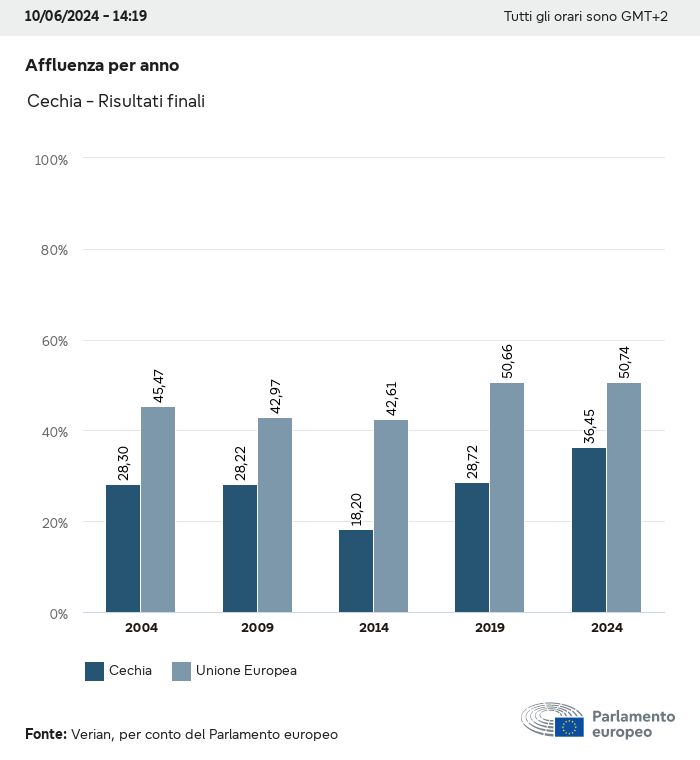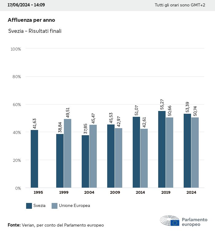 I dati elettorali, per tutte le elezioni europee dal 1979, possono essere scaricati qui sotto in diversi formati. Tenere presente che i file disponibili per il download vengono forniti con una firma digitale accanto ad essi. Le firme possono essere convalidate utilizzando questo certificato, che a sua volta può essere convalidato utilizzando la seguente catena di certificati. Dati delle elezioni europee del 2024. json Comune Etichette (38 Ko) - Firma Affluenza (32 Ko) - Firma Dati sull'equilibrio di genere (7 Ko) - Firma Gruppi politici (40 Ko) - Firma Partiti nazionali (110 Ko) - Firma Dati delle elezioni europee (1 Ko) - Firma Risultati delle elezioni be (7 Ko) - Firma fbe (4 Ko) - Firma gbe (2 Ko) - Firma wbe (3 Ko) - Firma bg (5 Ko) - Firma cz (7 Ko) - Firma dk (5 Ko) - Firma de (8 Ko) - Firma ee (4 Ko) - Firma ie (5 Ko) - Firma el (5 Ko) - Firma es (7 Ko) - Firma fr (8 Ko) - Firma hr (3 Ko) - Firma it (6 Ko) - Firma cy (3 Ko) - Firma lv (5 Ko) - Firma lt (5 Ko) - Firma lu (4 Ko) - Firma hu (5 Ko) - Firma mt (2 Ko) - Firma nl (6 Ko) - Firma at (3 Ko) - Firma pl (7 Ko) - Firma pt (5 Ko) - Firma ro (5 Ko) - Firma si (4 Ko) - Firma sk (5 Ko) - Firma fi (4 Ko) - Firma se (4 Ko) - Firma xml Comune Etichette (63 Ko) - Firma Affluenza (40 Ko) - Firma Dati sull'equilibrio di genere (10 Ko) - Firma Gruppi politici (64 Ko) - Firma Partiti nazionali (123 Ko) - Firma Dati delle elezioni europee (2 Ko) - Firma Risultati delle elezioni be (10 Ko) - Firma fbe (6 Ko) - Firma gbe (3 Ko) - Firma wbe (5 Ko) - Firma bg (7 Ko) - Firma cz (10 Ko) - Firma dk (7 Ko) - Firma de (11 Ko) - Firma ee (6 Ko) - Firma ie (7 Ko) - Firma el (7 Ko) - Firma es (11 Ko) - Firma fr (12 Ko) - Firma hr (5 Ko) - Firma it (9 Ko) - Firma cy (5 Ko) - Firma lv (7 Ko) - Firma lt (7 Ko) - Firma lu (6 Ko) - Firma hu (7 Ko) - Firma mt (3 Ko) - Firma nl (9 Ko) - Firma at (5 Ko) - Firma pl (10 Ko) - Firma pt (7 Ko) - Firma ro (8 Ko) - Firma si (5 Ko) - Firma sk (7 Ko) - Firma fi (6 Ko) - Firma se (6 Ko) - Firma csv Affluenza Affluenza UE (1 Ko) - Firma Affluenza per paese (5 Ko) - Firma Etichette (15 Ko) - Firma Dati sull'equilibrio di genere Equilibrio di genere UE (1 Ko) - Firma Equilibrio di genere per paese (2 Ko) - Firma Gruppi politici (16 Ko) - Firma Partiti nazionali (27 Ko) - Firma Risultati per partito nazionale be (1 Ko) - Firma fbe (1 Ko) - Firma gbe (1 Ko) - Firma wbe (1 Ko) - Firma bg (1 Ko) - Firma cz (1 Ko) - Firma dk (1 Ko) - Firma de (1 Ko) - Firma ee (1 Ko) - Firma ie (1 Ko) - Firma el (1 Ko) - Firma es (1 Ko) - Firma fr (1 Ko) - Firma hr (1 Ko) - Firma it (1 Ko) - Firma cy (1 Ko) - Firma lv (1 Ko) - Firma lt (1 Ko) - Firma lu (1 Ko) - Firma hu (1 Ko) - Firma mt (1 Ko) - Firma nl (1 Ko) - Firma at (1 Ko) - Firma pl (1 Ko) - Firma pt (1 Ko) - Firma ro (1 Ko) - Firma si (1 Ko) - Firma sk (1 Ko) - Firma fi (1 Ko) - Firma se (1 Ko) - Firma Risultati per gruppo politico EU (1 Ko) - Firma be (1 Ko) - Firma fbe (1 Ko) - Firma gbe (1 Ko) - Firma wbe (1 Ko) - Firma bg (1 Ko) - Firma cz (1 Ko) - Firma dk (1 Ko) - Firma de (1 Ko) - Firma ee (1 Ko) - Firma ie (1 Ko) - Firma el (1 Ko) - Firma es (1 Ko) - Firma fr (1 Ko) - Firma hr (1 Ko) - Firma it (1 Ko) - Firma cy (1 Ko) - Firma lv (1 Ko) - Firma lt (1 Ko) - Firma lu (1 Ko) - Firma hu (1 Ko) - Firma mt (1 Ko) - Firma nl (1 Ko) - Firma at (1 Ko) - Firma pl (1 Ko) - Firma pt (1 Ko) - Firma ro (1 Ko) - Firma si (1 Ko) - Firma sk (1 Ko) - Firma fi (1 Ko) - Firma se (1 Ko) - Firma Suddivisione per partiti nazionali e gruppi politici be (1 Ko) - Firma fbe (1 Ko) - Firma gbe (1 Ko) - Firma wbe (1 Ko) - Firma bg (1 Ko) - Firma cz (1 Ko) - Firma dk (1 Ko) - Firma de (1 Ko) - Firma ee (1 Ko) - Firma ie (1 Ko) - Firma el (1 Ko) - Firma es (1 Ko) - Firma fr (1 Ko) - Firma hr (1 Ko) - Firma it (1 Ko) - Firma cy (1 Ko) - Firma lv (1 Ko) - Firma lt (1 Ko) - Firma lu (1 Ko) - Firma hu (1 Ko) - Firma mt (1 Ko) - Firma nl (1 Ko) - Firma at (1 Ko) - Firma pl (1 Ko) - Firma pt (1 Ko) - Firma ro (1 Ko) - Firma si (1 Ko) - Firma sk (1 Ko) - Firma fi (1 Ko) - Firma se (1 Ko) - Firma jpg Affluenza Affluenza per anno (~30 Ko) Affluenza per paese (~140 Ko) Equilibrio di genere degli eurodeputati Equilibrio di genere degli eurodeputati per paese Mappa (~130 Ko) Grafico a barre (~80 Ko) Equilibrio di genere degli eurodeputati per anno (~50 Ko) Risultati delle elezioni Dati europei Emiciclo (~110 Ko) Parlamento europeo (~250 Ko) Dati nazionali BE Risultati per partito nazionale (~90 Ko) Seggi per gruppo politico (~70 Ko) Suddivisione per partiti nazionali e gruppi politici (~180 Ko) Equilibrio di genere degli eurodeputati per anno (~50 Ko) Affluenza per anno (~50 Ko) FBE Risultati per partito nazionale (~90 Ko) Seggi per gruppo politico (~70 Ko) Suddivisione per partiti nazionali e gruppi politici (~180 Ko) GBE Risultati per partito nazionale (~90 Ko) Seggi per gruppo politico (~70 Ko) Suddivisione per partiti nazionali e gruppi politici (~180 Ko) WBE Risultati per partito nazionale (~90 Ko) Seggi per gruppo politico (~70 Ko) Suddivisione per partiti nazionali e gruppi politici (~180 Ko) BG Risultati per partito nazionale (~90 Ko) Seggi per gruppo politico (~70 Ko) Suddivisione per partiti nazionali e gruppi politici (~180 Ko) Equilibrio di genere degli eurodeputati per anno (~50 Ko) Affluenza per anno (~50 Ko) CZ Risultati per partito nazionale (~90 Ko) Seggi per gruppo politico (~70 Ko) Suddivisione per partiti nazionali e gruppi politici (~180 Ko) Equilibrio di genere degli eurodeputati per anno (~50 Ko) Affluenza per anno (~50 Ko) DK Risultati per partito nazionale (~90 Ko) Seggi per gruppo politico (~70 Ko) Suddivisione per partiti nazionali e gruppi politici (~180 Ko) Equilibrio di genere degli eurodeputati per anno (~50 Ko) Affluenza per anno (~50 Ko) DE Risultati per partito nazionale (~90 Ko) Seggi per gruppo politico (~70 Ko) Suddivisione per partiti nazionali e gruppi politici (~180 Ko) Equilibrio di genere degli eurodeputati per anno (~50 Ko) Affluenza per anno (~50 Ko) EE Risultati per parti