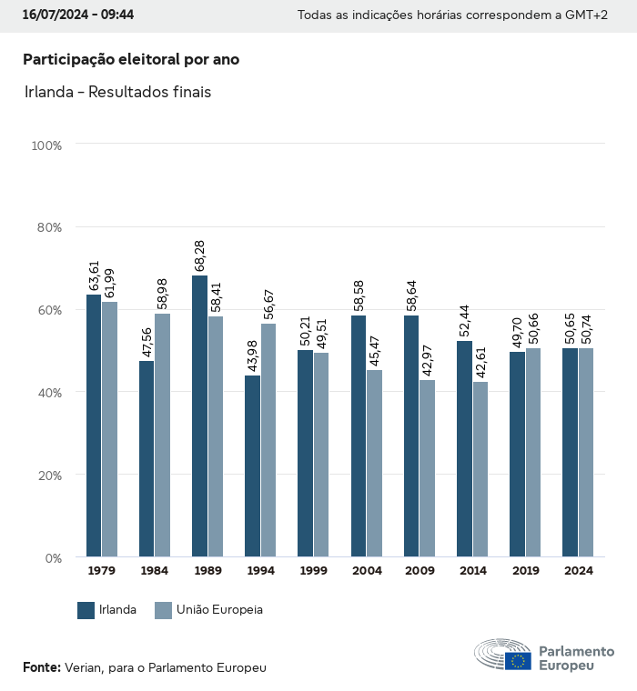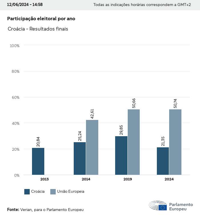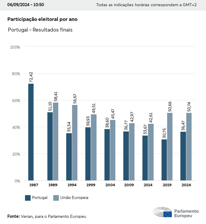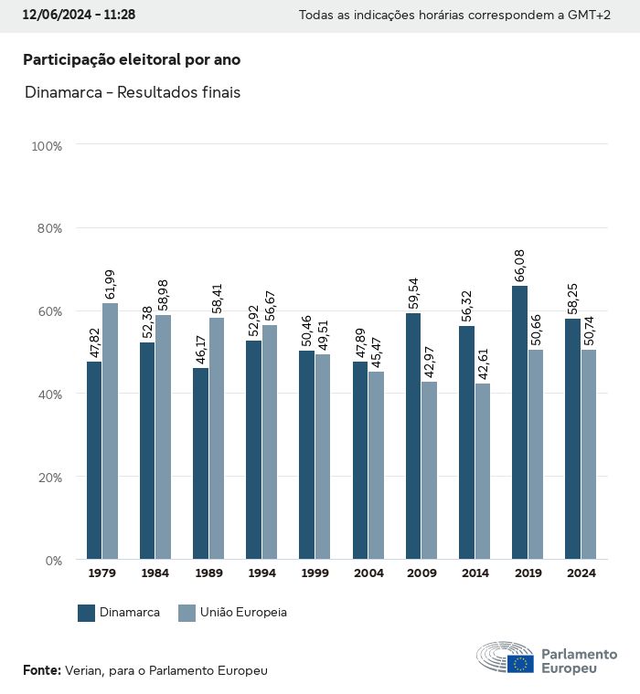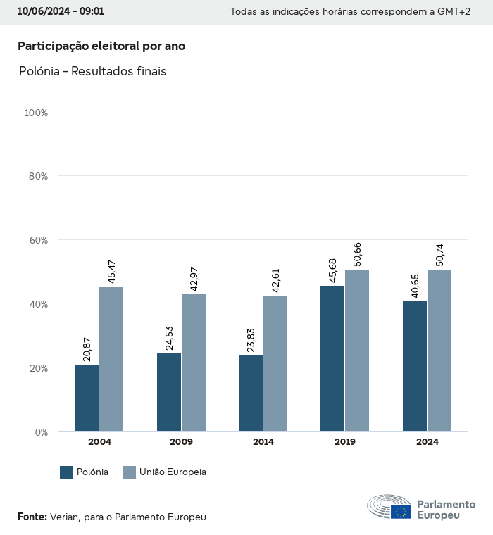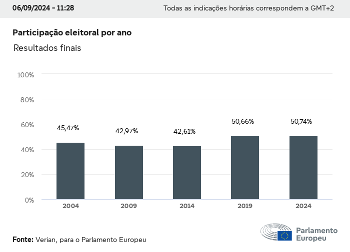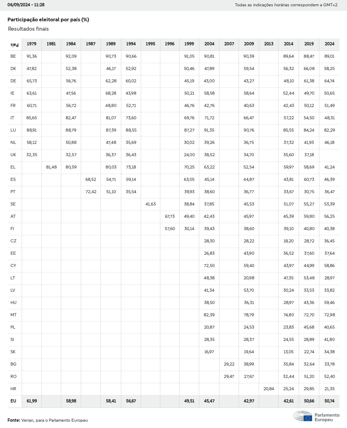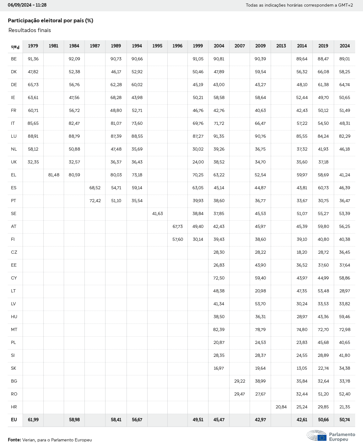 Os dados eleitorais relativos a todas as eleições europeias desde 1979 estão disponíveis abaixo e poderão ser descarregados em vários formatos. Note-se que os ficheiros disponíveis para descarregamento são fornecidos juntamente com uma assinatura digital colocada ao lado dos mesmos. Estas assinaturas podem ser validadas utilizando este certificado, que, por sua vez, pode ser validado utilizando a seguinte cadeia de certificados. Dados das eleições europeias de 2024. json Comum Etiquetas (38 Ko) - Assinatura Participação eleitoral (32 Ko) - Assinatura Dados sobre o equilíbrio de género (7 Ko) - Assinatura Grupos políticos (40 Ko) - Assinatura Partidos nacionais (110 Ko) - Assinatura Dados das eleições europeias (1 Ko) - Assinatura Resultados das eleições be (7 Ko) - Assinatura fbe (4 Ko) - Assinatura gbe (2 Ko) - Assinatura wbe (3 Ko) - Assinatura bg (5 Ko) - Assinatura cz (7 Ko) - Assinatura dk (5 Ko) - Assinatura de (8 Ko) - Assinatura ee (4 Ko) - Assinatura ie (5 Ko) - Assinatura el (5 Ko) - Assinatura es (7 Ko) - Assinatura fr (8 Ko) - Assinatura hr (3 Ko) - Assinatura it (6 Ko) - Assinatura cy (3 Ko) - Assinatura lv (5 Ko) - Assinatura lt (5 Ko) - Assinatura lu (4 Ko) - Assinatura hu (5 Ko) - Assinatura mt (2 Ko) - Assinatura nl (6 Ko) - Assinatura at (3 Ko) - Assinatura pl (7 Ko) - Assinatura pt (5 Ko) - Assinatura ro (5 Ko) - Assinatura si (4 Ko) - Assinatura sk (5 Ko) - Assinatura fi (4 Ko) - Assinatura se (4 Ko) - Assinatura xml Comum Etiquetas (63 Ko) - Assinatura Participação eleitoral (40 Ko) - Assinatura Dados sobre o equilíbrio de género (10 Ko) - Assinatura Grupos políticos (64 Ko) - Assinatura Partidos nacionais (123 Ko) - Assinatura Dados das eleições europeias (2 Ko) - Assinatura Resultados das eleições be (10 Ko) - Assinatura fbe (6 Ko) - Assinatura gbe (3 Ko) - Assinatura wbe (5 Ko) - Assinatura bg (7 Ko) - Assinatura cz (10 Ko) - Assinatura dk (7 Ko) - Assinatura de (11 Ko) - Assinatura ee (6 Ko) - Assinatura ie (7 Ko) - Assinatura el (7 Ko) - Assinatura es (11 Ko) - Assinatura fr (12 Ko) - Assinatura hr (5 Ko) - Assinatura it (9 Ko) - Assinatura cy (5 Ko) - Assinatura lv (7 Ko) - Assinatura lt (7 Ko) - Assinatura lu (6 Ko) - Assinatura hu (7 Ko) - Assinatura mt (3 Ko) - Assinatura nl (9 Ko) - Assinatura at (5 Ko) - Assinatura pl (10 Ko) - Assinatura pt (7 Ko) - Assinatura ro (8 Ko) - Assinatura si (5 Ko) - Assinatura sk (7 Ko) - Assinatura fi (6 Ko) - Assinatura se (6 Ko) - Assinatura csv Participação eleitoral Participação eleitoral a nível da UE (1 Ko) - Assinatura Participação eleitoral por país (5 Ko) - Assinatura Etiquetas (15 Ko) - Assinatura Dados sobre o equilíbrio de género Equilíbrio de género na UE (1 Ko) - Assinatura Equilíbrio de género por país (2 Ko) - Assinatura Grupos políticos (16 Ko) - Assinatura Partidos nacionais (27 Ko) - Assinatura Resultados por partido nacional be (1 Ko) - Assinatura fbe (1 Ko) - Assinatura gbe (1 Ko) - Assinatura wbe (1 Ko) - Assinatura bg (1 Ko) - Assinatura cz (1 Ko) - Assinatura dk (1 Ko) - Assinatura de (1 Ko) - Assinatura ee (1 Ko) - Assinatura ie (1 Ko) - Assinatura el (1 Ko) - Assinatura es (1 Ko) - Assinatura fr (1 Ko) - Assinatura hr (1 Ko) - Assinatura it (1 Ko) - Assinatura cy (1 Ko) - Assinatura lv (1 Ko) - Assinatura lt (1 Ko) - Assinatura lu (1 Ko) - Assinatura hu (1 Ko) - Assinatura mt (1 Ko) - Assinatura nl (1 Ko) - Assinatura at (1 Ko) - Assinatura pl (1 Ko) - Assinatura pt (1 Ko) - Assinatura ro (1 Ko) - Assinatura si (1 Ko) - Assinatura sk (1 Ko) - Assinatura fi (1 Ko) - Assinatura se (1 Ko) - Assinatura Resultados por grupo político EU (1 Ko) - Assinatura be (1 Ko) - Assinatura fbe (1 Ko) - Assinatura gbe (1 Ko) - Assinatura wbe (1 Ko) - Assinatura bg (1 Ko) - Assinatura cz (1 Ko) - Assinatura dk (1 Ko) - Assinatura de (1 Ko) - Assinatura ee (1 Ko) - Assinatura ie (1 Ko) - Assinatura el (1 Ko) - Assinatura es (1 Ko) - Assinatura fr (1 Ko) - Assinatura hr (1 Ko) - Assinatura it (1 Ko) - Assinatura cy (1 Ko) - Assinatura lv (1 Ko) - Assinatura lt (1 Ko) - Assinatura lu (1 Ko) - Assinatura hu (1 Ko) - Assinatura mt (1 Ko) - Assinatura nl (1 Ko) - Assinatura at (1 Ko) - Assinatura pl (1 Ko) - Assinatura pt (1 Ko) - Assinatura ro (1 Ko) - Assinatura si (1 Ko) - Assinatura sk (1 Ko) - Assinatura fi (1 Ko) - Assinatura se (1 Ko) - Assinatura Repartição por partidos nacionais e grupos políticos be (1 Ko) - Assinatura fbe (1 Ko) - Assinatura gbe (1 Ko) - Assinatura wbe (1 Ko) - Assinatura bg (1 Ko) - Assinatura cz (1 Ko) - Assinatura dk (1 Ko) - Assinatura de (1 Ko) - Assinatura ee (1 Ko) - Assinatura ie (1 Ko) - Assinatura el (1 Ko) - Assinatura es (1 Ko) - Assinatura fr (1 Ko) - Assinatura hr (1 Ko) - Assinatura it (1 Ko) - Assinatura cy (1 Ko) - Assinatura lv (1 Ko) - Assinatura lt (1 Ko) - Assinatura lu (1 Ko) - Assinatura hu (1 Ko) - Assinatura mt (1 Ko) - Assinatura nl (1 Ko) - Assinatura at (1 Ko) - Assinatura pl (1 Ko) - Assinatura pt (1 Ko) - Assinatura ro (1 Ko) - Assinatura si (1 Ko) - Assinatura sk (1 Ko) - Assinatura fi (1 Ko) - Assinatura se (1 Ko) - Assinatura jpg Participação eleitoral Participação eleitoral por ano (~30 Ko) Participação eleitoral por país (~140 Ko) Equilíbrio de género entre eurodeputados Equilíbrio de género entre eurodeputados por país Mapa (~130 Ko) Gráfico de barras (~80 Ko) Equilíbrio de género entre eurodeputados por ano (~50 Ko) Resultados das eleições Dados europeus Hemiciclo (~110 Ko) Parlamento Europeu (~250 Ko) Dados nacionais BE Resultados por partido nacional (~90 Ko) Lugares por grupo político (~70 Ko) Repartição por partidos nacionais e grupos políticos (~180 Ko) Equilíbrio de género entre eurodeputados por ano (~50 Ko) Participação eleitoral por ano (~50 Ko) FBE Resultados por partido nacional (~90 Ko) Lugares por grupo político (~70 Ko) Repartição por partidos nacionais e grupos políticos (~180 Ko) GBE Resultados por partido nacional (~90 Ko) Lugares por grupo político (~70 Ko) Repartiç