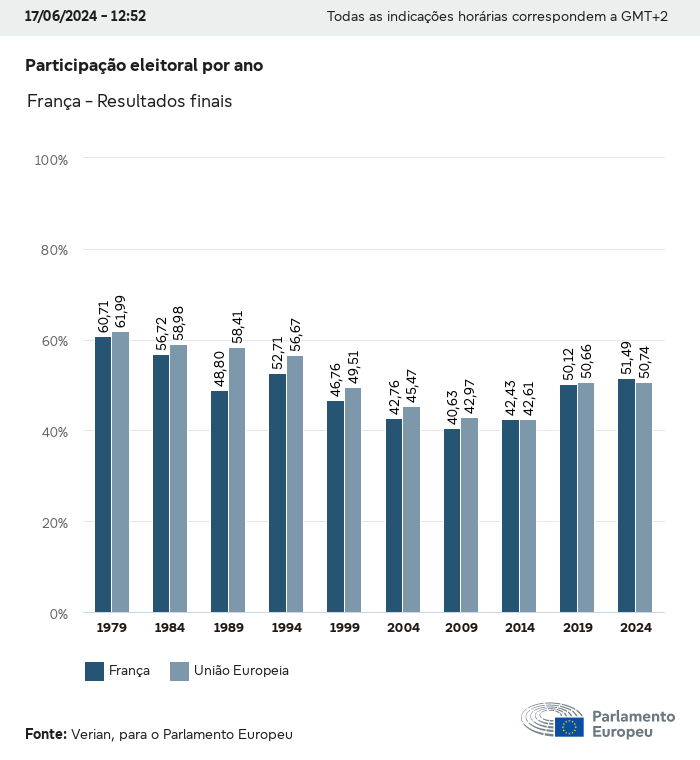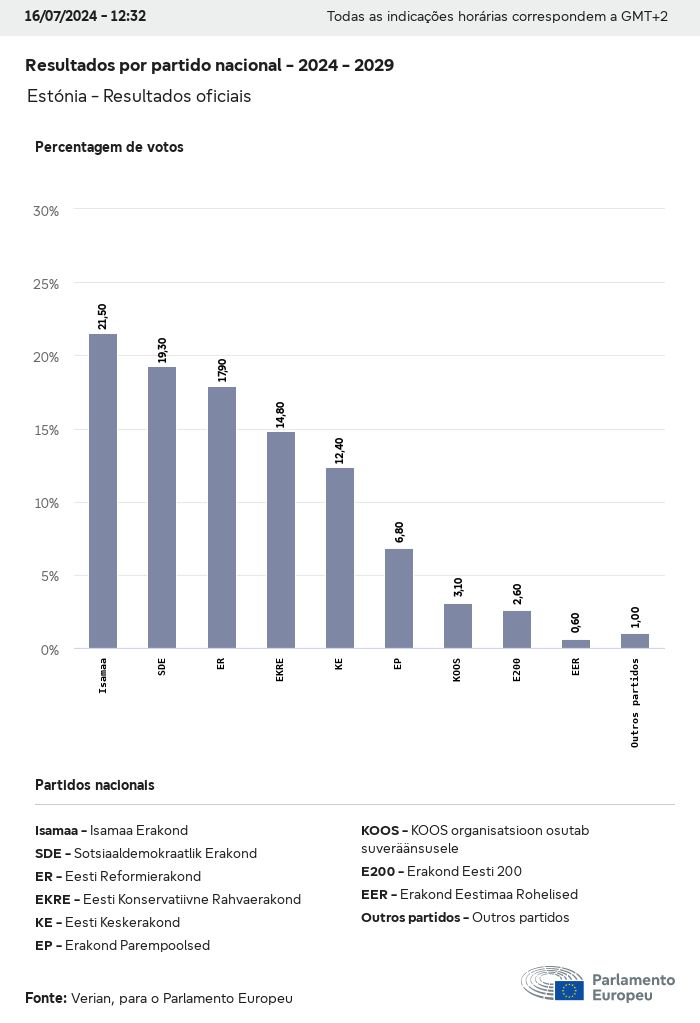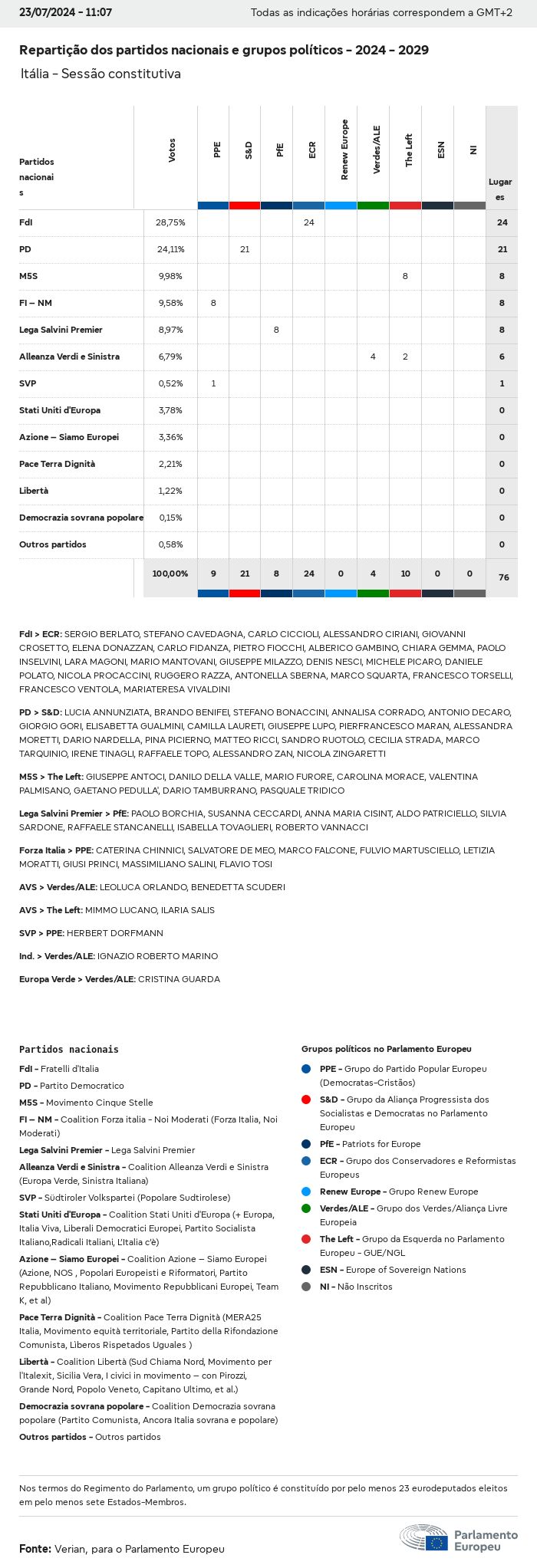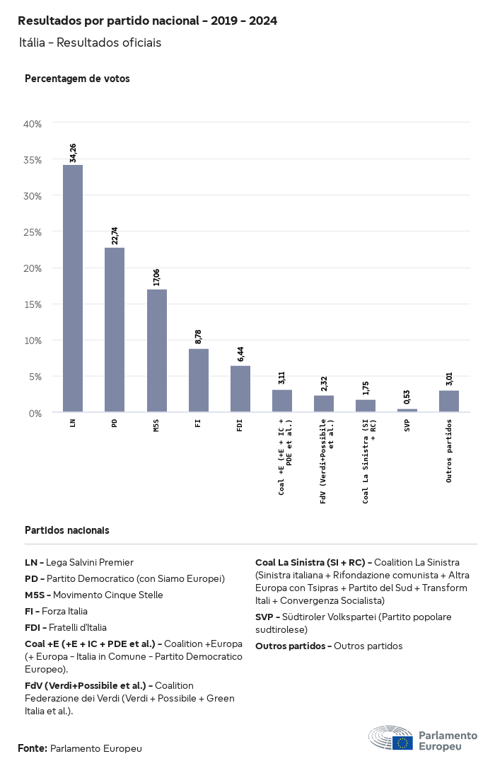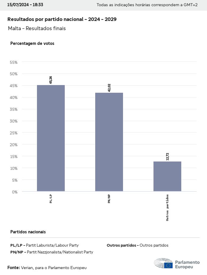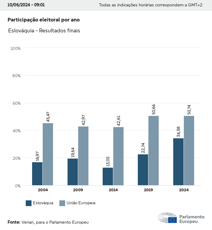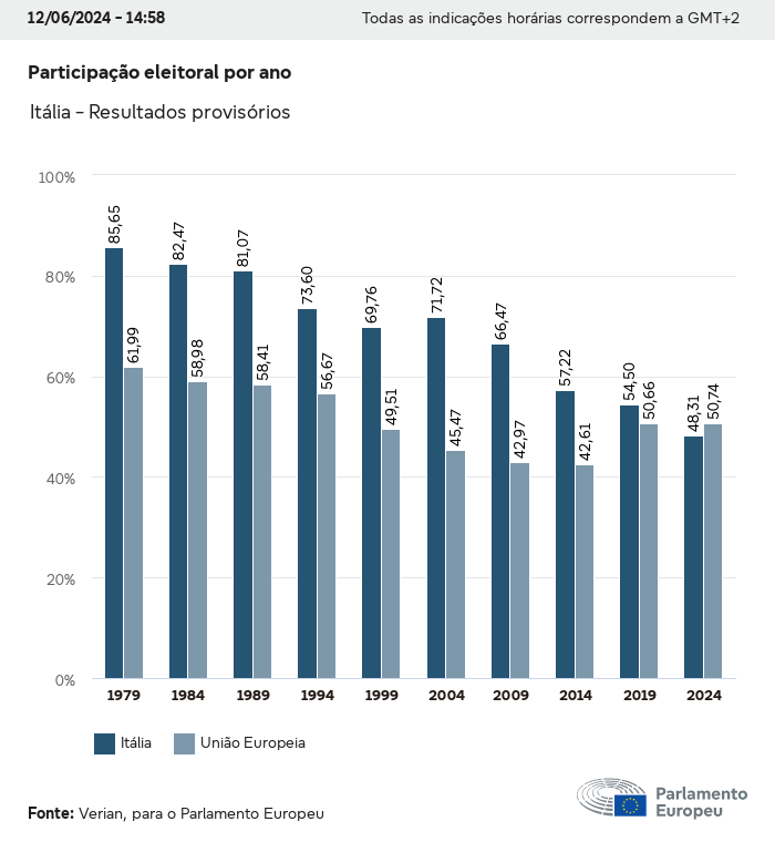 Os dados eleitorais relativos a todas as eleições europeias desde 1979 estão disponíveis abaixo e poderão ser descarregados em vários formatos. Note-se que os ficheiros disponíveis para descarregamento são fornecidos juntamente com uma assinatura digital colocada ao lado dos mesmos. Estas assinaturas podem ser validadas utilizando este certificado, que, por sua vez, pode ser validado utilizando a seguinte cadeia de certificados. Dados das eleições europeias de 2024. json Comum Etiquetas (38 Ko) - Assinatura Participação eleitoral (32 Ko) - Assinatura Dados sobre o equilíbrio de género (7 Ko) - Assinatura Grupos políticos (40 Ko) - Assinatura Partidos nacionais (110 Ko) - Assinatura Dados das eleições europeias (1 Ko) - Assinatura Resultados das eleições be (7 Ko) - Assinatura fbe (4 Ko) - Assinatura gbe (2 Ko) - Assinatura wbe (3 Ko) - Assinatura bg (5 Ko) - Assinatura cz (7 Ko) - Assinatura dk (5 Ko) - Assinatura de (8 Ko) - Assinatura ee (4 Ko) - Assinatura ie (5 Ko) - Assinatura el (5 Ko) - Assinatura es (7 Ko) - Assinatura fr (8 Ko) - Assinatura hr (3 Ko) - Assinatura it (6 Ko) - Assinatura cy (3 Ko) - Assinatura lv (5 Ko) - Assinatura lt (5 Ko) - Assinatura lu (4 Ko) - Assinatura hu (5 Ko) - Assinatura mt (2 Ko) - Assinatura nl (6 Ko) - Assinatura at (3 Ko) - Assinatura pl (7 Ko) - Assinatura pt (5 Ko) - Assinatura ro (5 Ko) - Assinatura si (4 Ko) - Assinatura sk (5 Ko) - Assinatura fi (4 Ko) - Assinatura se (4 Ko) - Assinatura xml Comum Etiquetas (63 Ko) - Assinatura Participação eleitoral (40 Ko) - Assinatura Dados sobre o equilíbrio de género (10 Ko) - Assinatura Grupos políticos (64 Ko) - Assinatura Partidos nacionais (123 Ko) - Assinatura Dados das eleições europeias (2 Ko) - Assinatura Resultados das eleições be (10 Ko) - Assinatura fbe (6 Ko) - Assinatura gbe (3 Ko) - Assinatura wbe (5 Ko) - Assinatura bg (7 Ko) - Assinatura cz (10 Ko) - Assinatura dk (7 Ko) - Assinatura de (11 Ko) - Assinatura ee (6 Ko) - Assinatura ie (7 Ko) - Assinatura el (7 Ko) - Assinatura es (11 Ko) - Assinatura fr (12 Ko) - Assinatura hr (5 Ko) - Assinatura it (9 Ko) - Assinatura cy (5 Ko) - Assinatura lv (7 Ko) - Assinatura lt (7 Ko) - Assinatura lu (6 Ko) - Assinatura hu (7 Ko) - Assinatura mt (3 Ko) - Assinatura nl (9 Ko) - Assinatura at (5 Ko) - Assinatura pl (10 Ko) - Assinatura pt (7 Ko) - Assinatura ro (8 Ko) - Assinatura si (5 Ko) - Assinatura sk (7 Ko) - Assinatura fi (6 Ko) - Assinatura se (6 Ko) - Assinatura csv Participação eleitoral Participação eleitoral a nível da UE (1 Ko) - Assinatura Participação eleitoral por país (5 Ko) - Assinatura Etiquetas (15 Ko) - Assinatura Dados sobre o equilíbrio de género Equilíbrio de género na UE (1 Ko) - Assinatura Equilíbrio de género por país (2 Ko) - Assinatura Grupos políticos (16 Ko) - Assinatura Partidos nacionais (27 Ko) - Assinatura Resultados por partido nacional be (1 Ko) - Assinatura fbe (1 Ko) - Assinatura gbe (1 Ko) - Assinatura wbe (1 Ko) - Assinatura bg (1 Ko) - Assinatura cz (1 Ko) - Assinatura dk (1 Ko) - Assinatura de (1 Ko) - Assinatura ee (1 Ko) - Assinatura ie (1 Ko) - Assinatura el (1 Ko) - Assinatura es (1 Ko) - Assinatura fr (1 Ko) - Assinatura hr (1 Ko) - Assinatura it (1 Ko) - Assinatura cy (1 Ko) - Assinatura lv (1 Ko) - Assinatura lt (1 Ko) - Assinatura lu (1 Ko) - Assinatura hu (1 Ko) - Assinatura mt (1 Ko) - Assinatura nl (1 Ko) - Assinatura at (1 Ko) - Assinatura pl (1 Ko) - Assinatura pt (1 Ko) - Assinatura ro (1 Ko) - Assinatura si (1 Ko) - Assinatura sk (1 Ko) - Assinatura fi (1 Ko) - Assinatura se (1 Ko) - Assinatura Resultados por grupo político EU (1 Ko) - Assinatura be (1 Ko) - Assinatura fbe (1 Ko) - Assinatura gbe (1 Ko) - Assinatura wbe (1 Ko) - Assinatura bg (1 Ko) - Assinatura cz (1 Ko) - Assinatura dk (1 Ko) - Assinatura de (1 Ko) - Assinatura ee (1 Ko) - Assinatura ie (1 Ko) - Assinatura el (1 Ko) - Assinatura es (1 Ko) - Assinatura fr (1 Ko) - Assinatura hr (1 Ko) - Assinatura it (1 Ko) - Assinatura cy (1 Ko) - Assinatura lv (1 Ko) - Assinatura lt (1 Ko) - Assinatura lu (1 Ko) - Assinatura hu (1 Ko) - Assinatura mt (1 Ko) - Assinatura nl (1 Ko) - Assinatura at (1 Ko) - Assinatura pl (1 Ko) - Assinatura pt (1 Ko) - Assinatura ro (1 Ko) - Assinatura si (1 Ko) - Assinatura sk (1 Ko) - Assinatura fi (1 Ko) - Assinatura se (1 Ko) - Assinatura Repartição por partidos nacionais e grupos políticos be (1 Ko) - Assinatura fbe (1 Ko) - Assinatura gbe (1 Ko) - Assinatura wbe (1 Ko) - Assinatura bg (1 Ko) - Assinatura cz (1 Ko) - Assinatura dk (1 Ko) - Assinatura de (1 Ko) - Assinatura ee (1 Ko) - Assinatura ie (1 Ko) - Assinatura el (1 Ko) - Assinatura es (1 Ko) - Assinatura fr (1 Ko) - Assinatura hr (1 Ko) - Assinatura it (1 Ko) - Assinatura cy (1 Ko) - Assinatura lv (1 Ko) - Assinatura lt (1 Ko) - Assinatura lu (1 Ko) - Assinatura hu (1 Ko) - Assinatura mt (1 Ko) - Assinatura nl (1 Ko) - Assinatura at (1 Ko) - Assinatura pl (1 Ko) - Assinatura pt (1 Ko) - Assinatura ro (1 Ko) - Assinatura si (1 Ko) - Assinatura sk (1 Ko) - Assinatura fi (1 Ko) - Assinatura se (1 Ko) - Assinatura jpg Participação eleitoral Participação eleitoral por ano (~30 Ko) Participação eleitoral por país (~140 Ko) Equilíbrio de género entre eurodeputados Equilíbrio de género entre eurodeputados por país Mapa (~130 Ko) Gráfico de barras (~80 Ko) Equilíbrio de género entre eurodeputados por ano (~50 Ko) Resultados das eleições Dados europeus Hemiciclo (~110 Ko) Parlamento Europeu (~250 Ko) Dados nacionais BE Resultados por partido nacional (~90 Ko) Lugares por grupo político (~70 Ko) Repartição por partidos nacionais e grupos políticos (~180 Ko) Equilíbrio de género entre eurodeputados por ano (~50 Ko) Participação eleitoral por ano (~50 Ko) FBE Resultados por partido nacional (~90 Ko) Lugares por grupo político (~70 Ko) Repartição por partidos nacionais e grupos políticos (~180 Ko) GBE Resultados por partido nacional (~90 Ko) Lugares por grupo político (~70 Ko) Repartiç