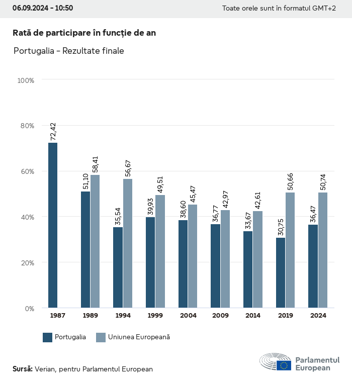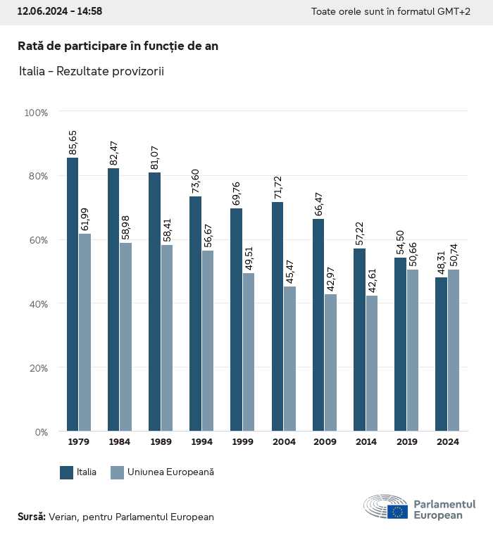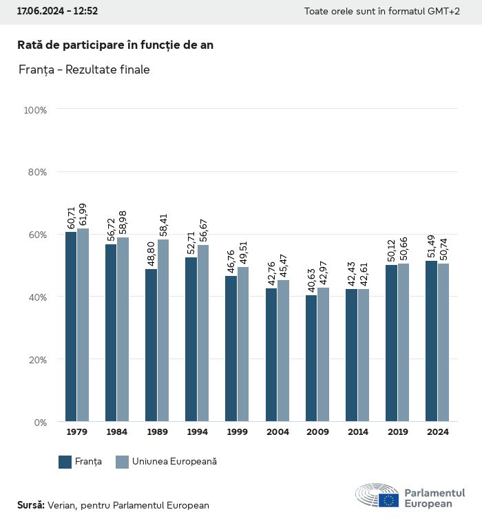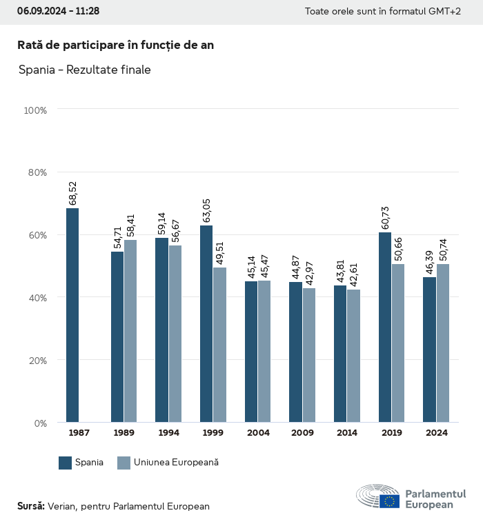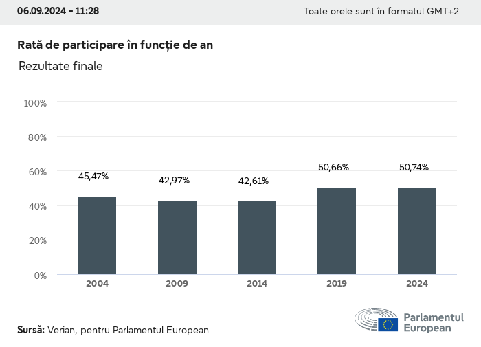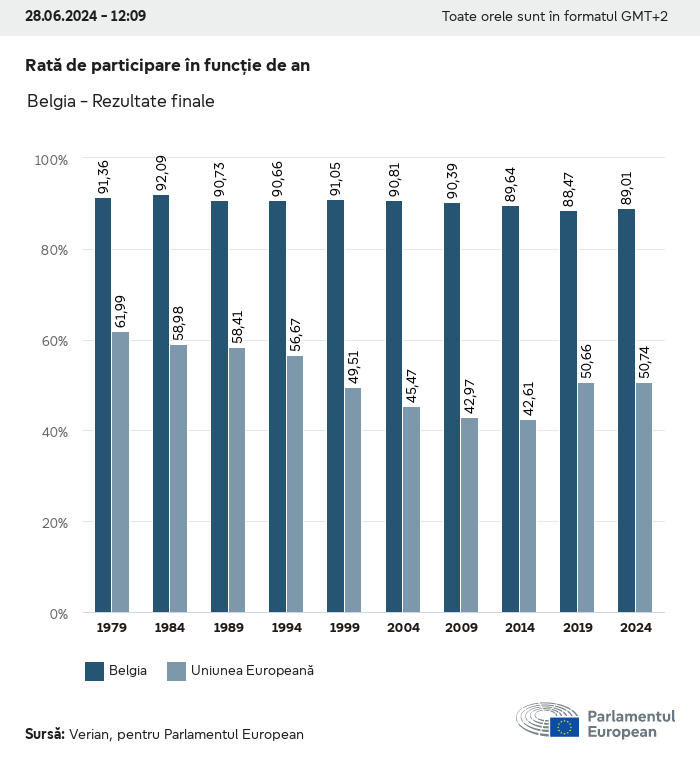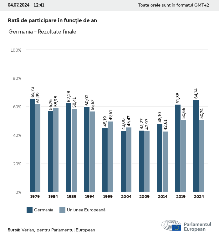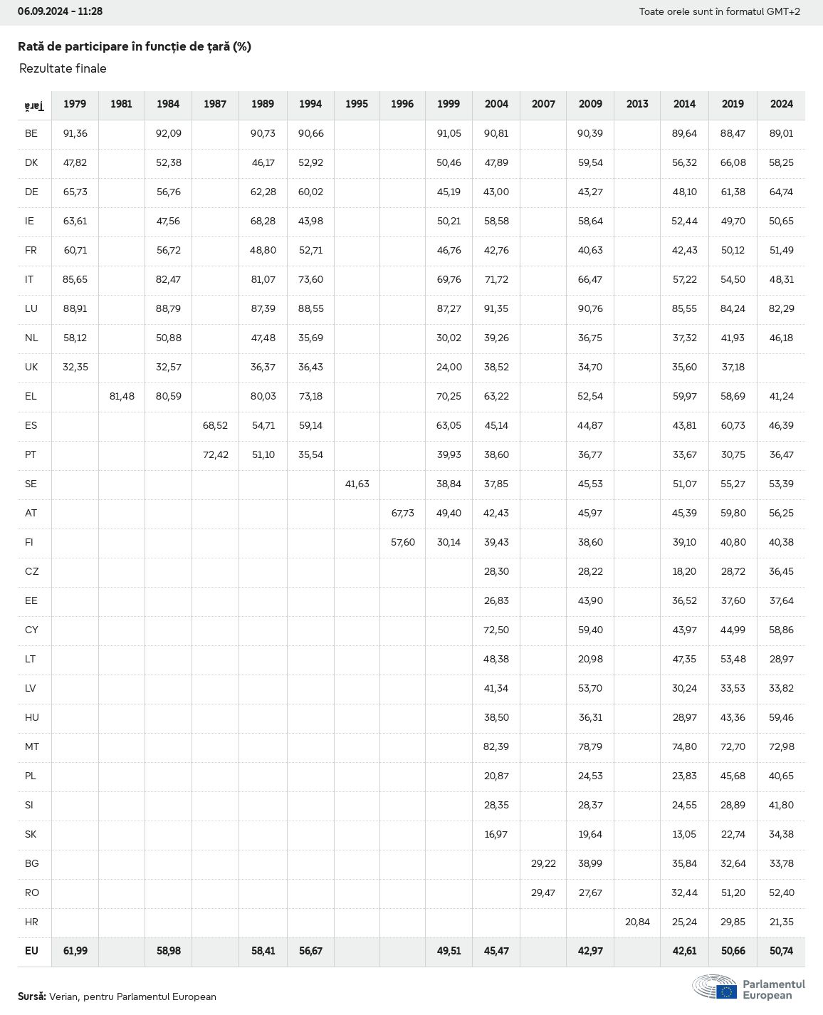 Datele electorale pentru toate alegerile europene începând cu 1979 sunt disponibile pentru descărcare mai jos în diverse formate. Rețineți că fișierele disponibile pentru descărcare sunt furnizate împreună cu o semnătură digitală. Aceste semnături pot fi validate utilizând acest certificat, care la rândul său poate fi validat utilizând următorul lanț de certificate. Date electorale europene 2024. json Obișnuit Etichete (38 Ko) - Semnătura Rată de participare (32 Ko) - Semnătura Date despre echilibrul de gen (7 Ko) - Semnătura Grupuri politice (40 Ko) - Semnătura Partide naționale (110 Ko) - Semnătura Date electorale europene (1 Ko) - Semnătura Rezultate electorale be (7 Ko) - Semnătura fbe (4 Ko) - Semnătura gbe (2 Ko) - Semnătura wbe (3 Ko) - Semnătura bg (5 Ko) - Semnătura cz (7 Ko) - Semnătura dk (5 Ko) - Semnătura de (8 Ko) - Semnătura ee (4 Ko) - Semnătura ie (5 Ko) - Semnătura el (5 Ko) - Semnătura es (7 Ko) - Semnătura fr (8 Ko) - Semnătura hr (3 Ko) - Semnătura it (6 Ko) - Semnătura cy (3 Ko) - Semnătura lv (5 Ko) - Semnătura lt (5 Ko) - Semnătura lu (4 Ko) - Semnătura hu (5 Ko) - Semnătura mt (2 Ko) - Semnătura nl (6 Ko) - Semnătura at (3 Ko) - Semnătura pl (7 Ko) - Semnătura pt (5 Ko) - Semnătura ro (5 Ko) - Semnătura si (4 Ko) - Semnătura sk (5 Ko) - Semnătura fi (4 Ko) - Semnătura se (4 Ko) - Semnătura xml Obișnuit Etichete (63 Ko) - Semnătura Rată de participare (40 Ko) - Semnătura Date despre echilibrul de gen (10 Ko) - Semnătura Grupuri politice (64 Ko) - Semnătura Partide naționale (123 Ko) - Semnătura Date electorale europene (2 Ko) - Semnătura Rezultate electorale be (10 Ko) - Semnătura fbe (6 Ko) - Semnătura gbe (3 Ko) - Semnătura wbe (5 Ko) - Semnătura bg (7 Ko) - Semnătura cz (10 Ko) - Semnătura dk (7 Ko) - Semnătura de (11 Ko) - Semnătura ee (6 Ko) - Semnătura ie (7 Ko) - Semnătura el (7 Ko) - Semnătura es (11 Ko) - Semnătura fr (12 Ko) - Semnătura hr (5 Ko) - Semnătura it (9 Ko) - Semnătura cy (5 Ko) - Semnătura lv (7 Ko) - Semnătura lt (7 Ko) - Semnătura lu (6 Ko) - Semnătura hu (7 Ko) - Semnătura mt (3 Ko) - Semnătura nl (9 Ko) - Semnătura at (5 Ko) - Semnătura pl (10 Ko) - Semnătura pt (7 Ko) - Semnătura ro (8 Ko) - Semnătura si (5 Ko) - Semnătura sk (7 Ko) - Semnătura fi (6 Ko) - Semnătura se (6 Ko) - Semnătura csv Rată de participare Rată de participare în UE (1 Ko) - Semnătura Rată de participare în funcție de țară (5 Ko) - Semnătura Etichete (15 Ko) - Semnătura Date despre echilibrul de gen Echilibrul de gen în UE (1 Ko) - Semnătura Echilibrul de gen în funcție de țară (2 Ko) - Semnătura Grupuri politice (16 Ko) - Semnătura Partide naționale (27 Ko) - Semnătura Rezultate pe partid național be (1 Ko) - Semnătura fbe (1 Ko) - Semnătura gbe (1 Ko) - Semnătura wbe (1 Ko) - Semnătura bg (1 Ko) - Semnătura cz (1 Ko) - Semnătura dk (1 Ko) - Semnătura de (1 Ko) - Semnătura ee (1 Ko) - Semnătura ie (1 Ko) - Semnătura el (1 Ko) - Semnătura es (1 Ko) - Semnătura fr (1 Ko) - Semnătura hr (1 Ko) - Semnătura it (1 Ko) - Semnătura cy (1 Ko) - Semnătura lv (1 Ko) - Semnătura lt (1 Ko) - Semnătura lu (1 Ko) - Semnătura hu (1 Ko) - Semnătura mt (1 Ko) - Semnătura nl (1 Ko) - Semnătura at (1 Ko) - Semnătura pl (1 Ko) - Semnătura pt (1 Ko) - Semnătura ro (1 Ko) - Semnătura si (1 Ko) - Semnătura sk (1 Ko) - Semnătura fi (1 Ko) - Semnătura se (1 Ko) - Semnătura Rezultate în funcție de grupul politic EU (1 Ko) - Semnătura be (1 Ko) - Semnătura fbe (1 Ko) - Semnătura gbe (1 Ko) - Semnătura wbe (1 Ko) - Semnătura bg (1 Ko) - Semnătura cz (1 Ko) - Semnătura dk (1 Ko) - Semnătura de (1 Ko) - Semnătura ee (1 Ko) - Semnătura ie (1 Ko) - Semnătura el (1 Ko) - Semnătura es (1 Ko) - Semnătura fr (1 Ko) - Semnătura hr (1 Ko) - Semnătura it (1 Ko) - Semnătura cy (1 Ko) - Semnătura lv (1 Ko) - Semnătura lt (1 Ko) - Semnătura lu (1 Ko) - Semnătura hu (1 Ko) - Semnătura mt (1 Ko) - Semnătura nl (1 Ko) - Semnătura at (1 Ko) - Semnătura pl (1 Ko) - Semnătura pt (1 Ko) - Semnătura ro (1 Ko) - Semnătura si (1 Ko) - Semnătura sk (1 Ko) - Semnătura fi (1 Ko) - Semnătura se (1 Ko) - Semnătura Împărțire în funcție de partide naționale și grupuri politice be (1 Ko) - Semnătura fbe (1 Ko) - Semnătura gbe (1 Ko) - Semnătura wbe (1 Ko) - Semnătura bg (1 Ko) - Semnătura cz (1 Ko) - Semnătura dk (1 Ko) - Semnătura de (1 Ko) - Semnătura ee (1 Ko) - Semnătura ie (1 Ko) - Semnătura el (1 Ko) - Semnătura es (1 Ko) - Semnătura fr (1 Ko) - Semnătura hr (1 Ko) - Semnătura it (1 Ko) - Semnătura cy (1 Ko) - Semnătura lv (1 Ko) - Semnătura lt (1 Ko) - Semnătura lu (1 Ko) - Semnătura hu (1 Ko) - Semnătura mt (1 Ko) - Semnătura nl (1 Ko) - Semnătura at (1 Ko) - Semnătura pl (1 Ko) - Semnătura pt (1 Ko) - Semnătura ro (1 Ko) - Semnătura si (1 Ko) - Semnătura sk (1 Ko) - Semnătura fi (1 Ko) - Semnătura se (1 Ko) - Semnătura jpg Rată de participare Rată de participare în funcție de an (~30 Ko) Rată de participare în funcție de țară (~140 Ko) Echilibrul de gen al deputaților europeni Echilibrul de gen al deputaților europeni în funcție de țară Hartă (~130 Ko) Diagramă cu bare (~80 Ko) Echilibrul de gen al deputaților europeni în funcție de an (~50 Ko) Rezultate electorale Date europene Hemiciclu (~110 Ko) Parlamentul European (~250 Ko) Date naționale BE Rezultate pe partid național (~90 Ko) Locuri în funcție de grupul politic (~70 Ko) Împărțire în funcție de partide naționale și grupuri politice (~180 Ko) Echilibrul de gen al deputaților europeni în funcție de an (~50 Ko) Rată de participare în funcție de an (~50 Ko) FBE Rezultate pe partid național (~90 Ko) Locuri în funcție de grupul politic (~70 Ko) Împărțire în funcție de partide naționale și grupuri politice (~180 Ko) GBE Rezultate pe partid național (~90 Ko) Locuri în funcție de grupul politic (~70 Ko)
